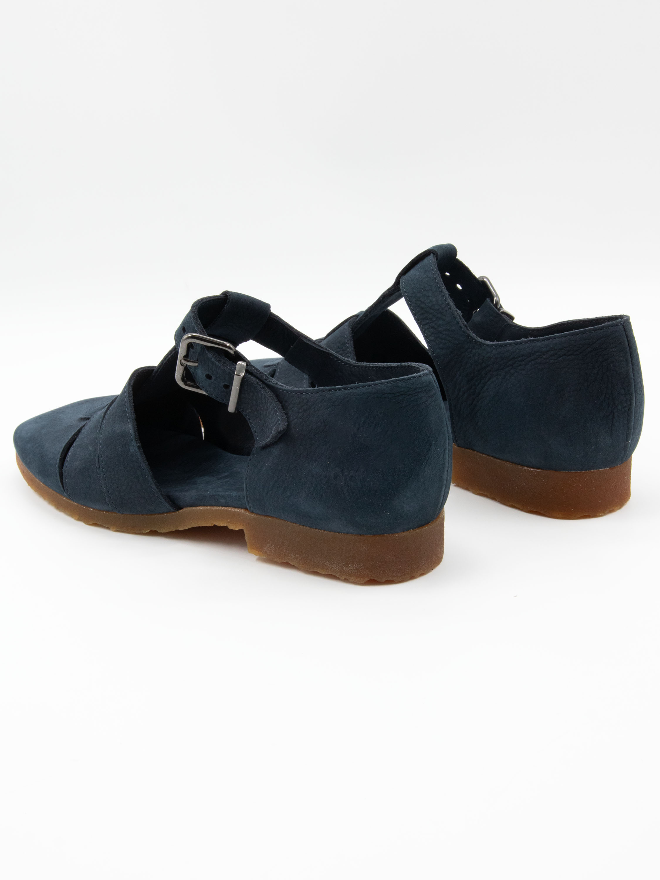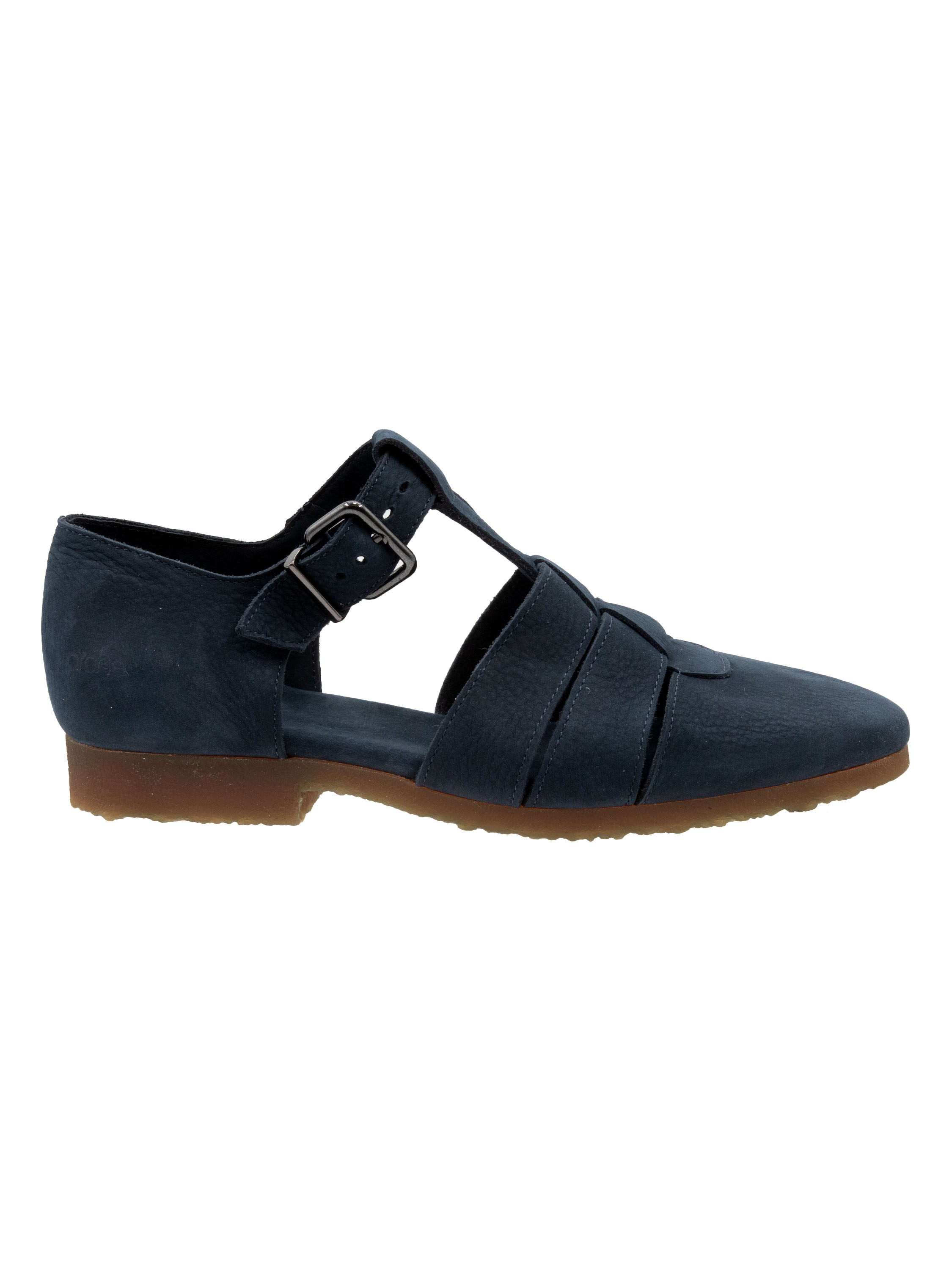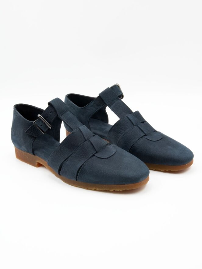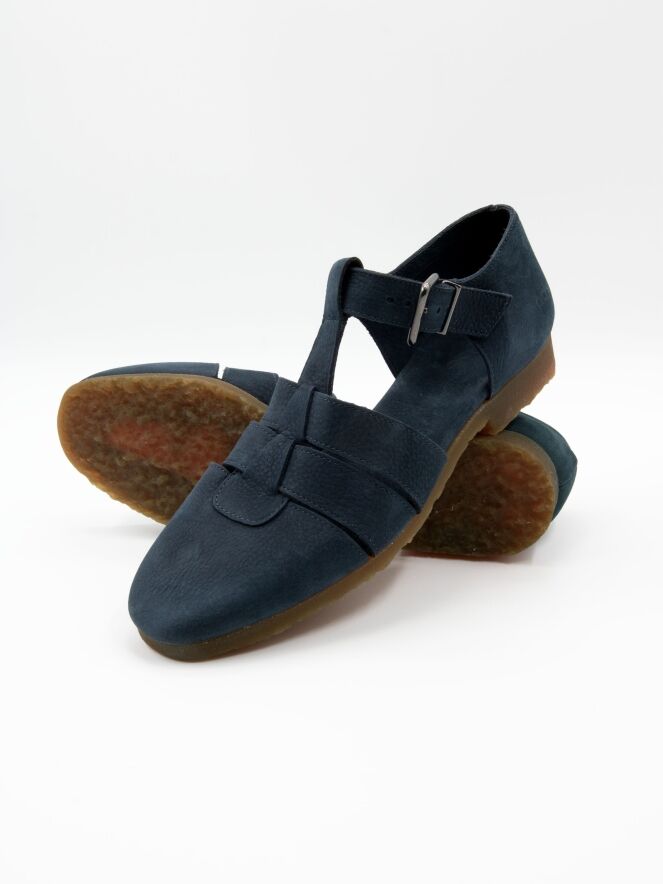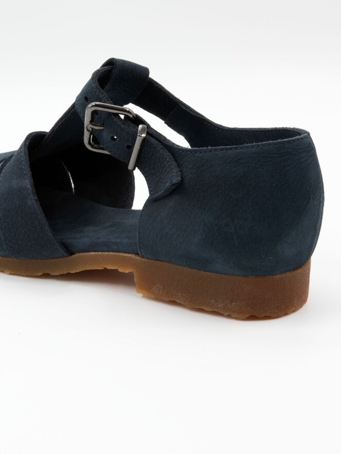 Sandal by Arche in an elegant navy blue shade. Featuring a closed toe and heel, it offers a secure and comfortable fit. The strap across the forefoot is adjustable with a buckle for a precise fit. The honey-toned sole creates a warm contrast and adds a refined touch to the design.