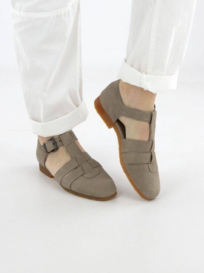Sandal by Arche in an elegant light grey shade. Designed with a closed toe and heel, it offers a refined and comfortable fit. The adjustable buckle fastening across the forefoot ensures a personalized fit. A honey-colored sole adds a warm and natural touch to the design.