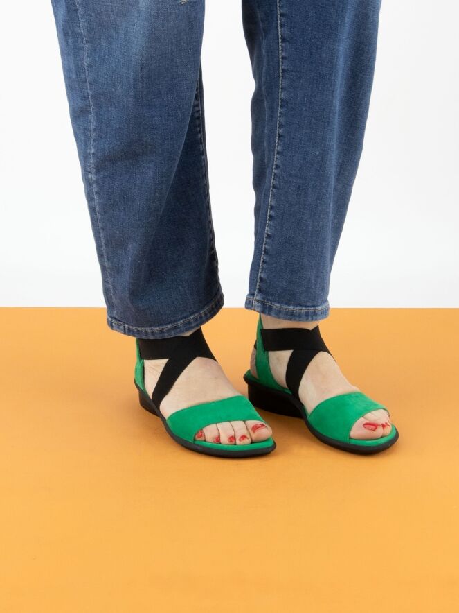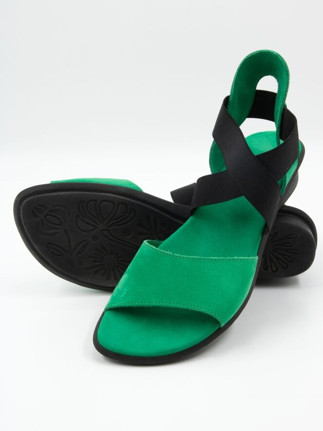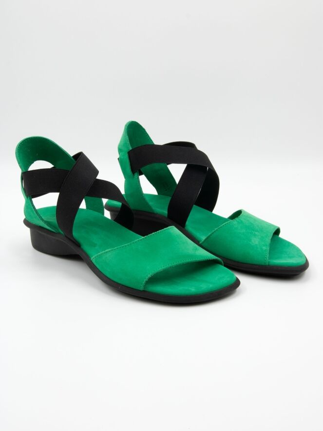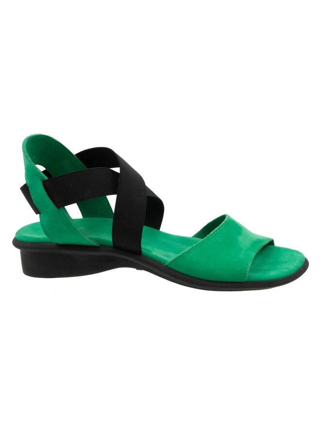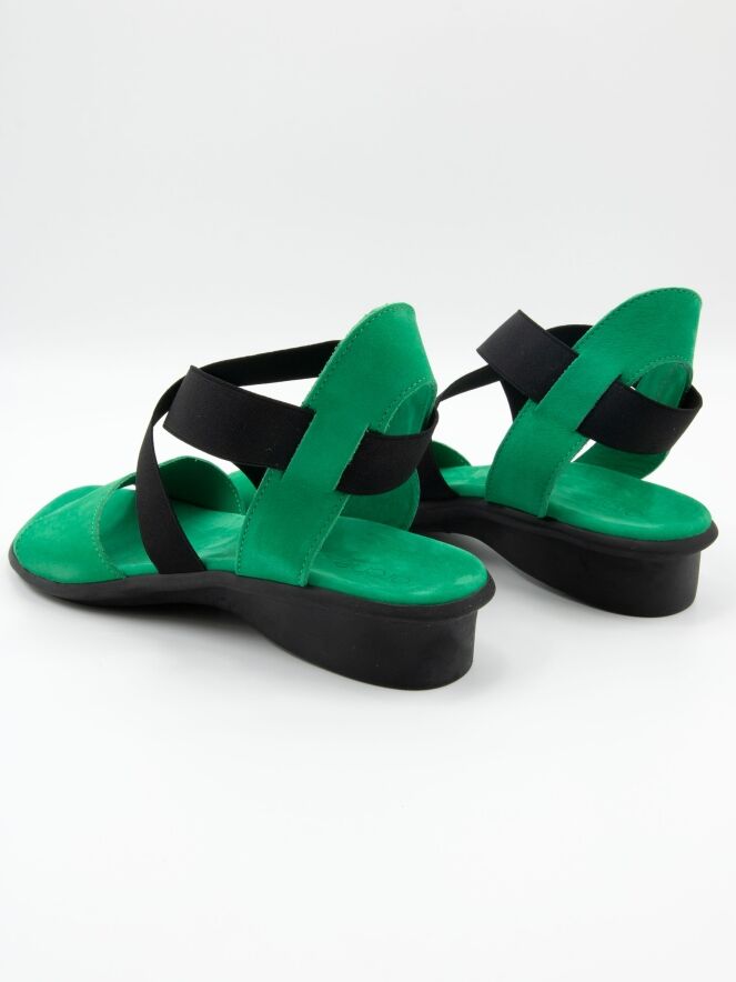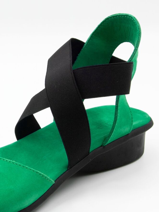 An open sandal by Arche in green. A strap runs across the forefoot. From the back of the heel, a crossed black elastic band extends to the sides of the sandal.