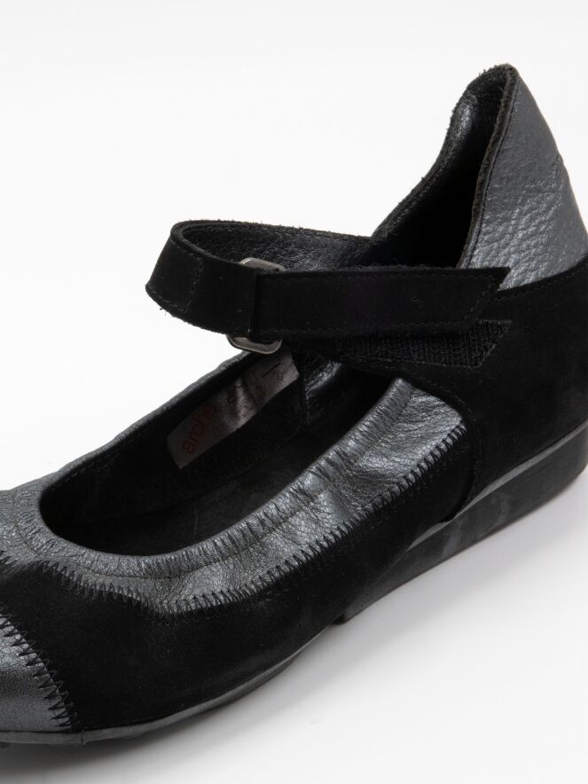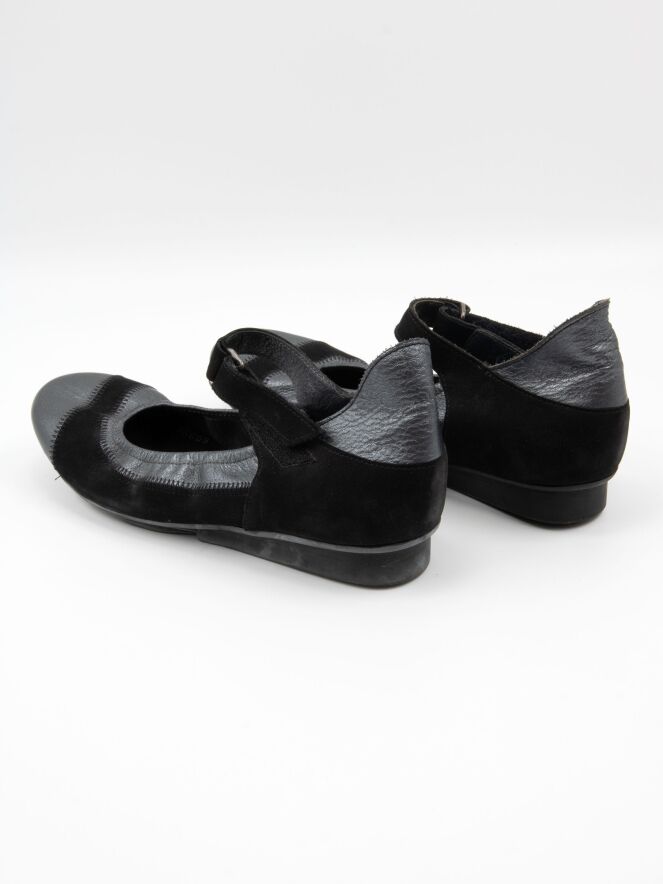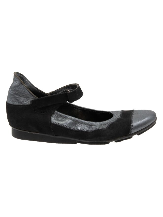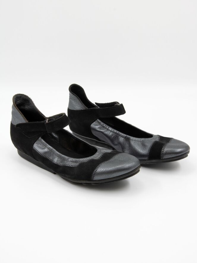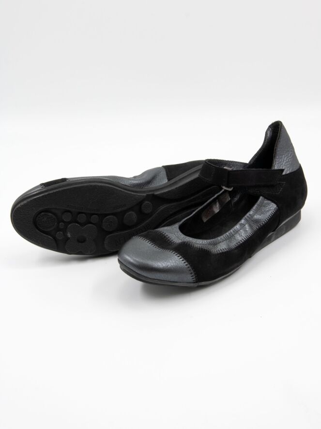 A ballerina shoe by Arche in metallic anthracite. A black nubuck suede trim runs across the forefoot and along the sides. An adjustable strap with Velcro crosses the forefoot.