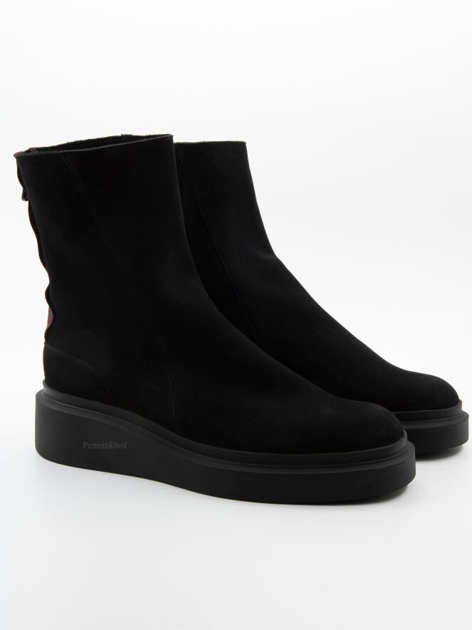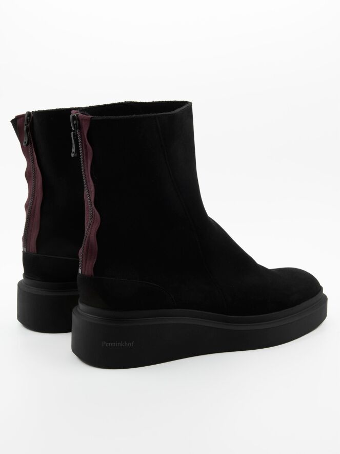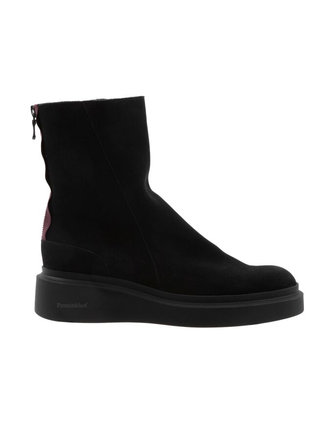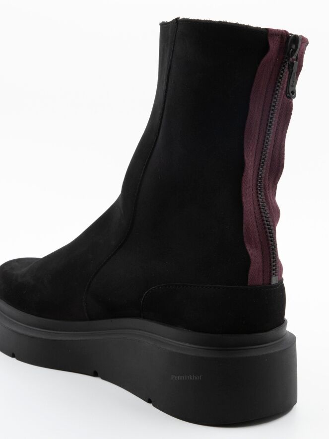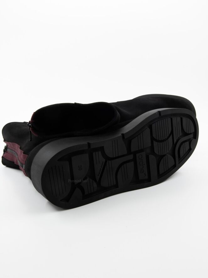 A short ankle boot from Arche in the colour black. The boot has a round toe and on the heel is a zip with aubergine-coloured piping on both sides. This boot is unlined on the inside.