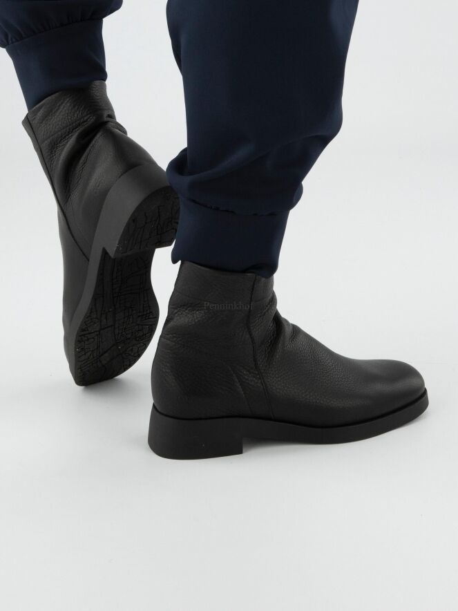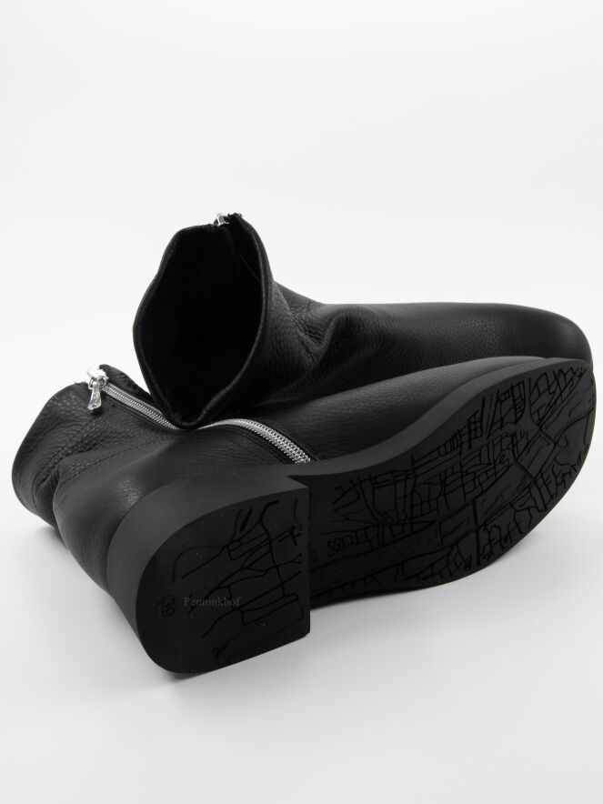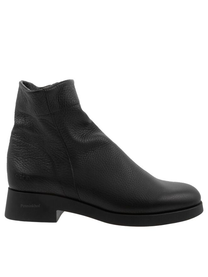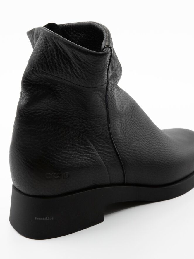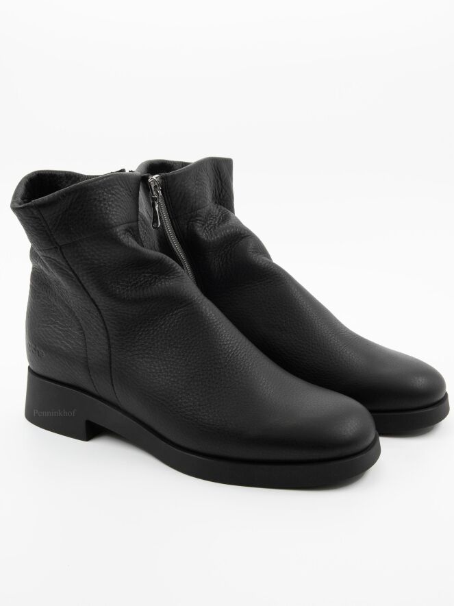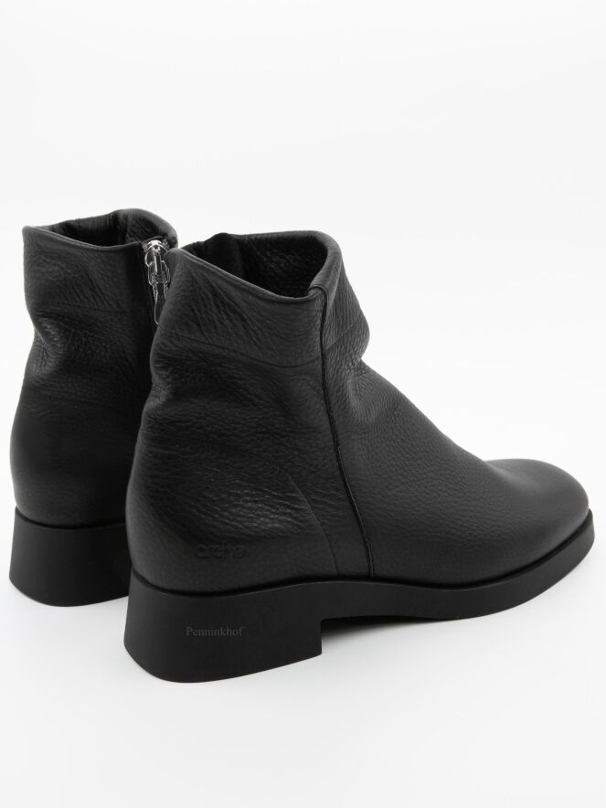 A short ankle boot from Arche in the colour black. The boot has a round toe and on the outside of the shaft is a silver-tone zip. The inside is unlined.
