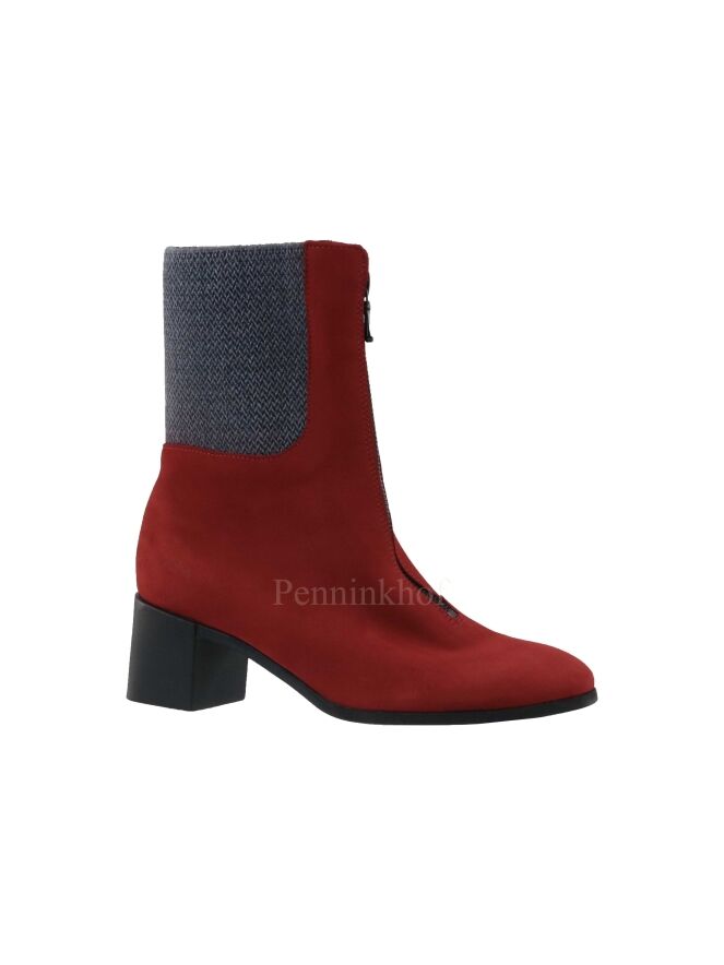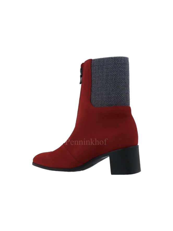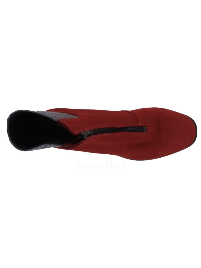An ankle boot from Arche in the color red. From the forefoot to the top of the shaft is a black zipper. The back of the shaft is in a mottled elastic gray fabric. The inside is unlined.