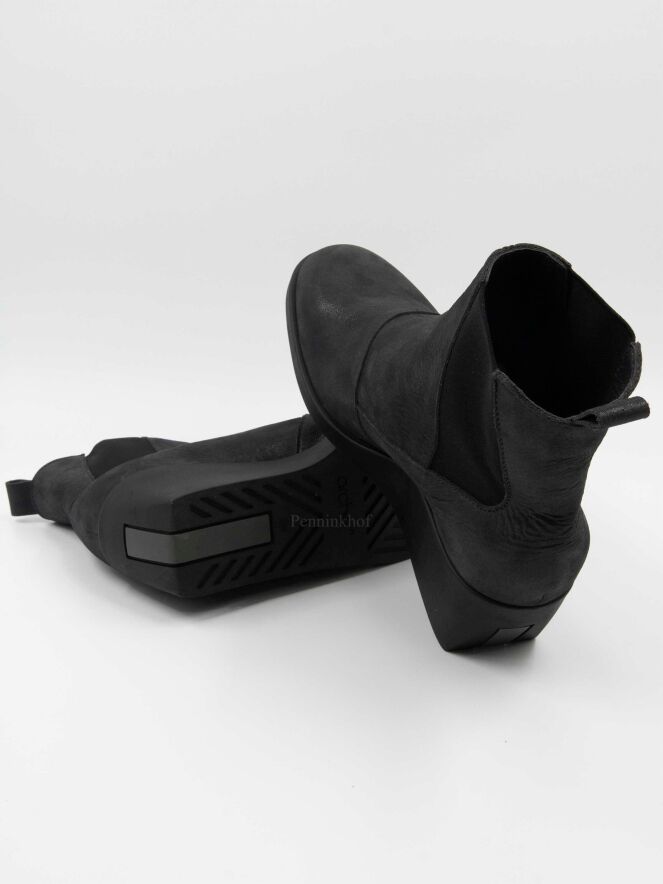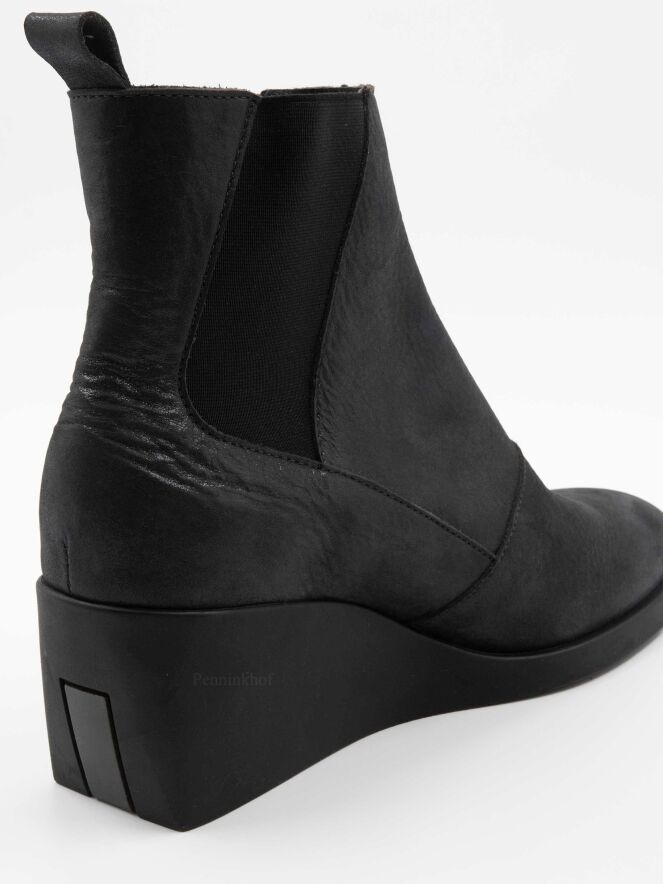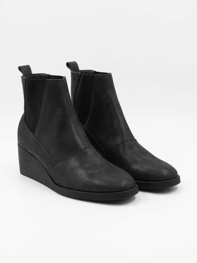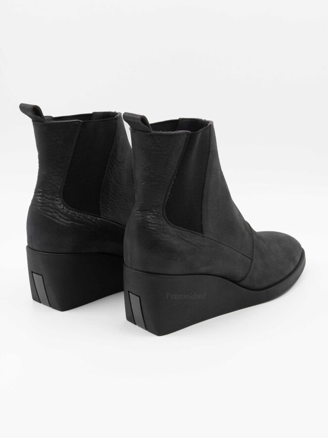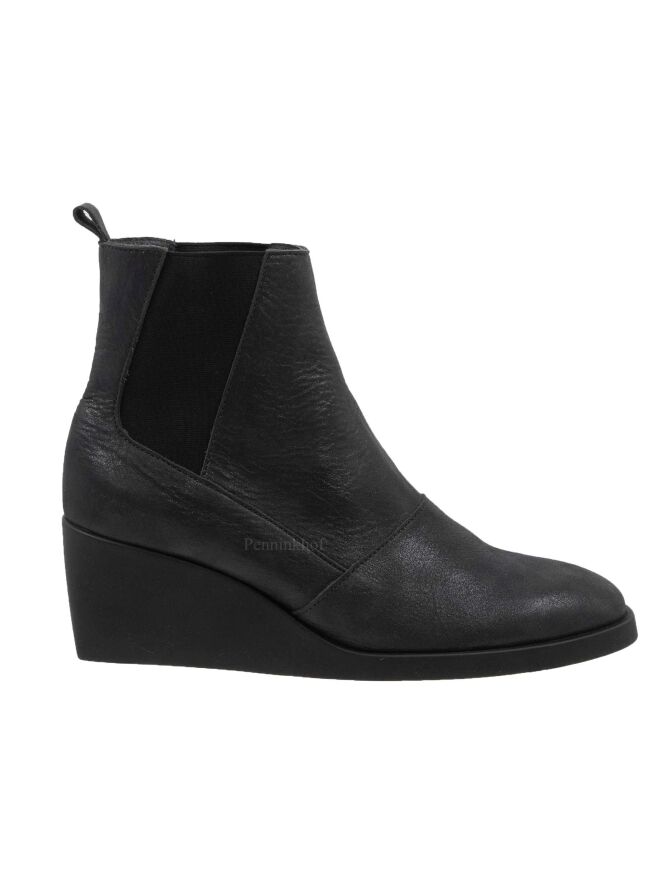Short bootie from Arche on a wedge heel in black. The boot has some decorative stitching and elasticated pieces are inserted at the sides of the shaft. The inside is unlined.