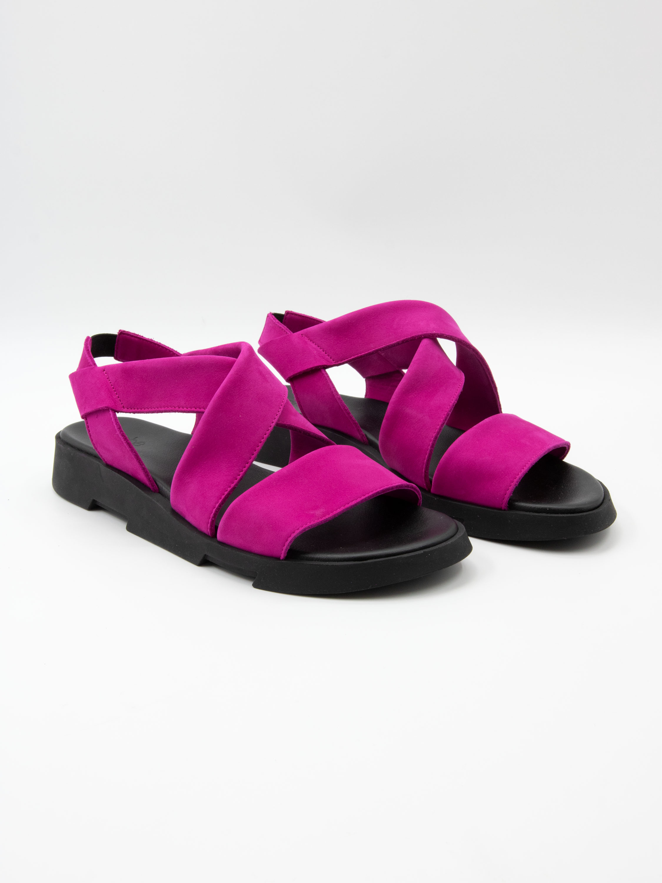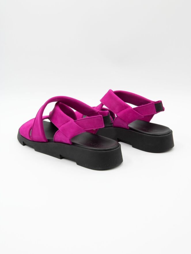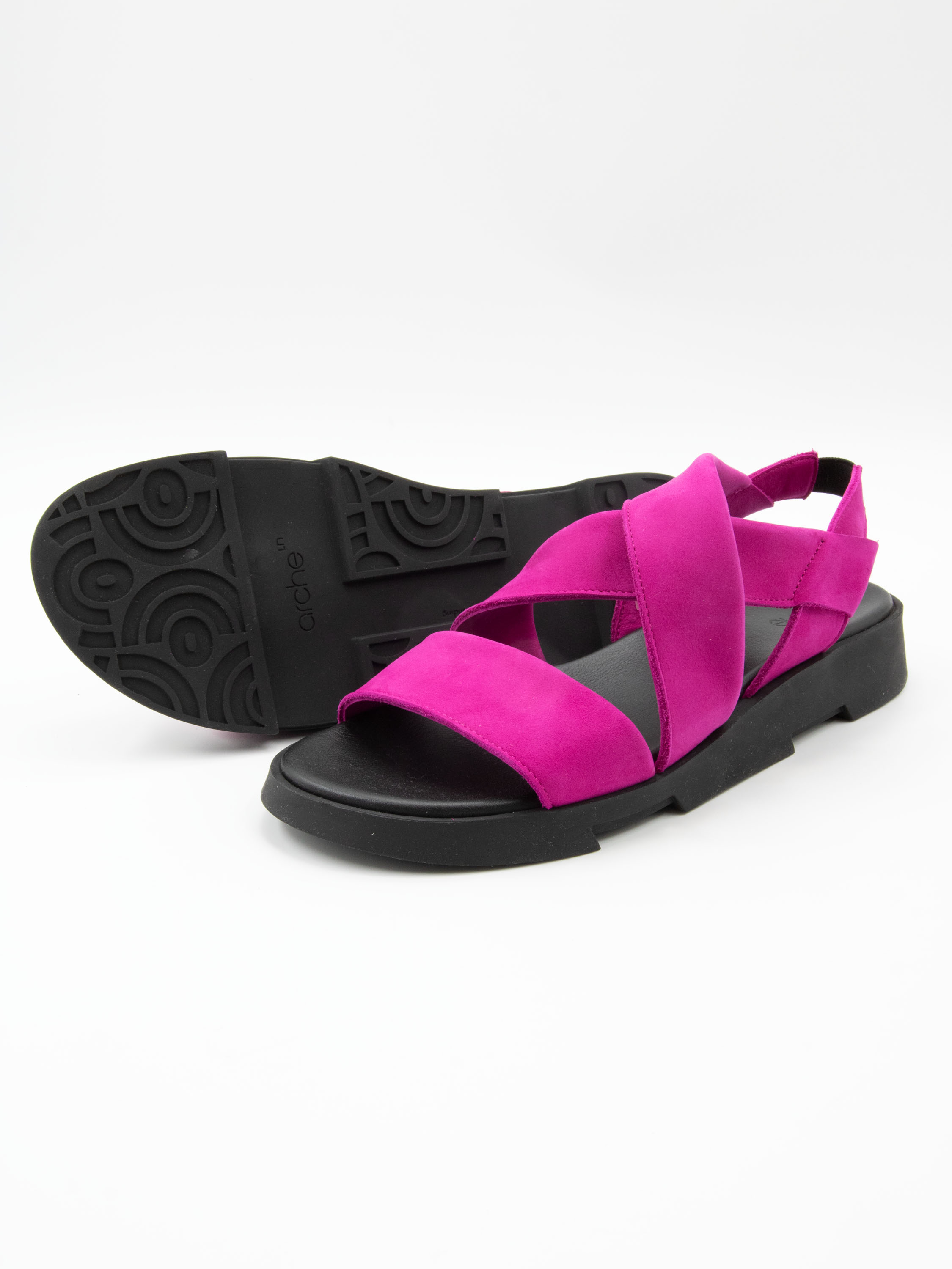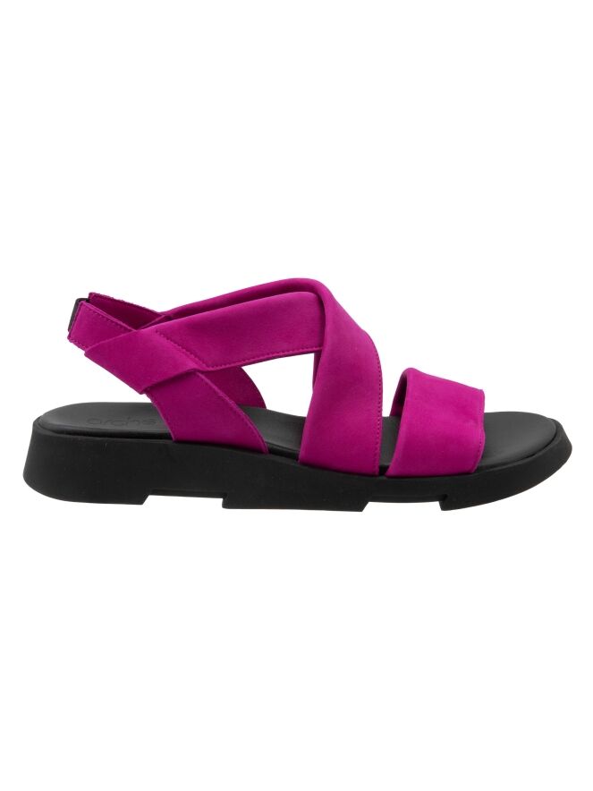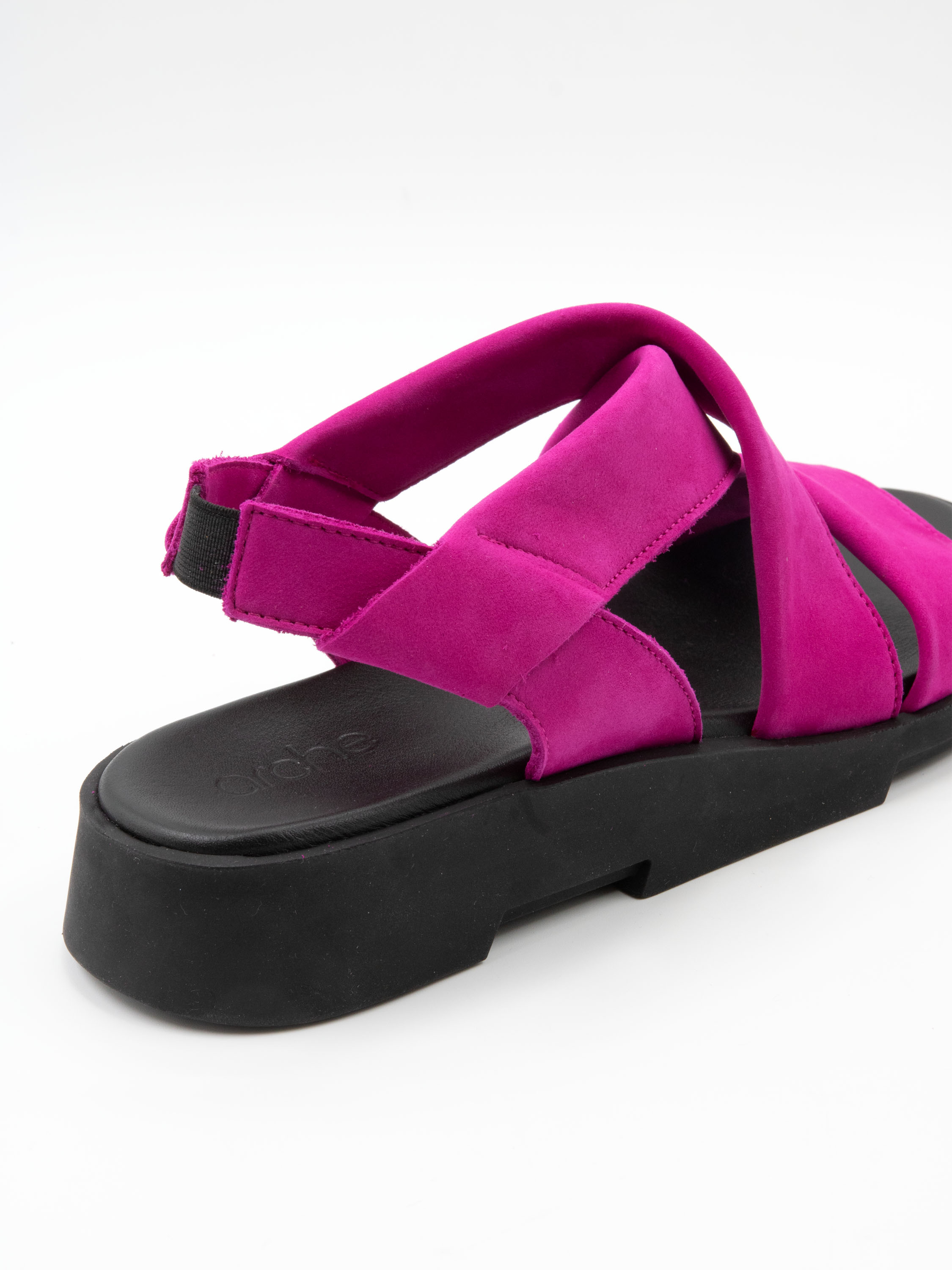 An Arche sandal in a vibrant fuchsia shade. A wide strap runs across the forefoot, complemented by a crossed strap over the instep for a secure and elegant fit. An elastic heel strap ensures ease and comfort when putting on the sandal.