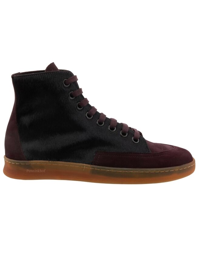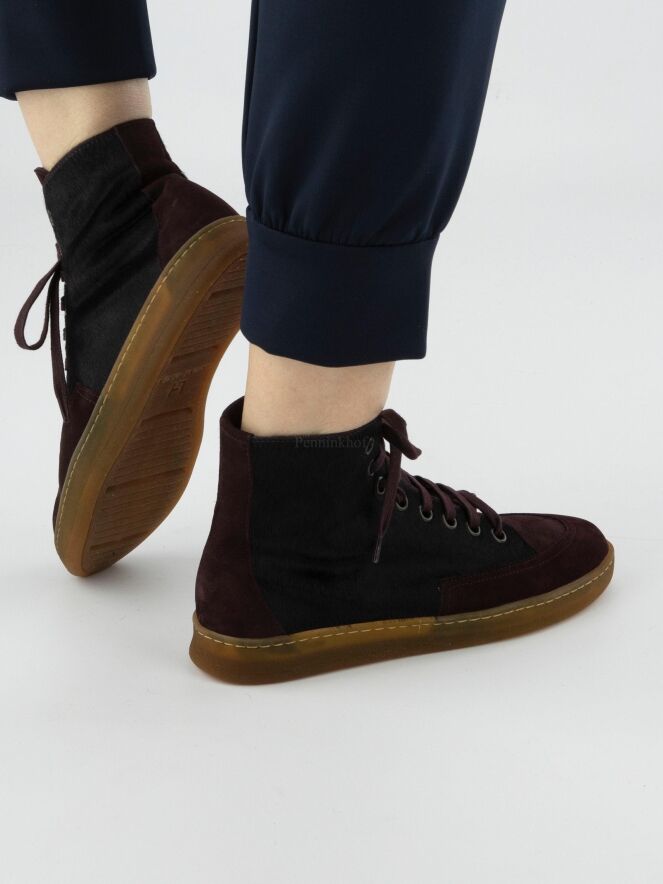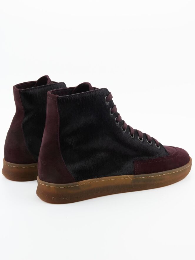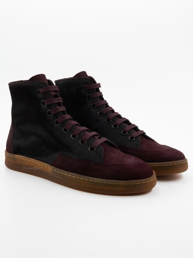 A luxury high sneaker from Arche featuring black and aubergine colours. The forefoot is in a nubuck suede and the shaft is in a black pony leather. The interior is unlined.