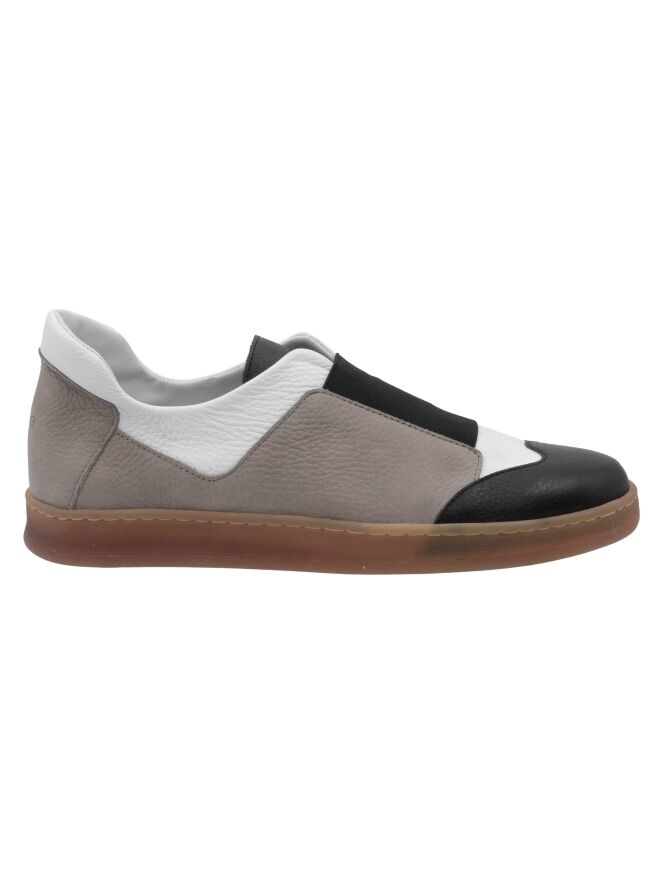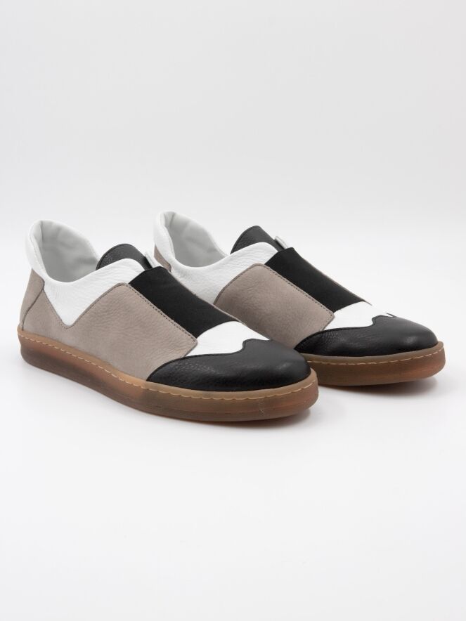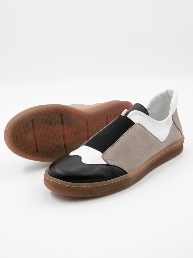 A slip-on shoe by Arche in three different leather colors. Along the shaft is cream-colored leather; along the sides and on the heel is taupe-colored leather, and on the forefoot is black leather. There is a wide black elastic band on the forefoot. The flat sole is in a natural color. The inside is lined with leather.