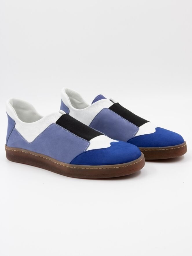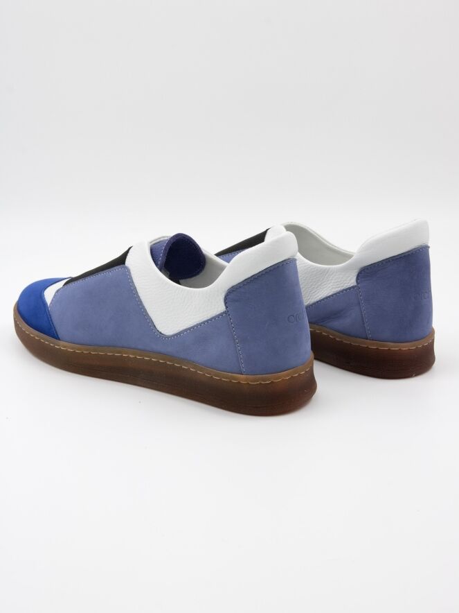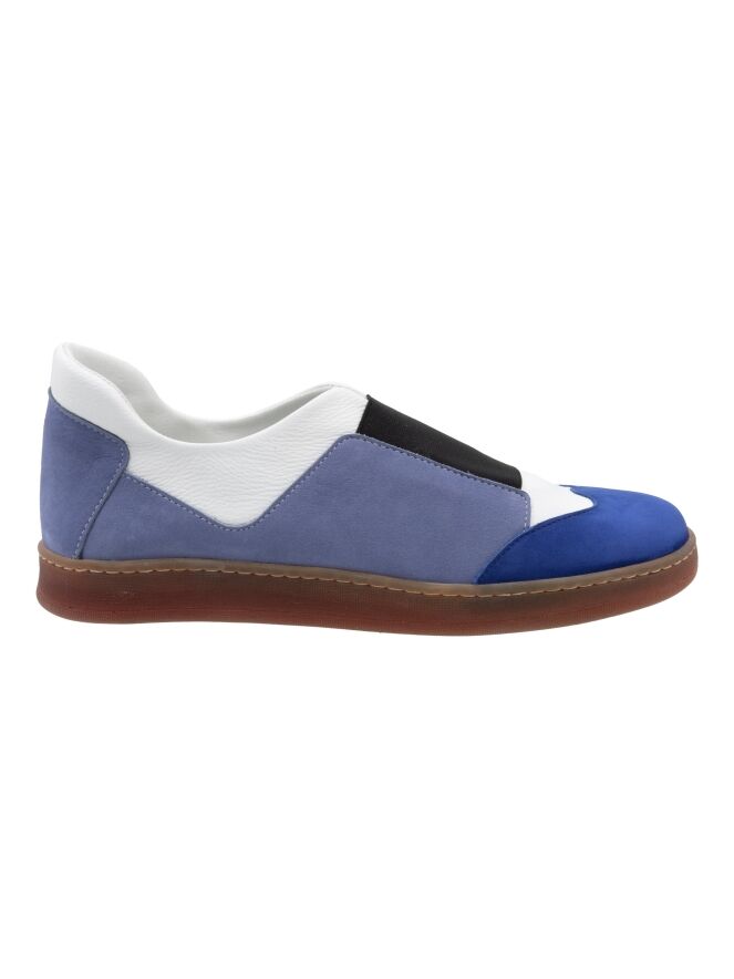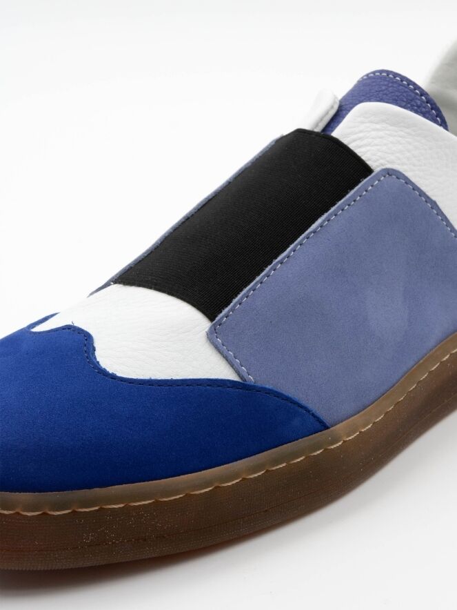 A slip-on shoe by Arche in three different colors of nubuck suede and leather. Along the shaft is cream-colored leather; along the sides and on the heel is lilac-colored nubuck, and on the forefoot is cobalt blue nubuck suede. There is a wide black elastic band on the forefoot. The flat sole is in a natural color. The inside is lined with leather.
