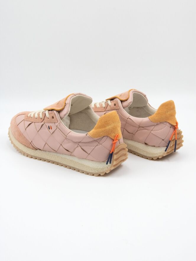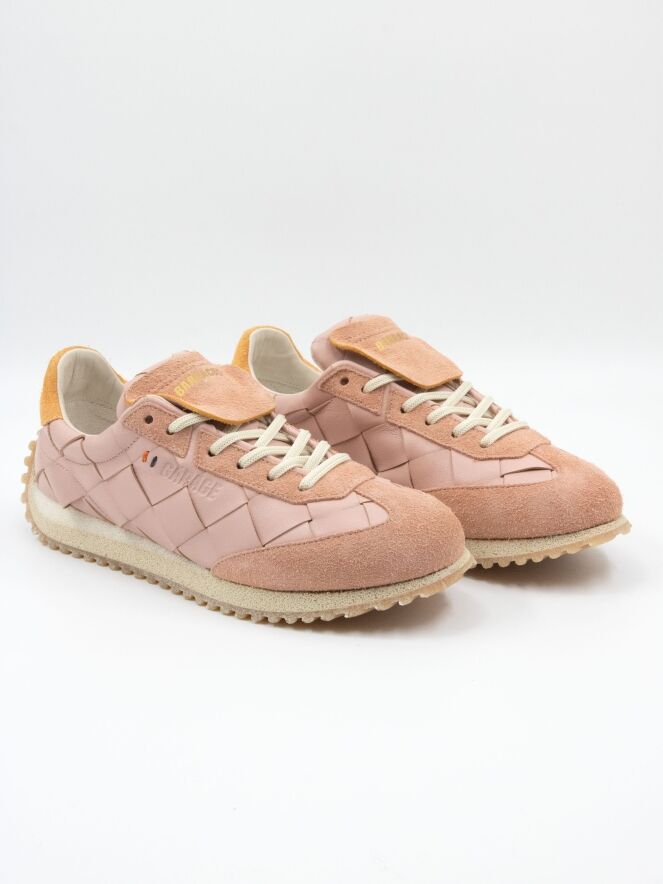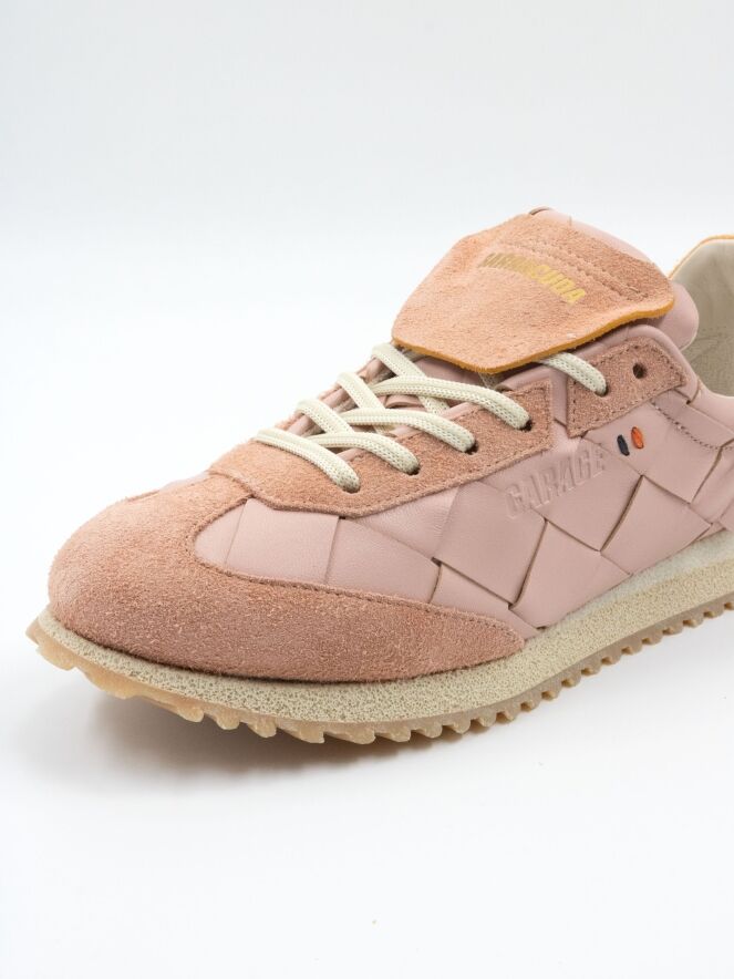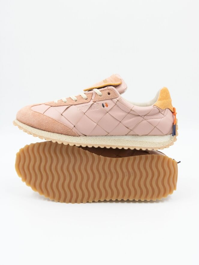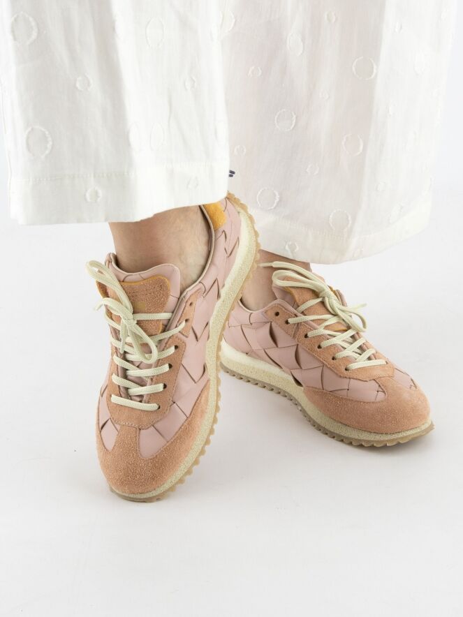A sneaker from Barracuda in lilac. The leather features a woven texture. Suede is applied along the toe and the laces. On the heel, there is a camel-colored suede detail. The sole is ivory with beige.