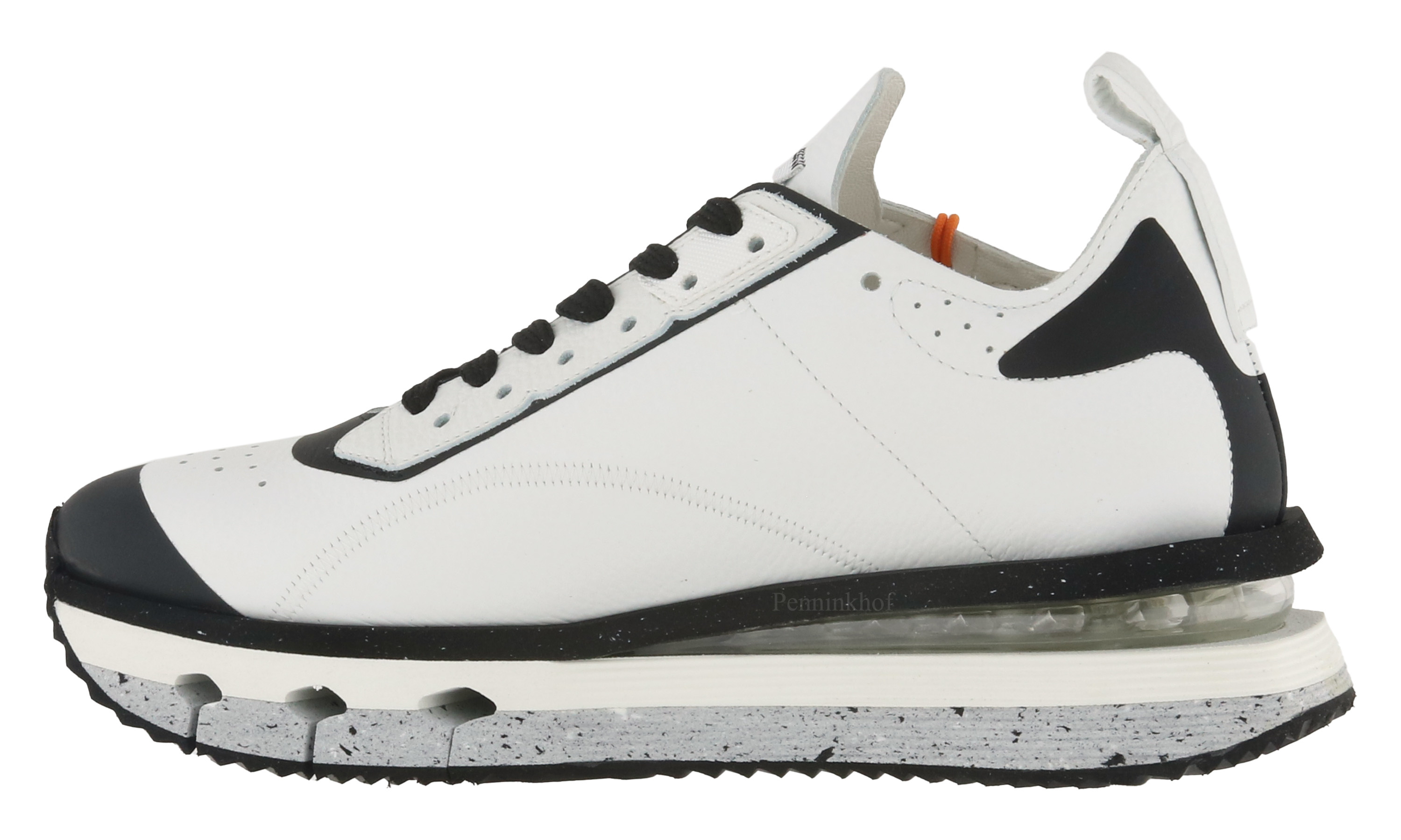 A sneaker from Barracuda in the color white. The sneaker has a sporty excellent recycled sole with a speckled pattern in the bottom layer and a transparent layer. The leather is perforated in several places on the forefoot and on the sides. The inside is lined with leather.