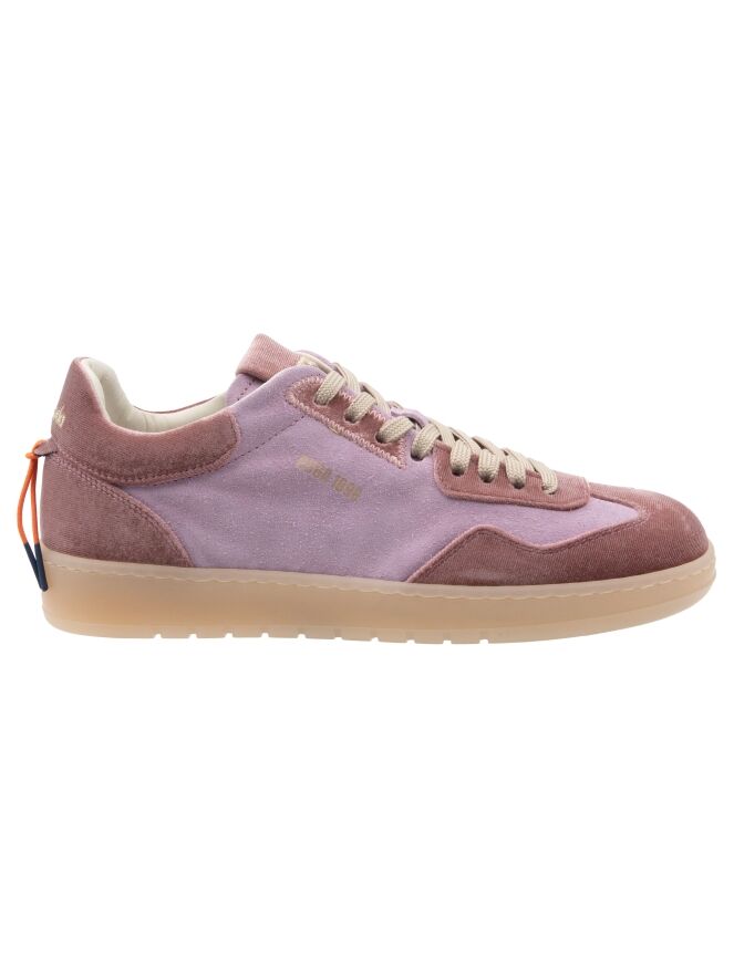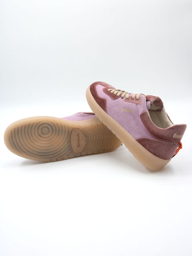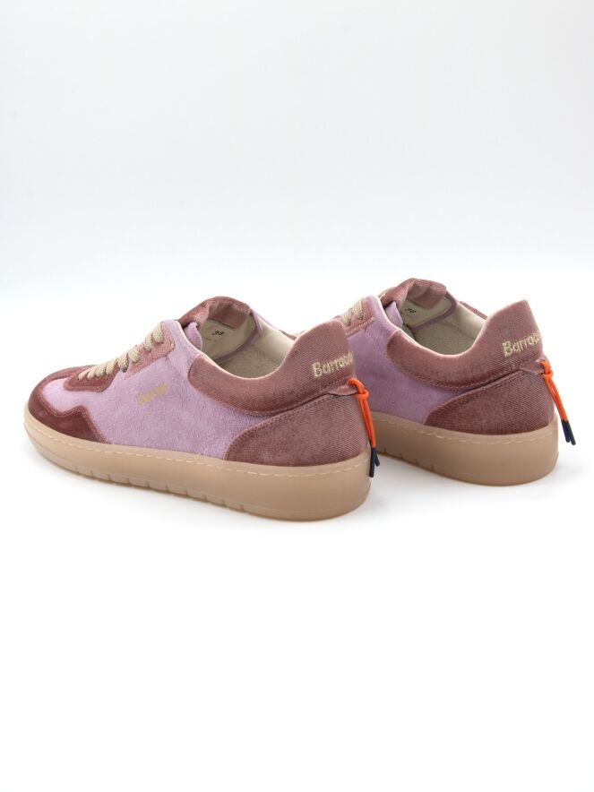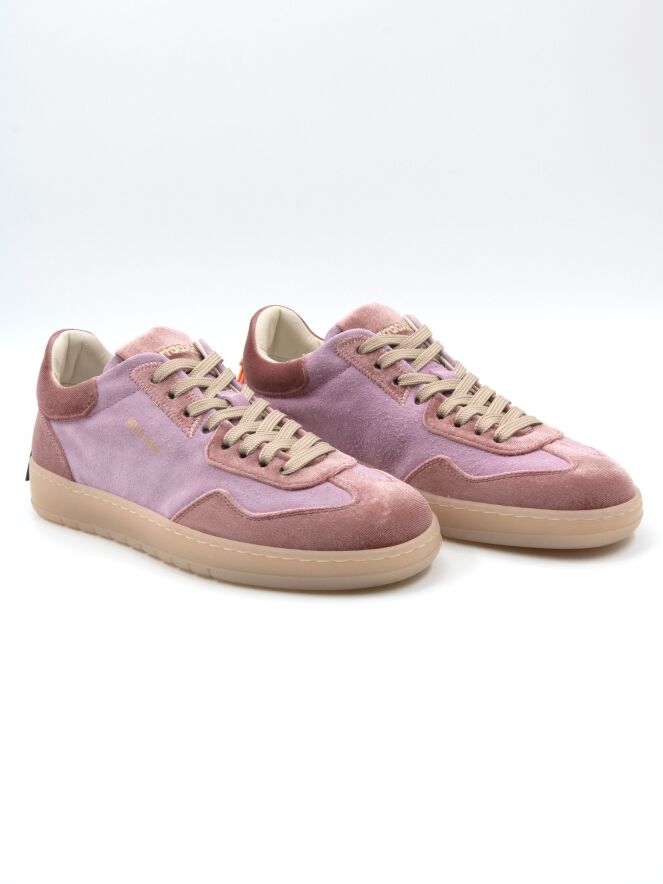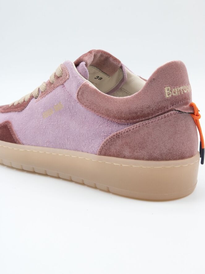 A low-top sneaker by Barracuda in lilac color. Along the edge of the toe, the shaft, the heel, and the laces is a soft velvet fabric in an old pink color.