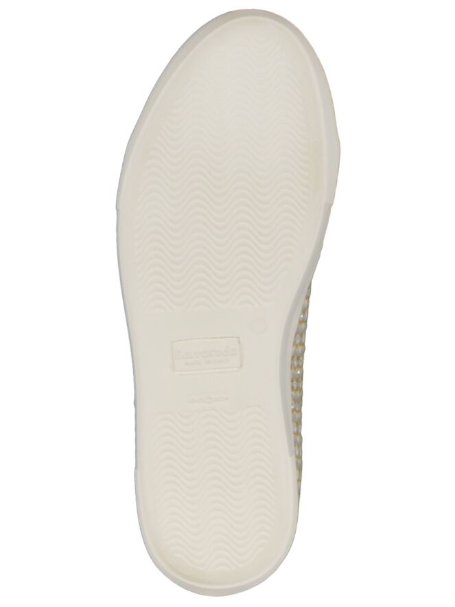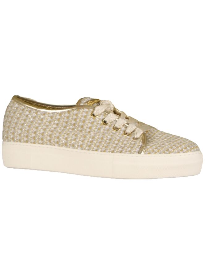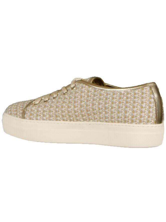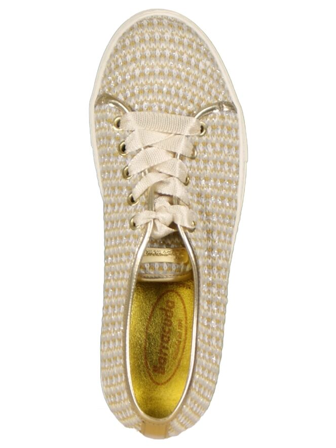 A lace-up shoe of the brand Barracuda in a variegated color of oker, gray and cream. The shoe has a sole of 2 cm high and is dust. Along the edges is a band in the color gold of leather. The shoe is lined on the inside.