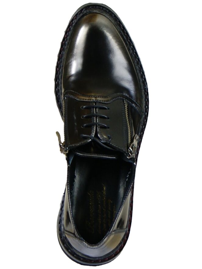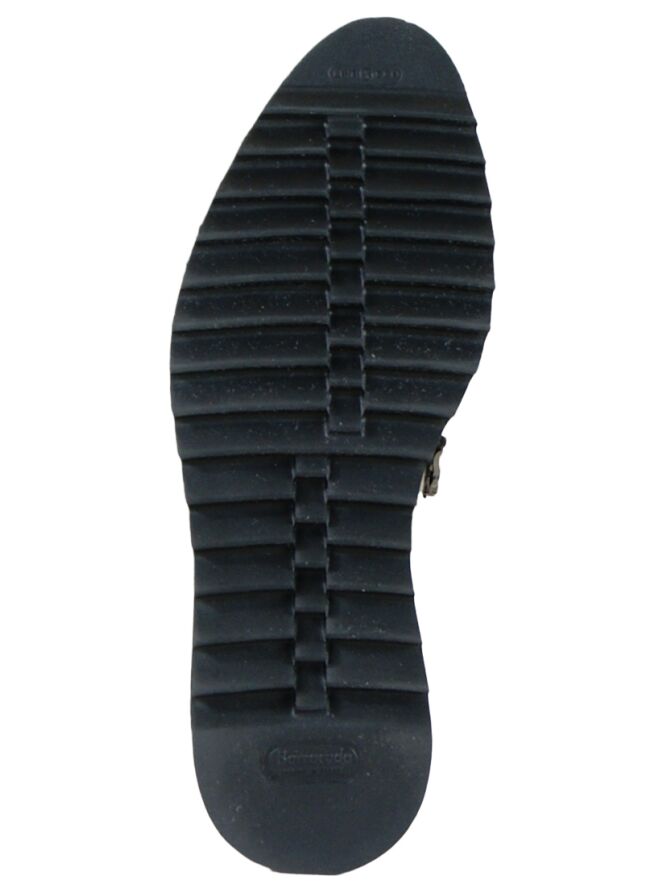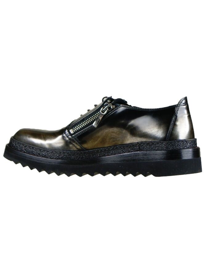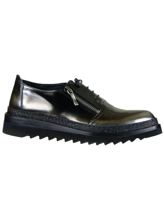A shoe from the brand Barracuda in spaziolate leather in the color metallic anthracite. Along the lacing is used a zipper on both sides of the shoe. Along the top side of the coarse notched sole is processed by an extra band stitched. The shoe is lined on the inside with leather.