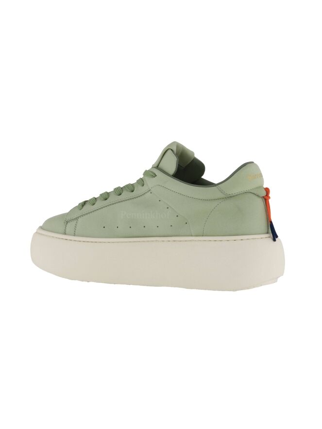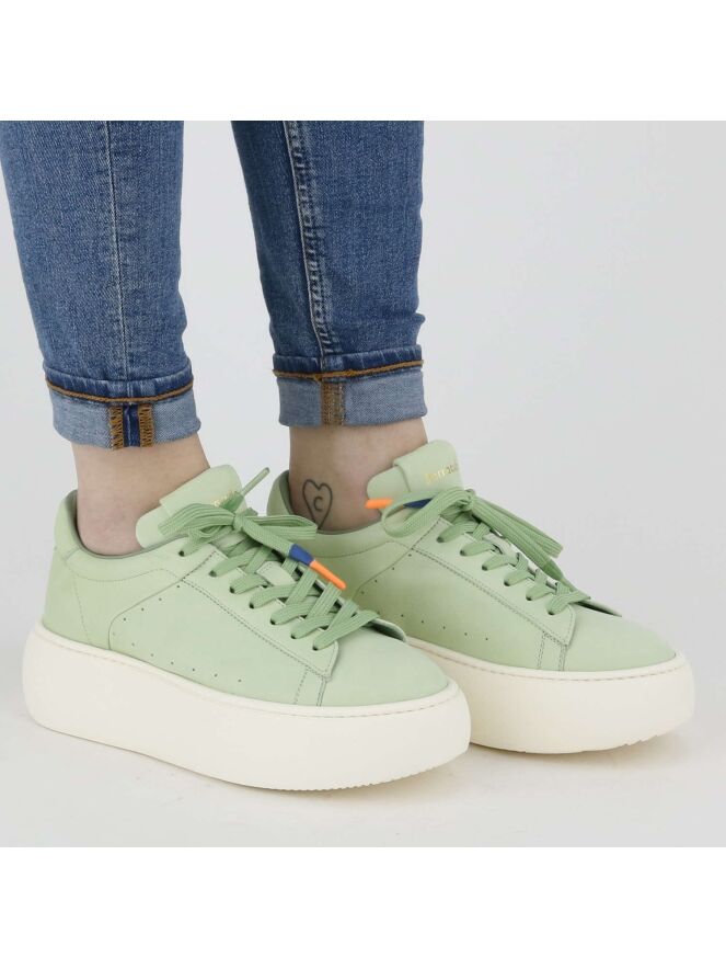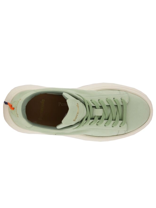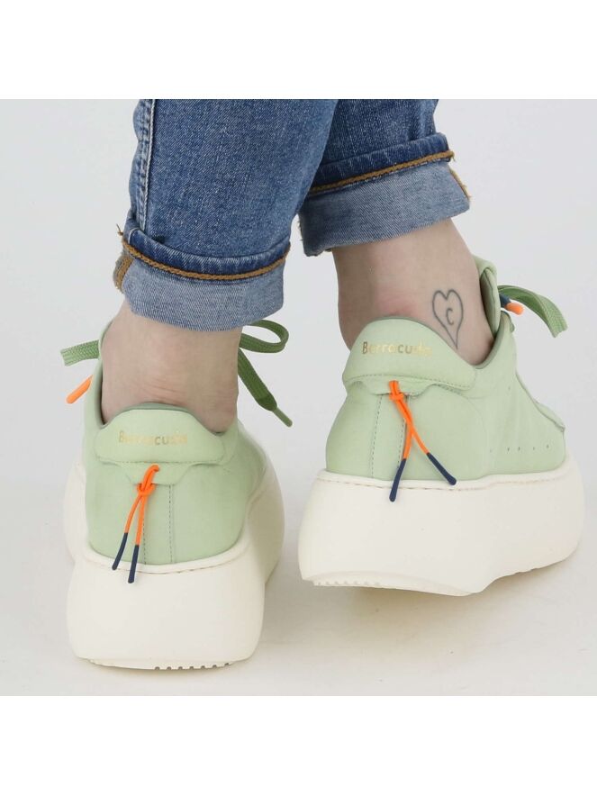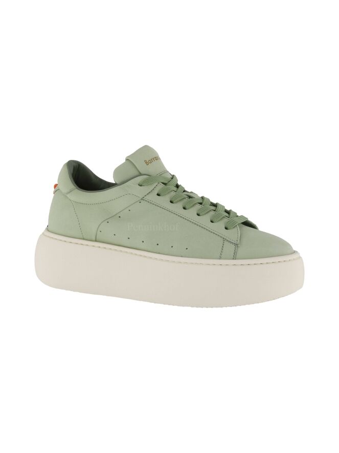 A sneaker from Barracuda in the color pastel pistachio green. The smooth platform sole is in a creamy white color. The inside is lined with leather.