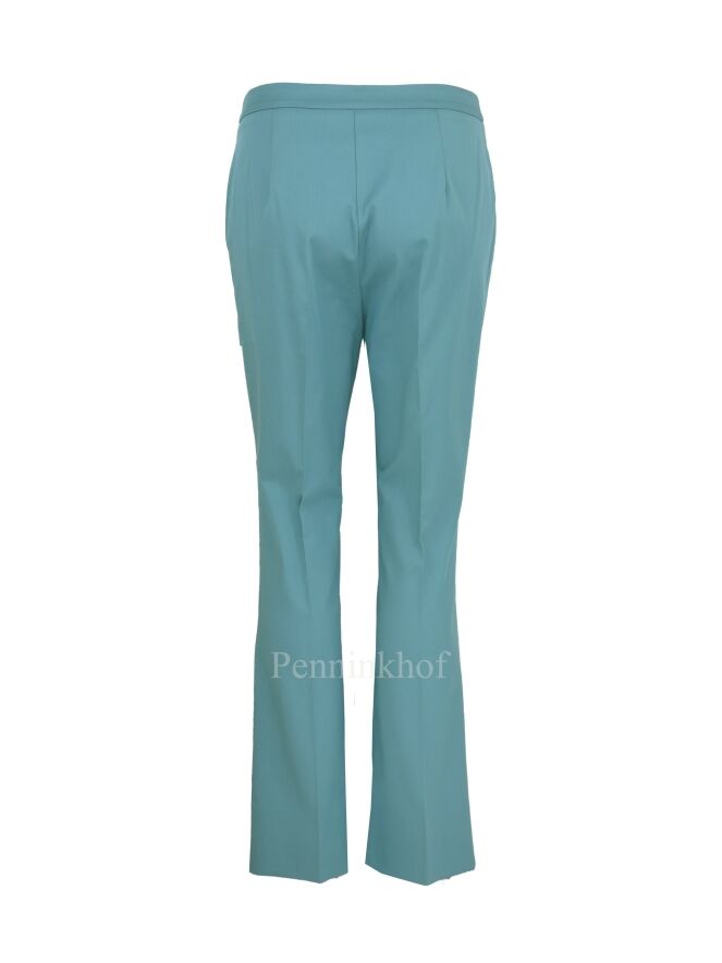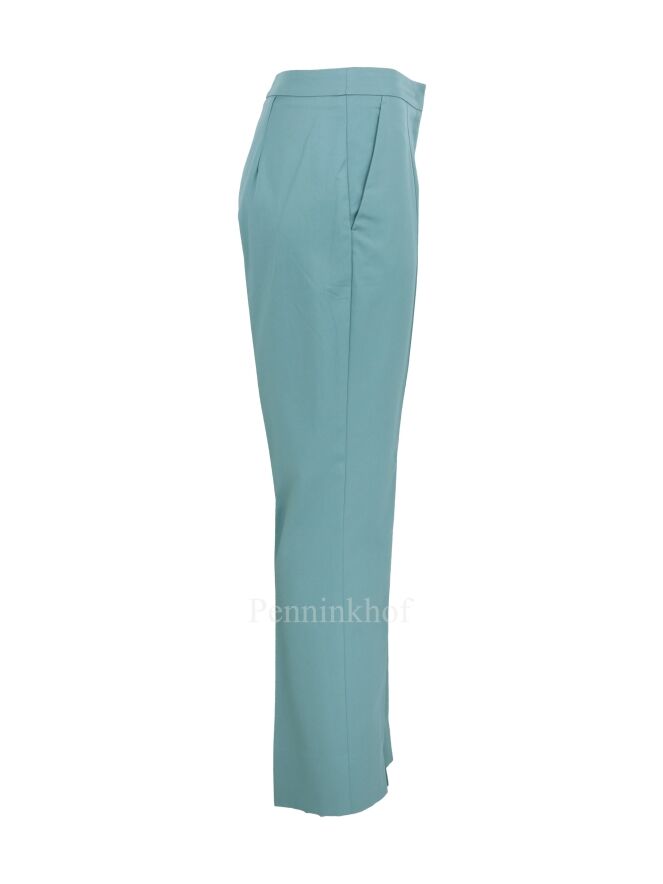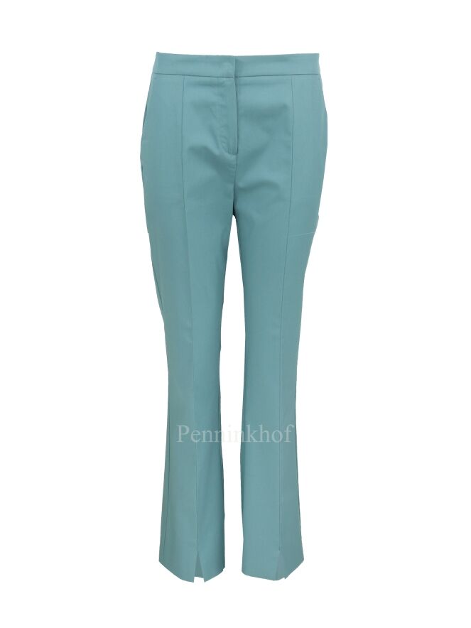 Beatrice B. pants in a dark mint color. There is a split at the bottom of the legs. The pants have side pockets and can be hand washed.