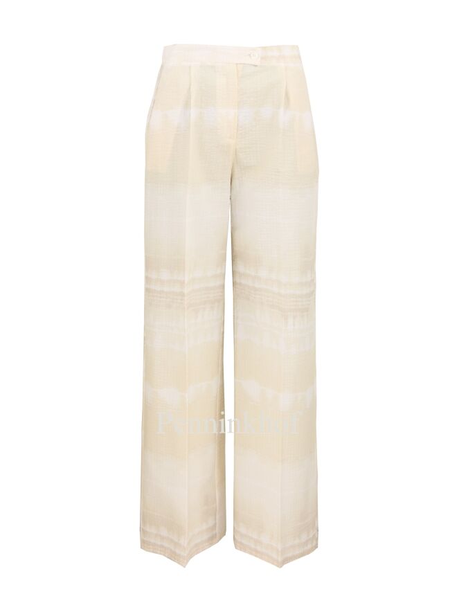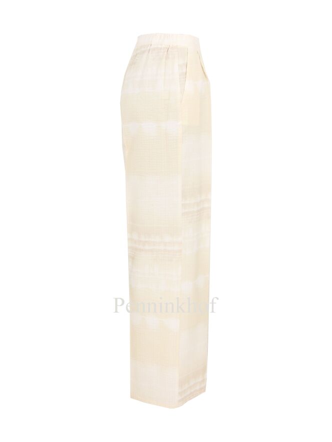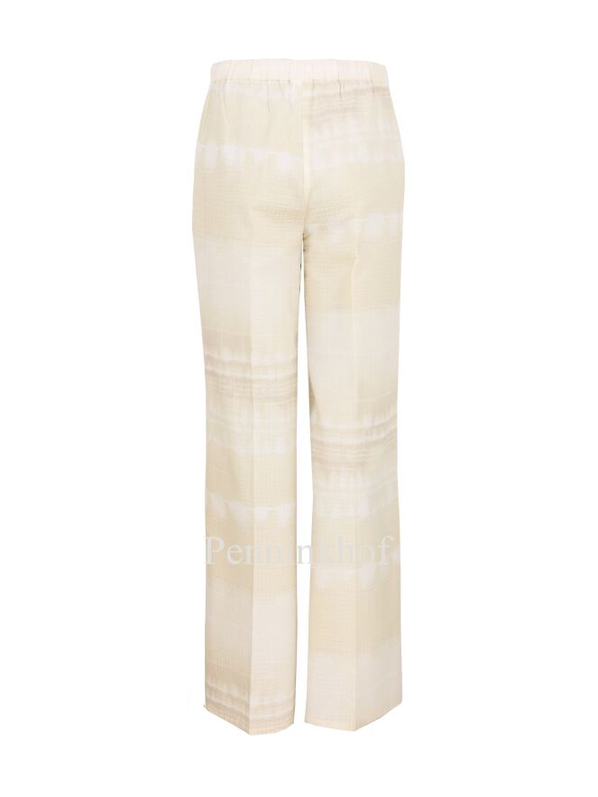 Beatrice B. pants in a batik print with the colors white and vanilla. The fabric has a fine waffle structure. In the waist is an elastic band at the back. The pants have side pockets and can be hand washed.
