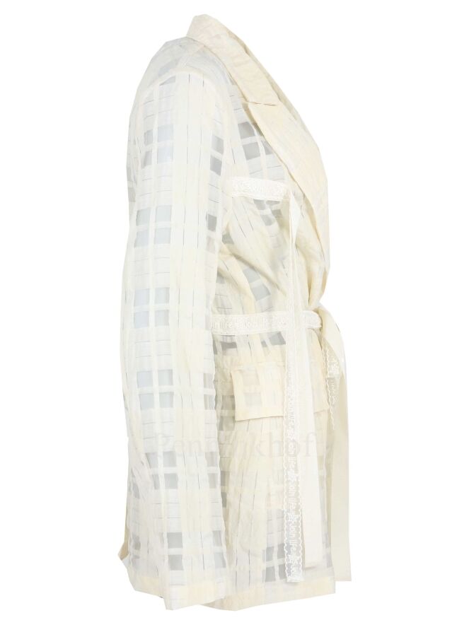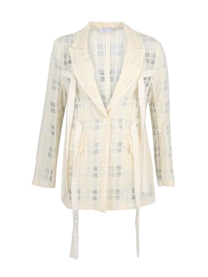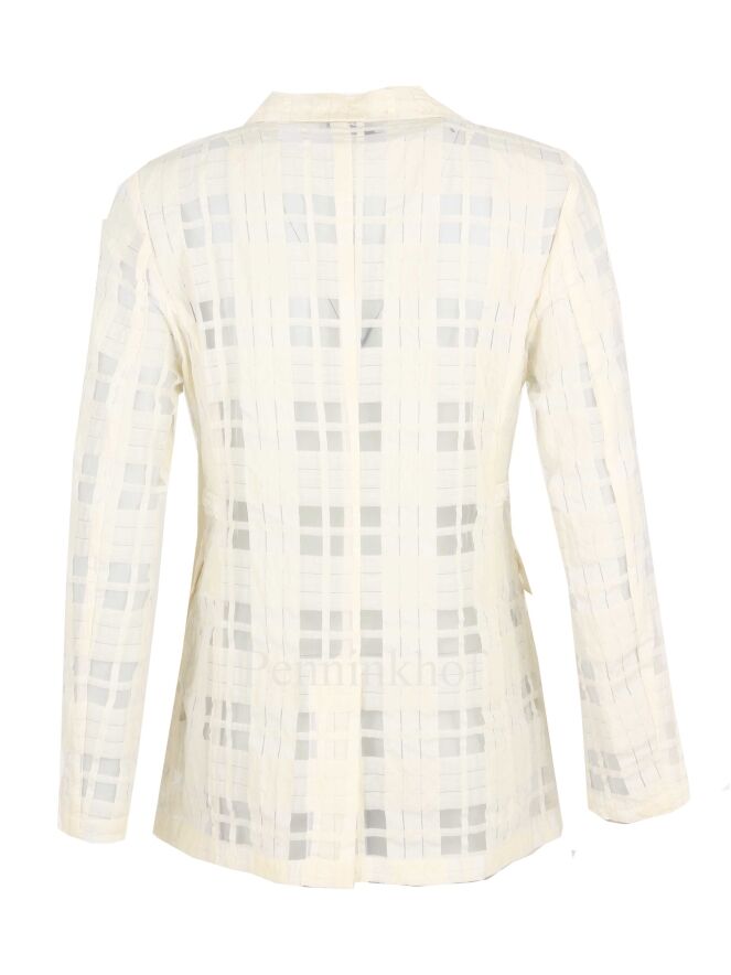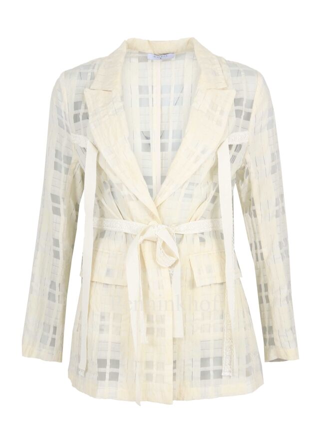 A transparent blazer from Beatrice B. in the color creamy white. The fabric is in a braided block pattern. At the waist and from the sleeve insert a double ribbon of which one ribbon is transparent with a text woven into the fabric. The blazer is unlined and can be hand washed.
