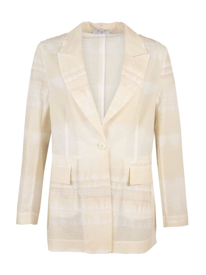 An unlined blazer from Beatrice B. in a batik print with the colors white and vanilla. The fabric has a fine waffle structure. The blazer has a one-button closure and can be hand washed.