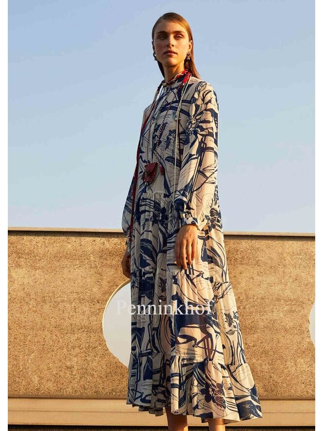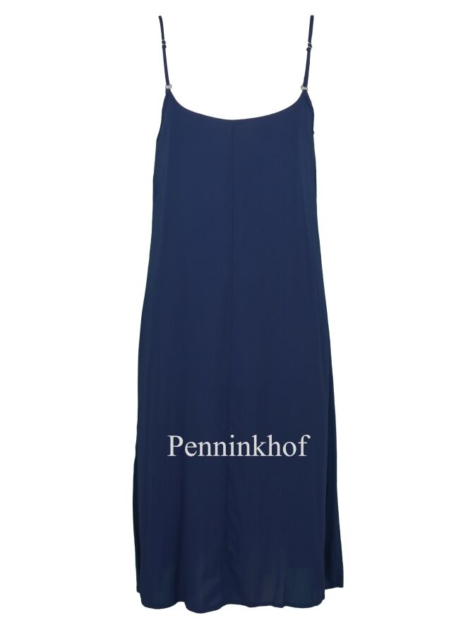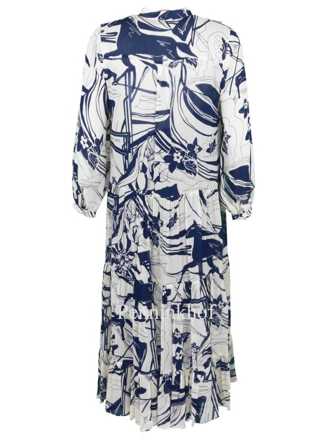 A dress by Beatrice B. In a graphic print with the colors blue and creamy white. Below the waist and at the knee is an elastic stitching seam where the fabric is finely pleated. The top fabric is transparent and the dress has a night blue slip dress. This dress can be hand washed.
