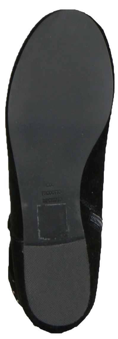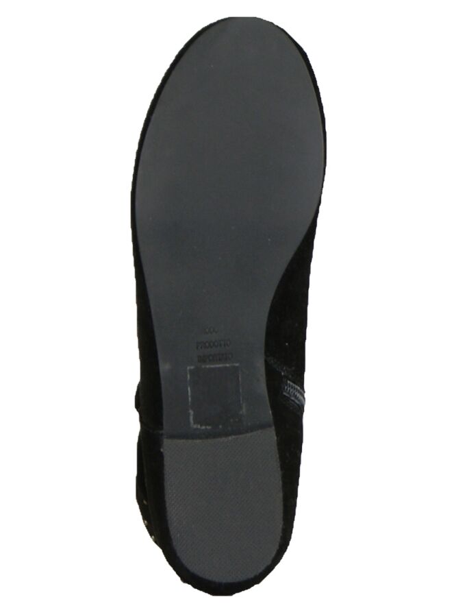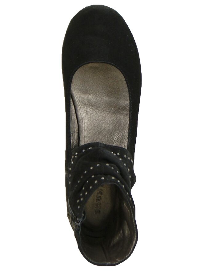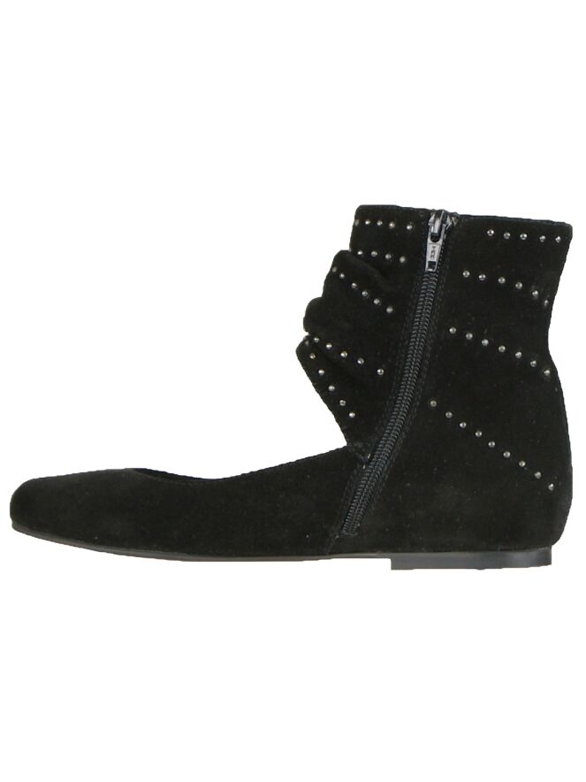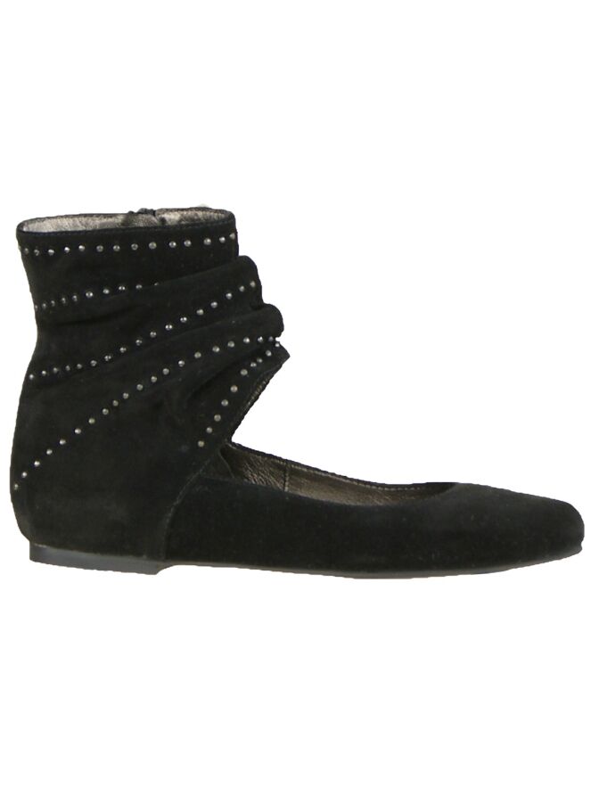 A ballerina of the brand Bruno Premi in the color black. The ballerina has a short shaft to the ankle which is pleated has multiple rows of small nickel-colored studs. The inside of the ballerina is lined with leather.
