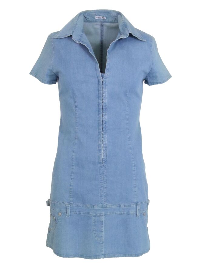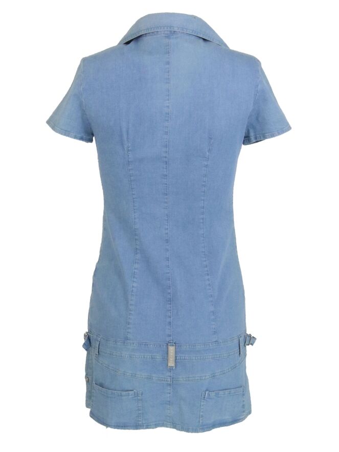 A short dress by Byblos in a pastel jeans color. There are several hooks from the bottom of the V - Neck to the waist. There are decorative buckles on the sides below the waist. This dress can be washed at 30 degrees.