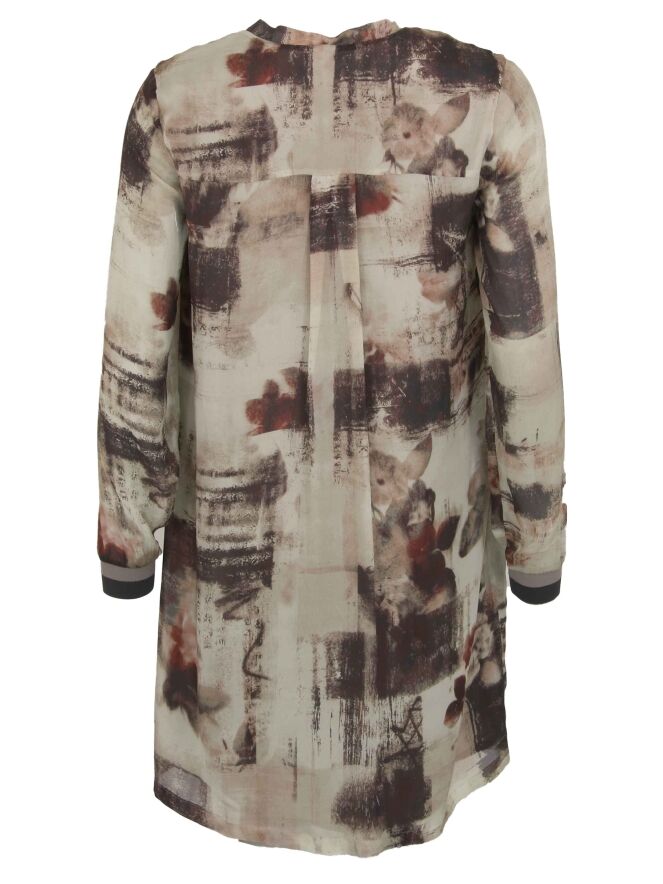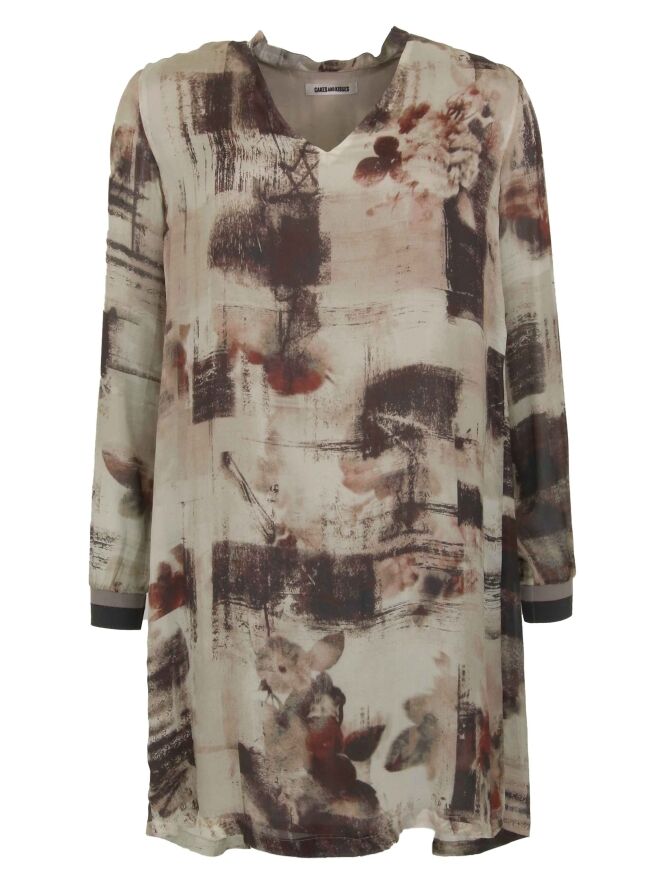 A long blouse of the brand Cakes and Kisses in a print with the main colors eggplant and taupe. The blouse has a V neckline with a narrow trim from the shoulder. The blouse is sheer and comes with a long uni top in the color taupe. The sleeves have a 4 cm wide knit-in 2 colors taupe. This blouse may be hand washed.