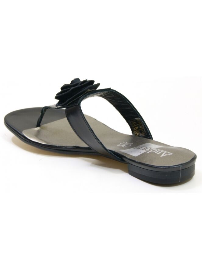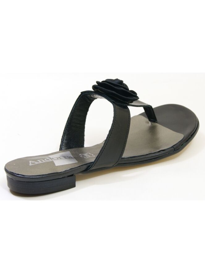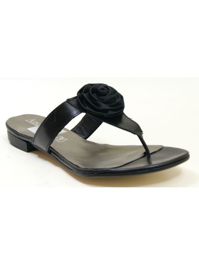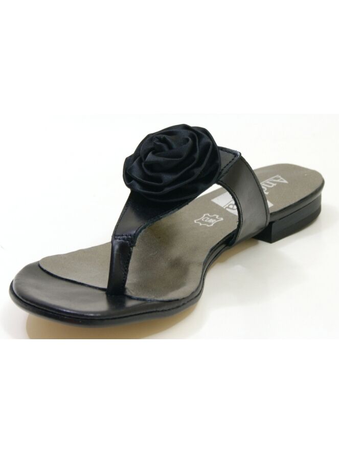 A sandal from Calmode in the color black. On the forefoot is a decorative rose.