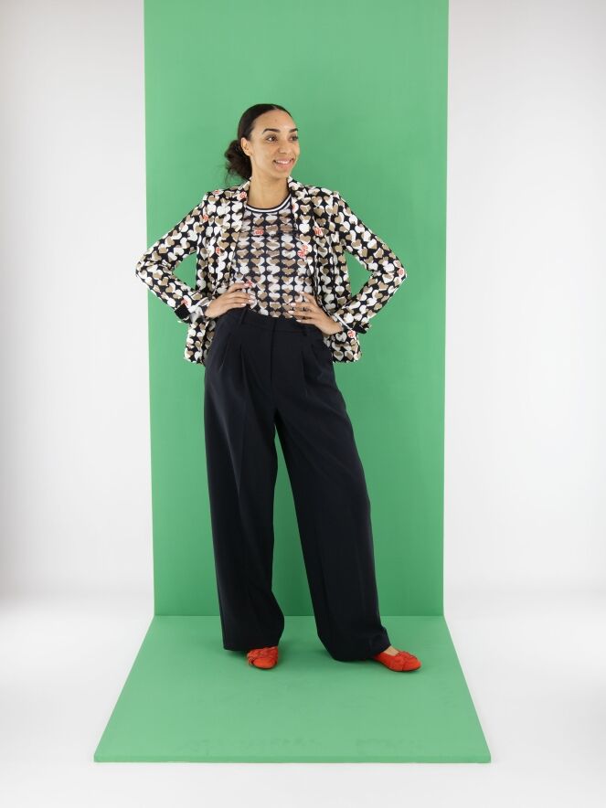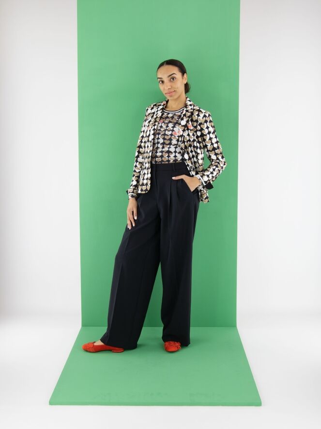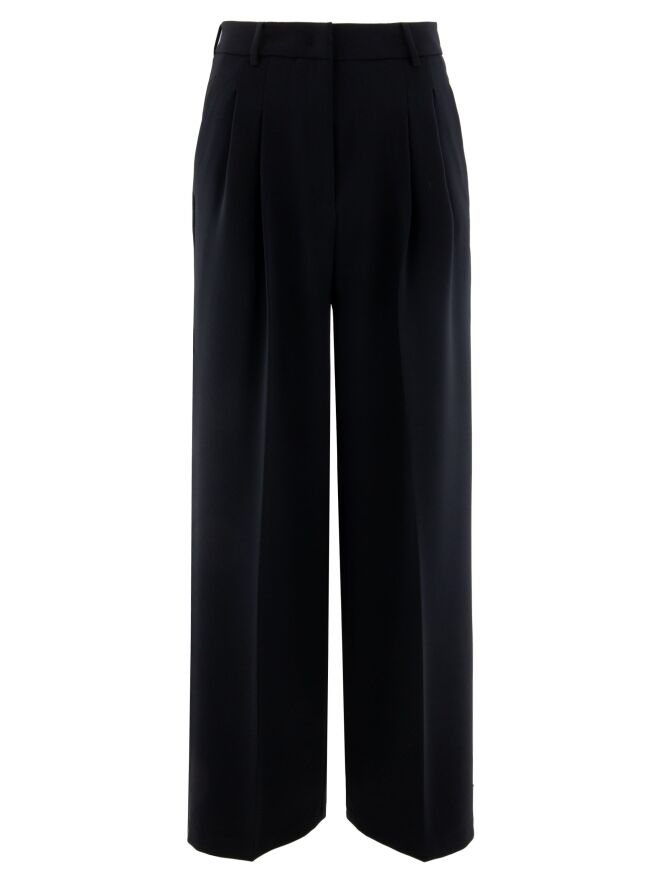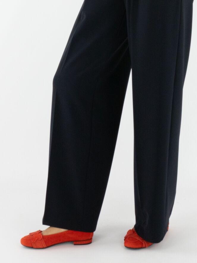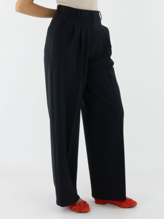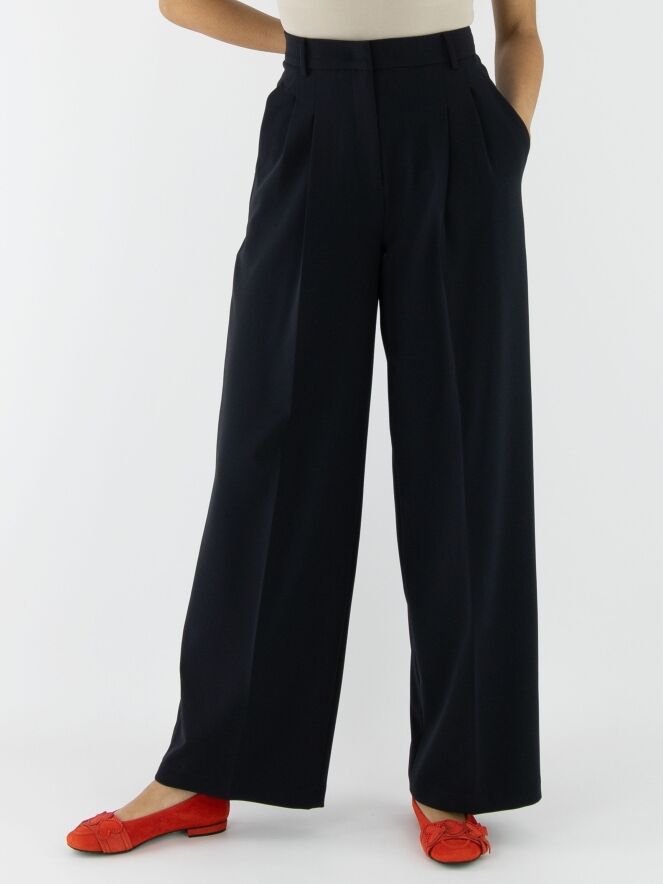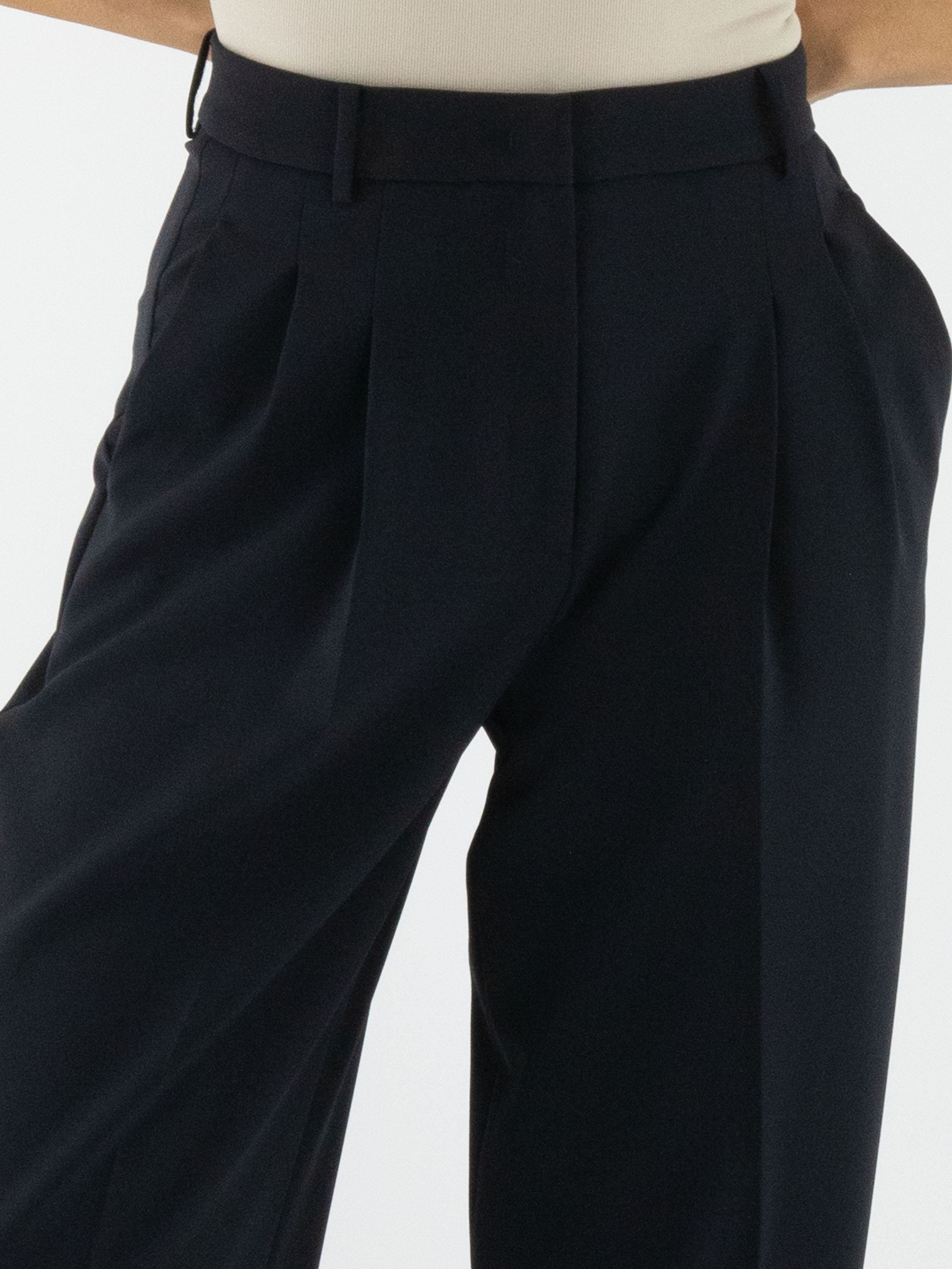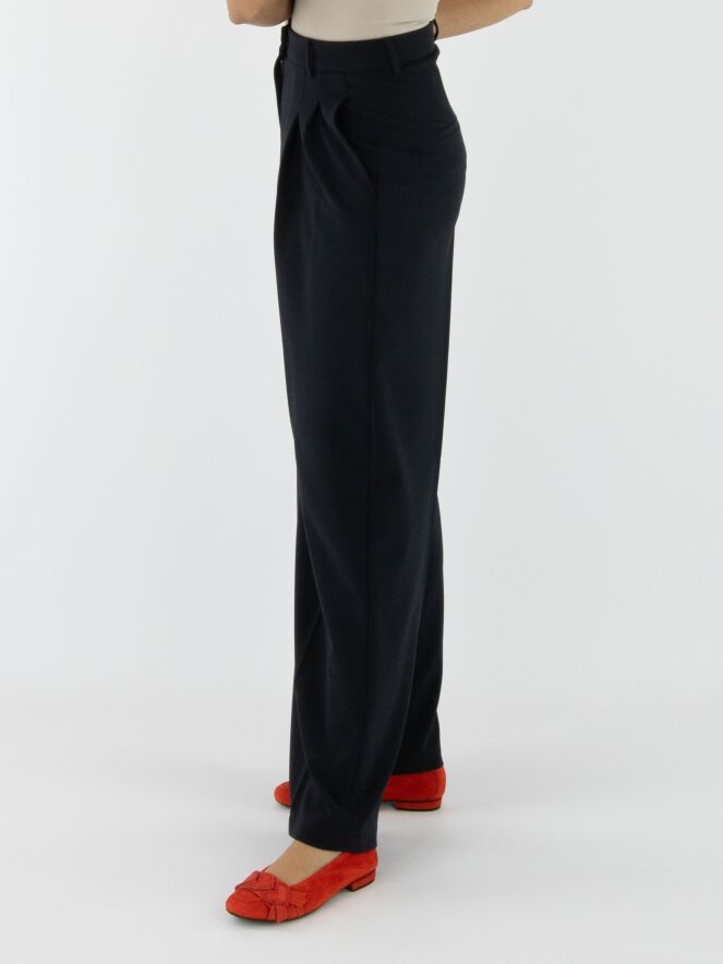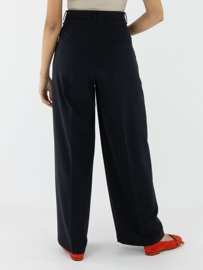 Wide trousers by Cambio in navy blue. The waistband features multiple pleats. A pressed crease runs down the center of the legs. The trousers have side pockets and should be hand-washed.