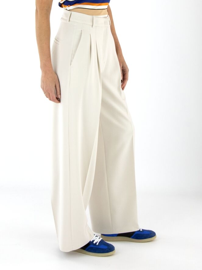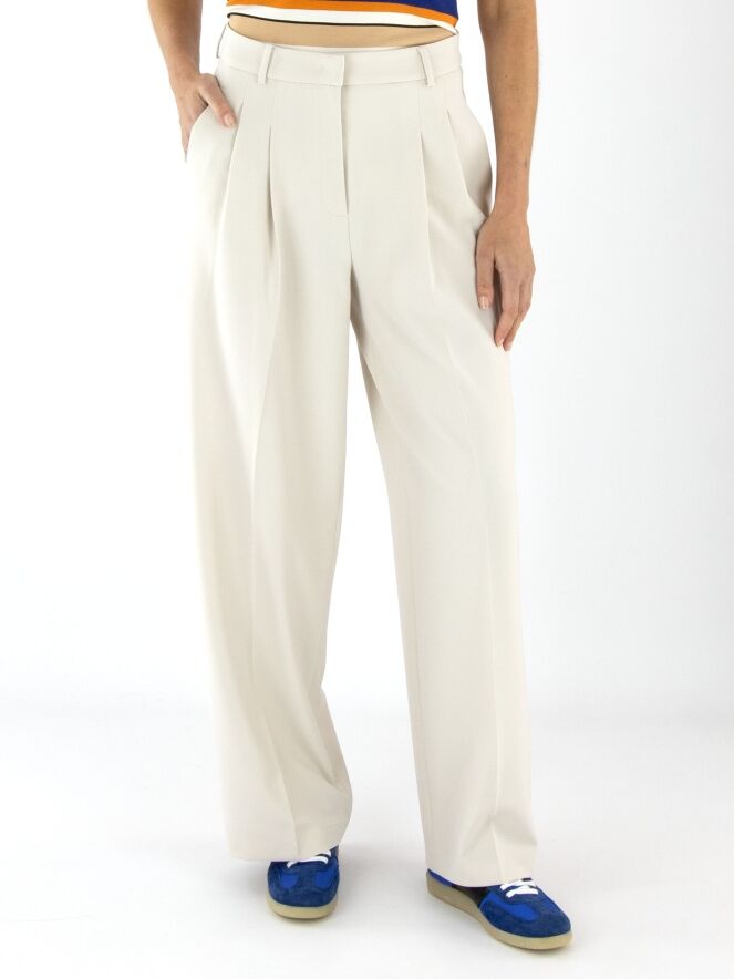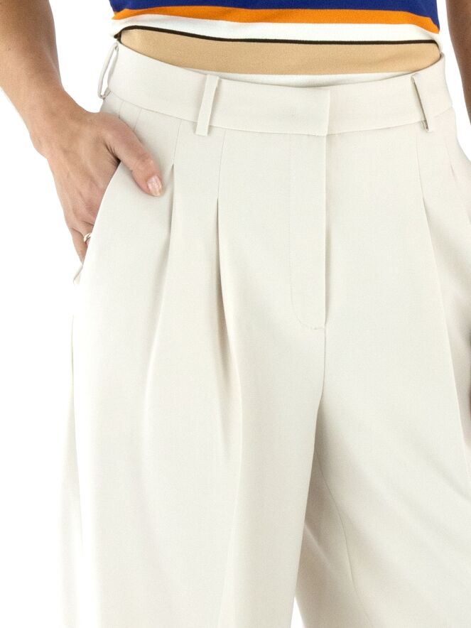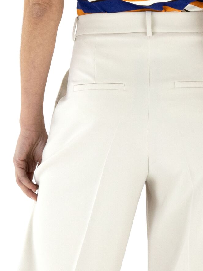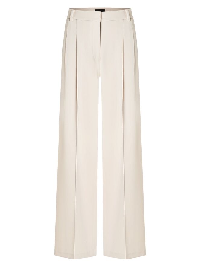 A wide-leg trousers by Cambio in beige. The waistband features multiple pleats. A pressed crease runs down the center of the legs. The trousers have side pockets and should be hand-washed.