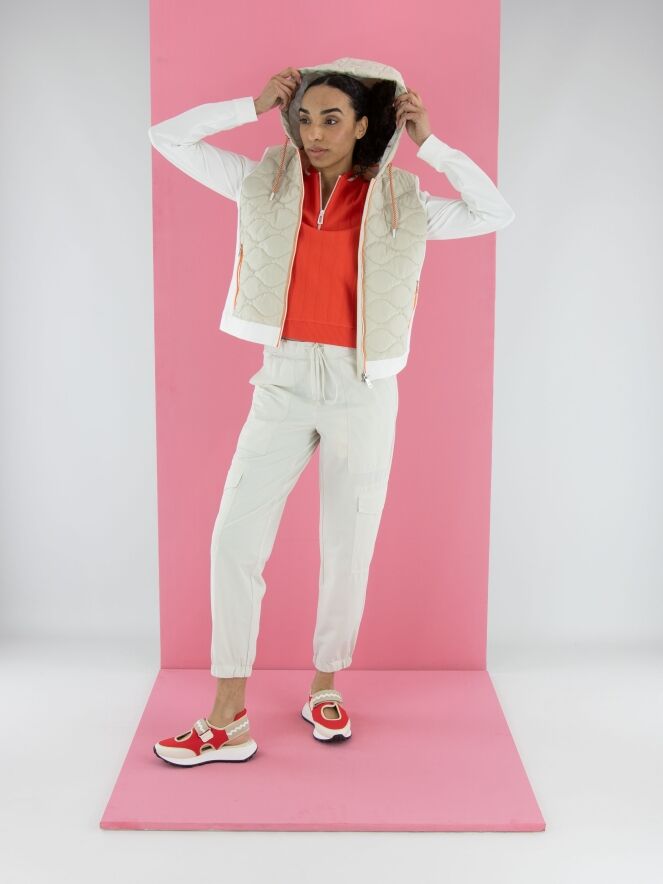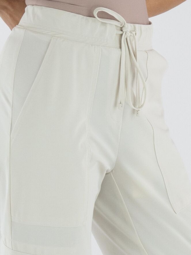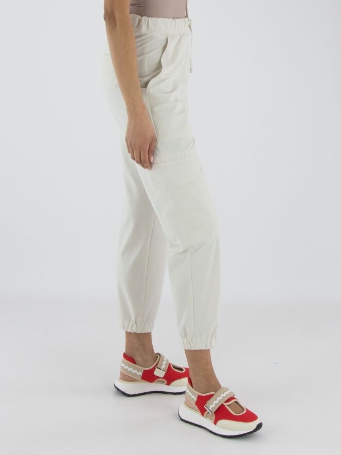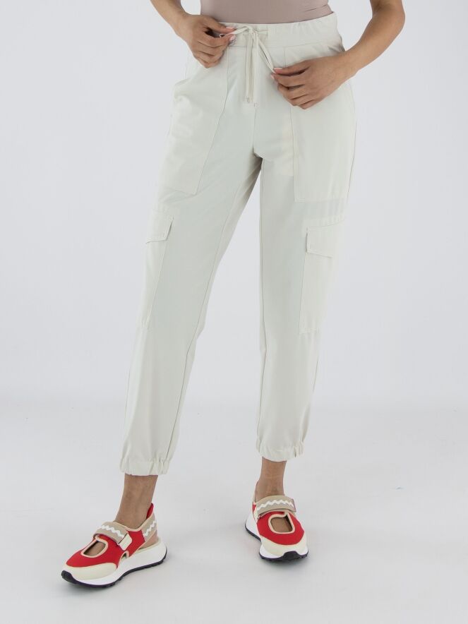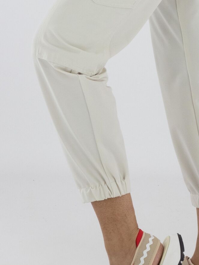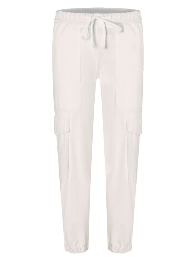 A cargo jogger by Cambio in an off-white color. The waistband features an elastic band with a drawstring in a tunnel finish. The trousers have side pockets and additional pockets at knee level. The leg openings are finished with a ruched elastic cuff. These trousers can be washed at 30 degrees.