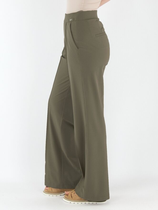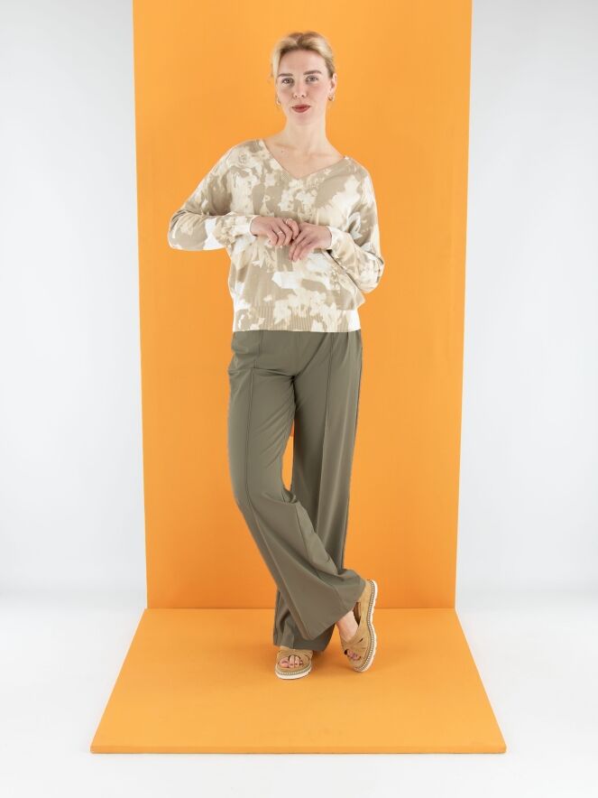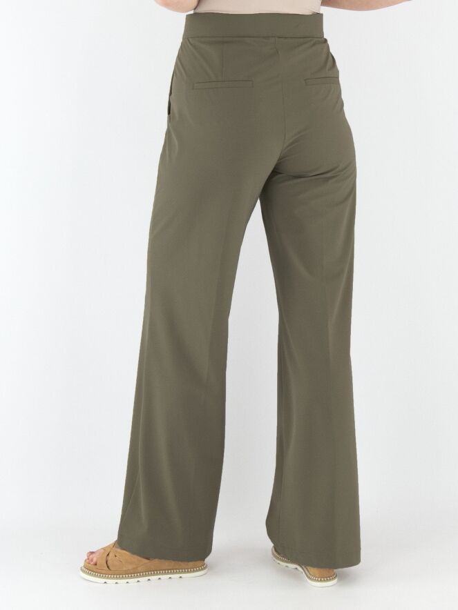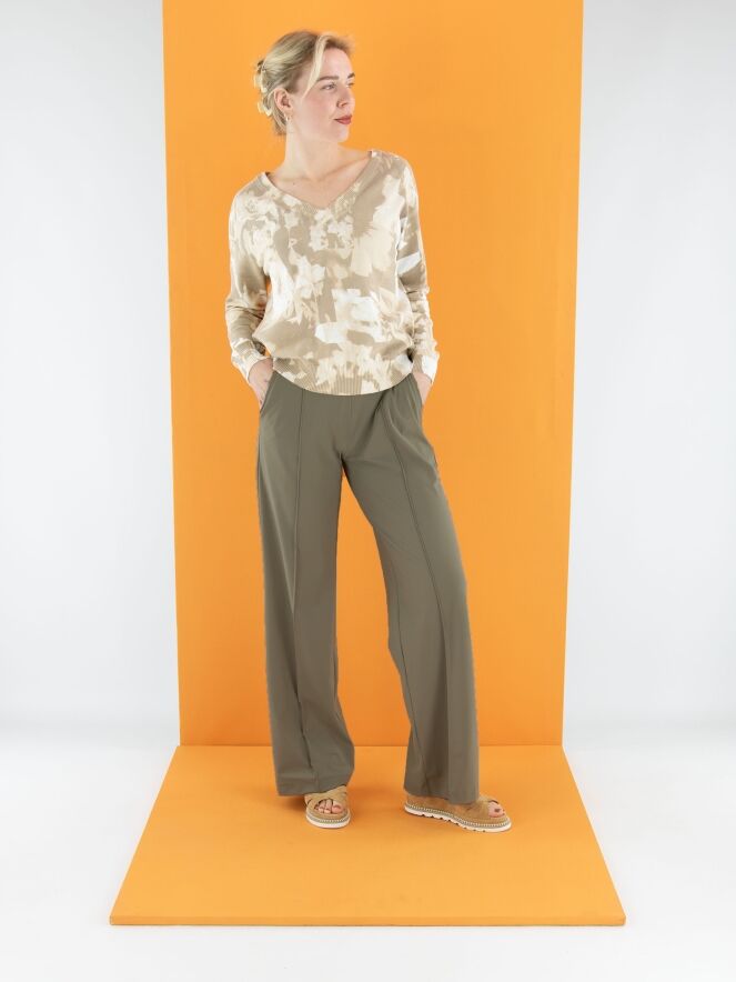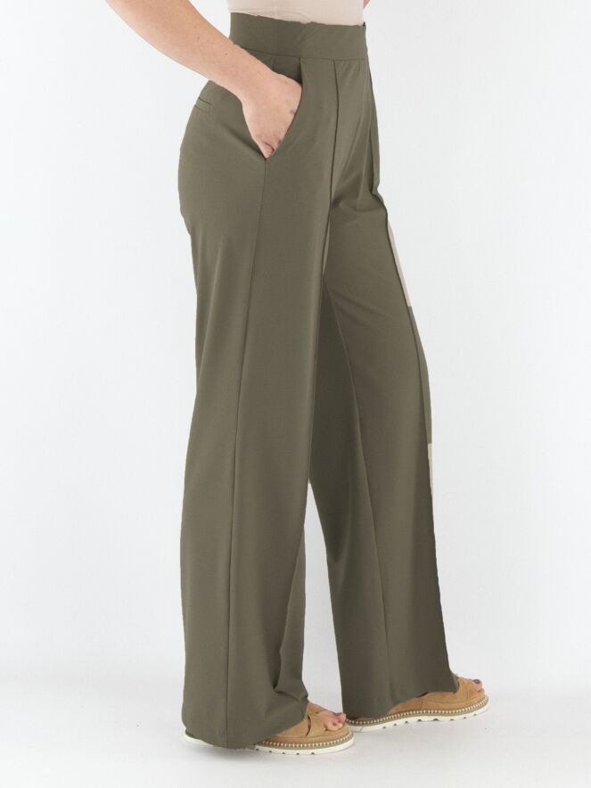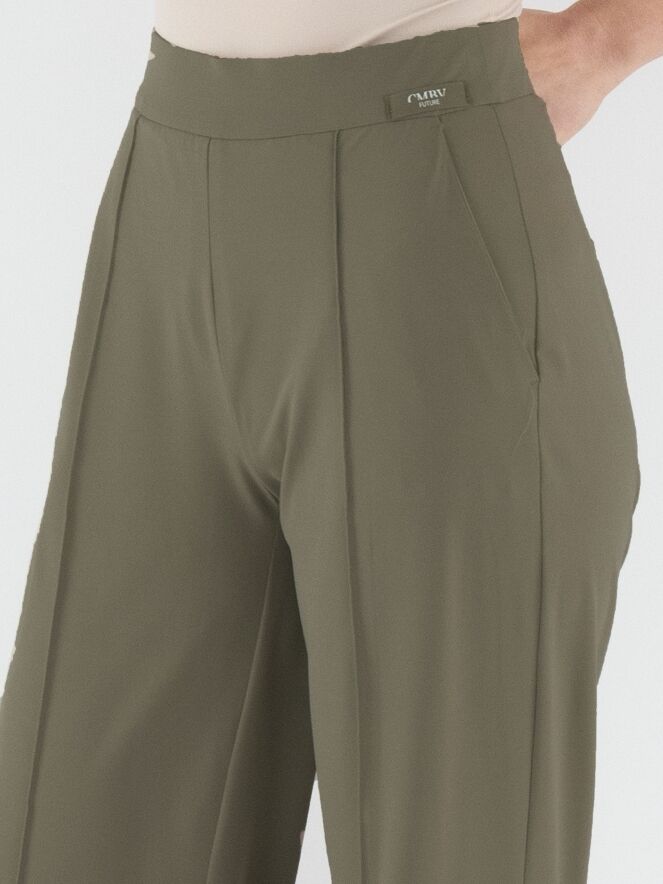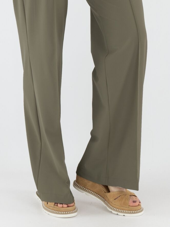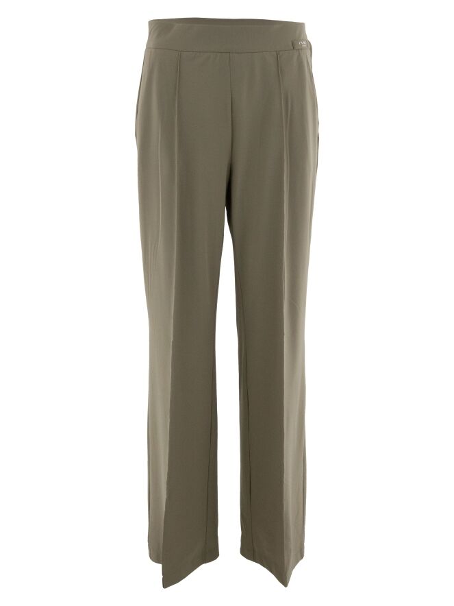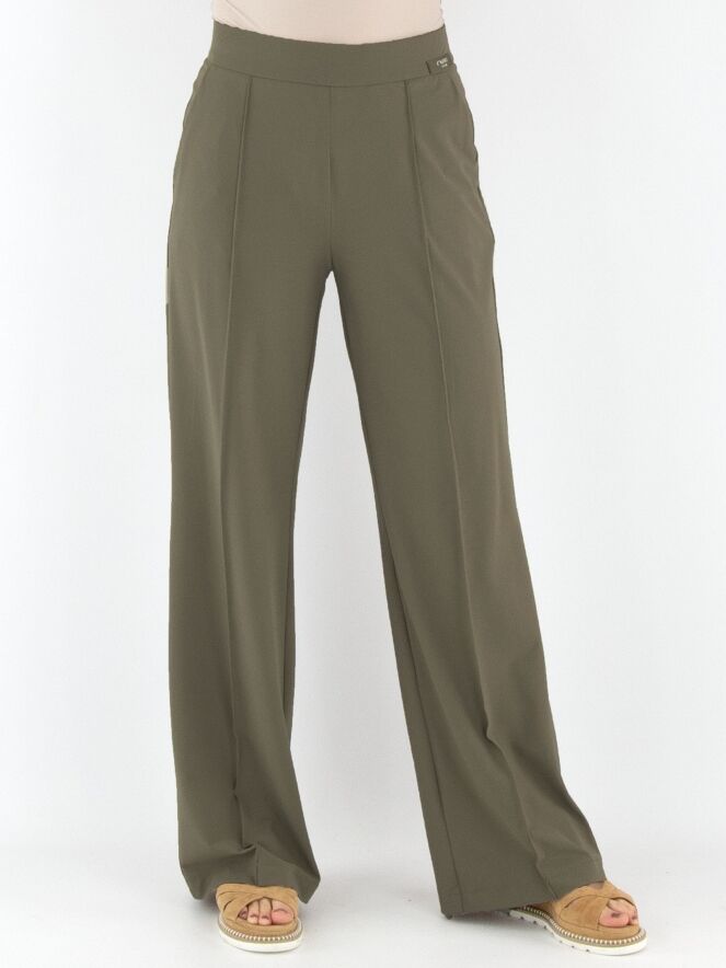 A pair of trousers from Cambio in taupe. The waistband features an elastic band. The trousers have a straight cut with a stitching line down the center of the legs. They have side pockets and can be washed at 30 degrees.