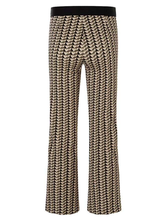 Trousers by Cambio with a graphic print in various shades of brown. The waistband features a black elastic band. These trousers can be washed at 30 degrees.