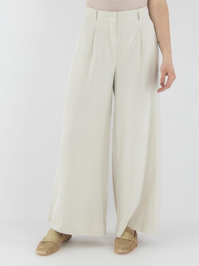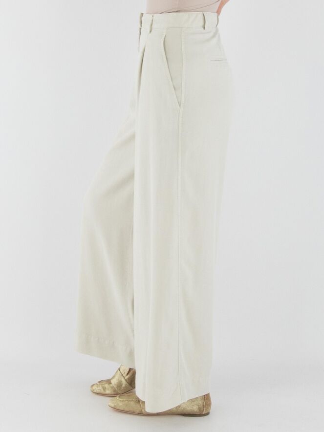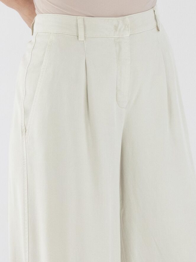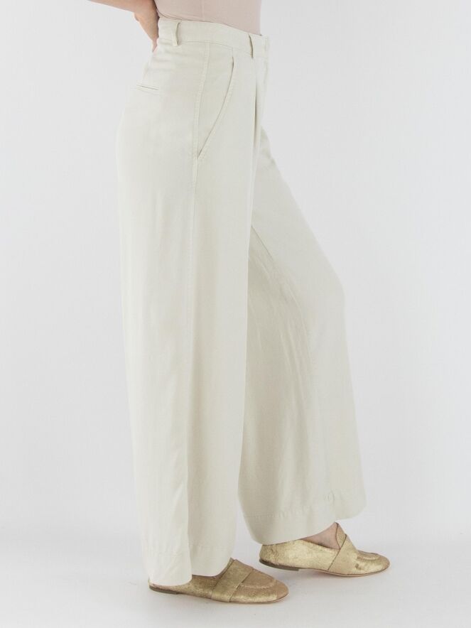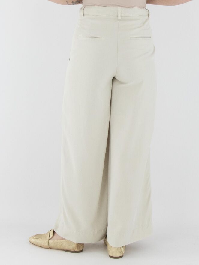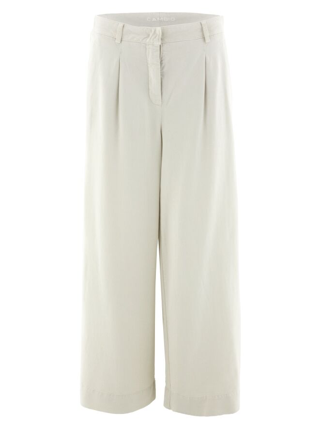 A pair of trousers from Cambio in beige. The trousers have wide legs and side pockets. A few pleats extend from the waistband. These trousers can be washed at 30 degrees.
