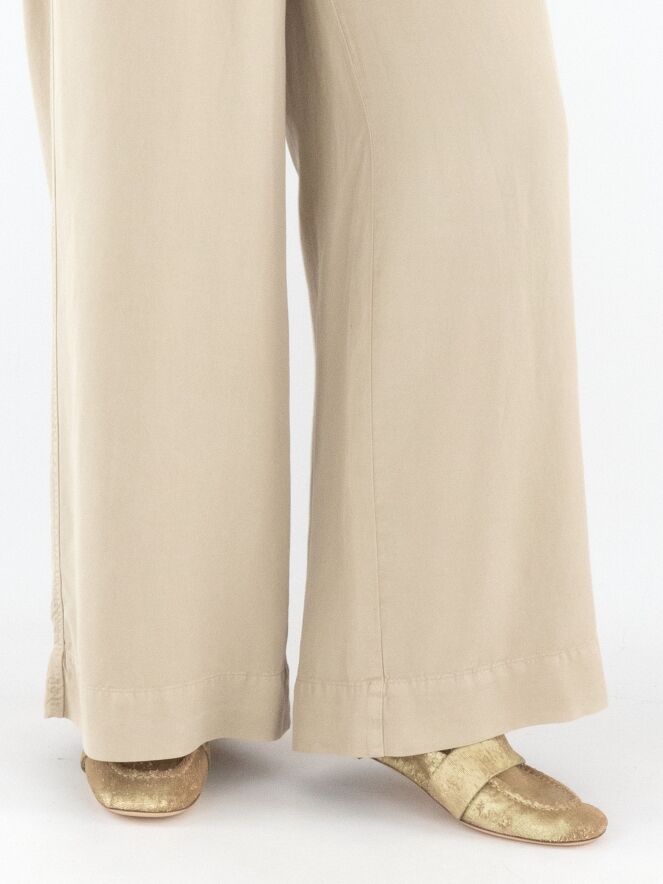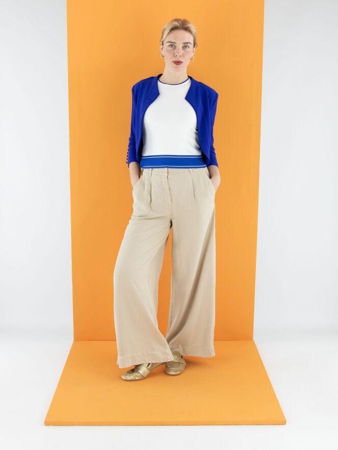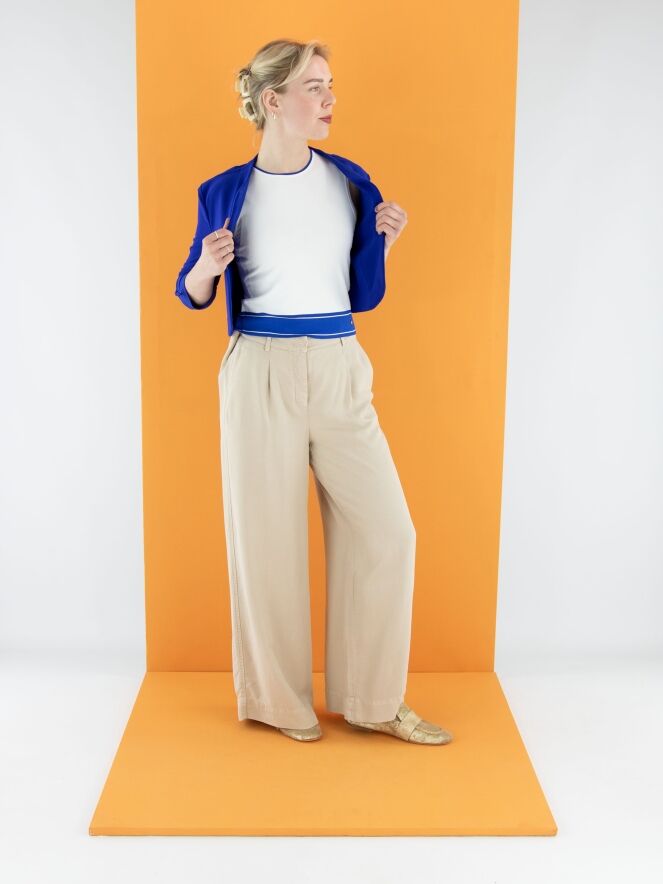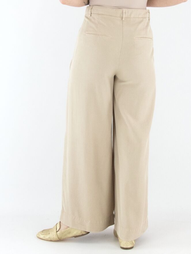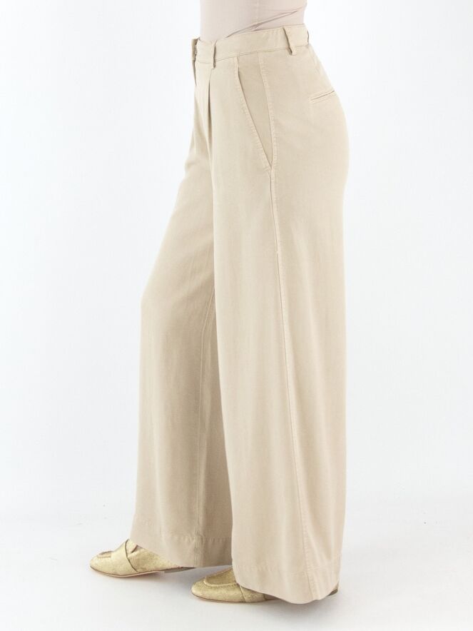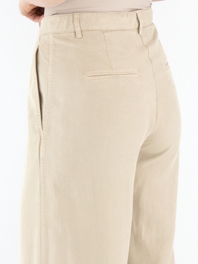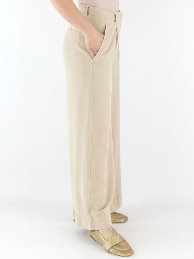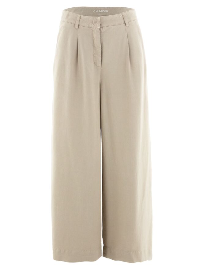 A pair of trousers from Cambio in sand color. The trousers have wide legs and side pockets. Several pleats extend from the waistband. These trousers can be washed at 30 degrees.