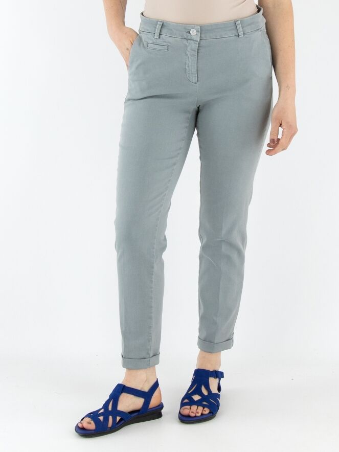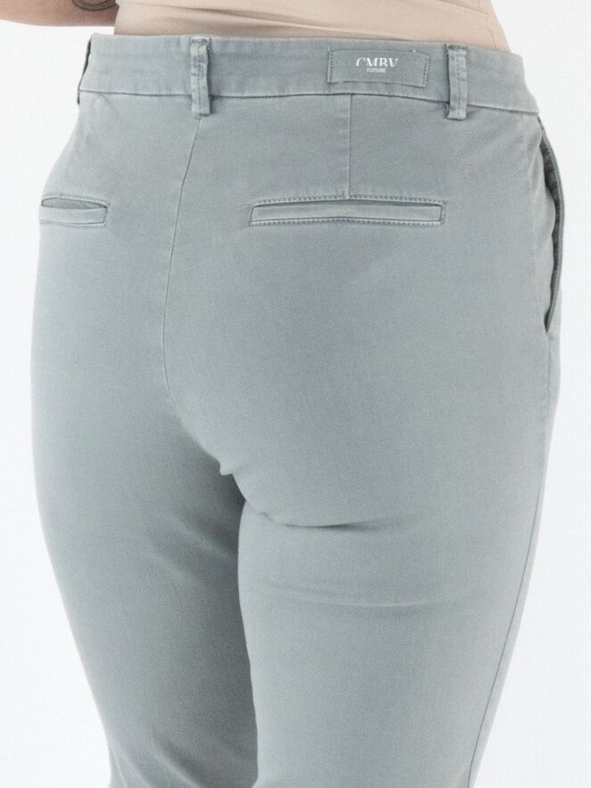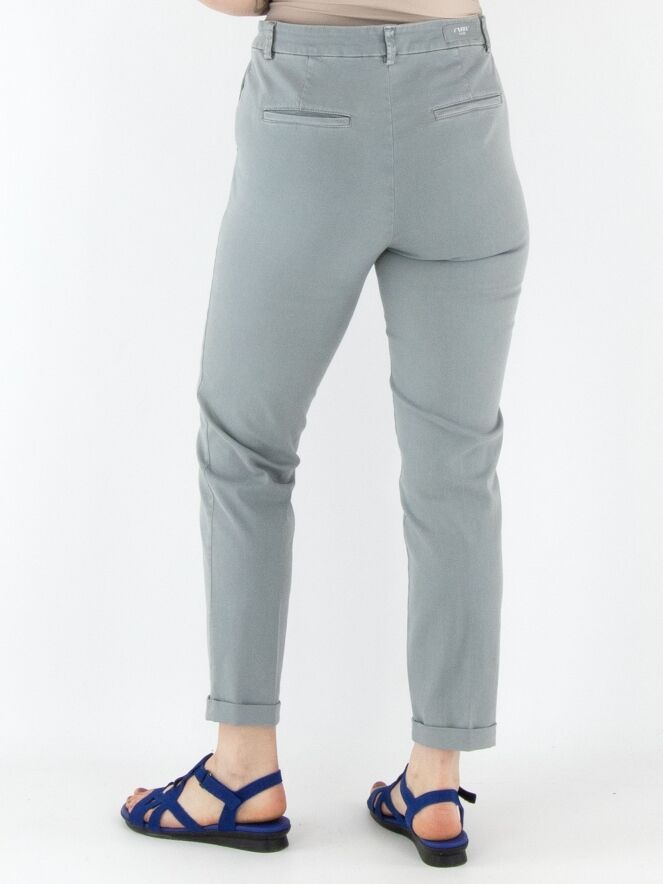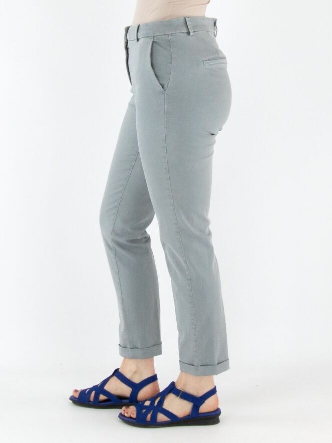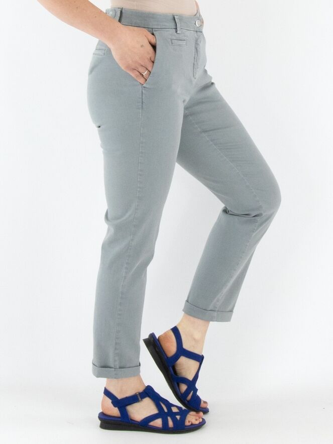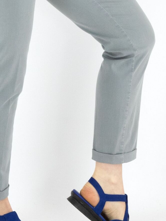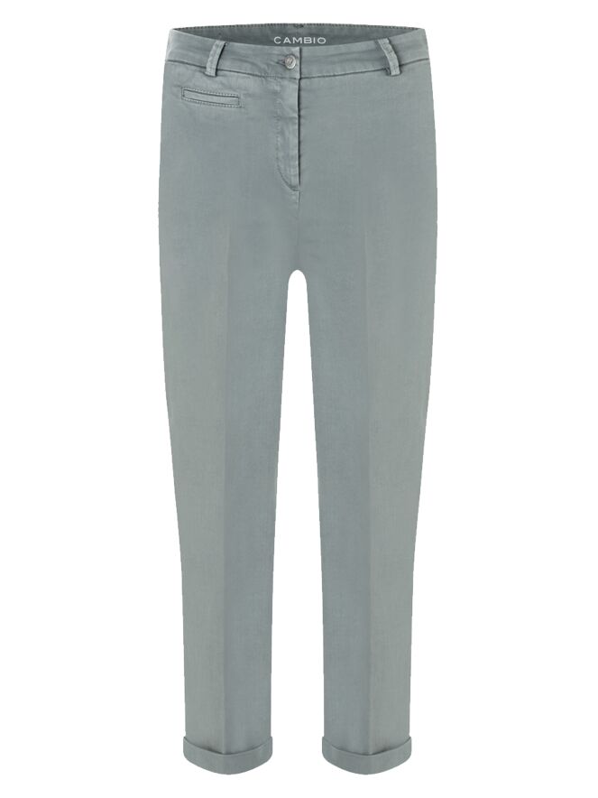 A pair of trousers by Cambio in light grey. The trousers feature side pockets and a short cuff at the hem of the legs. These trousers can be washed at 30 degrees.