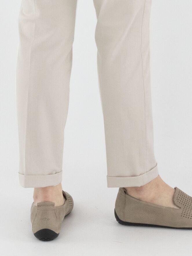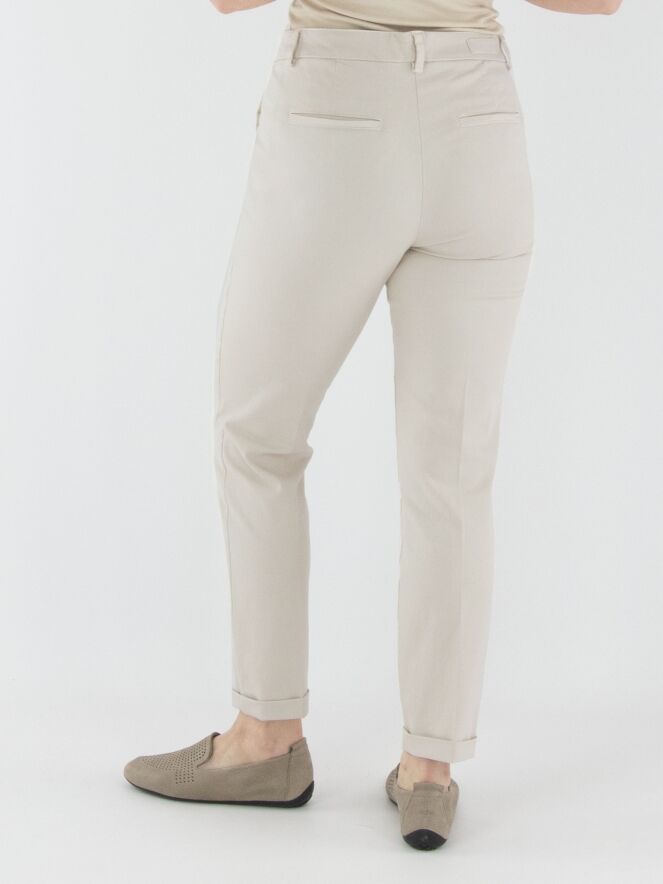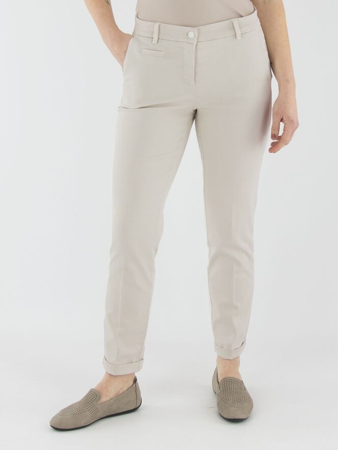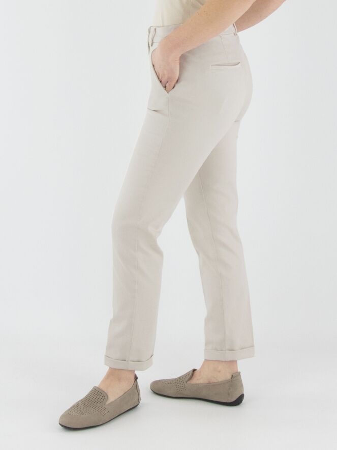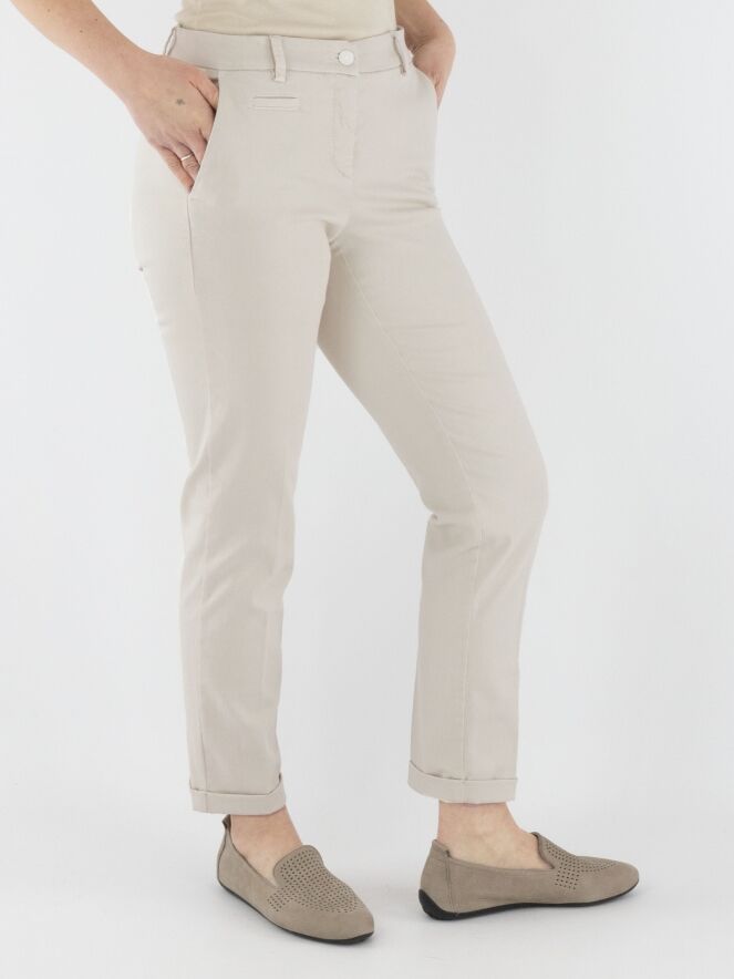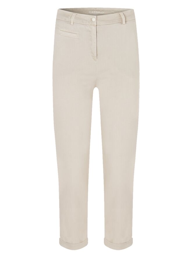 A pair of trousers by Cambio in light sand color. The trousers feature side pockets and have a short cuff at the hem. These trousers can be washed at 30 degrees.