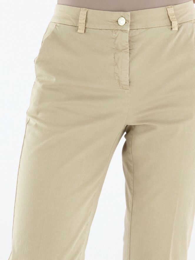 A pair of trousers by Cambio in sand color. The trousers feature side pockets and a pressed crease down the center of the legs. These trousers can be washed at 30 degrees.