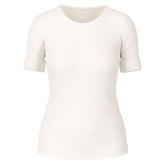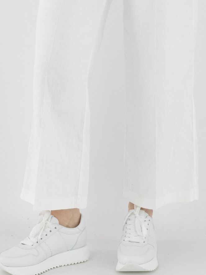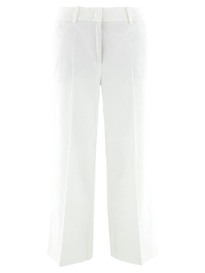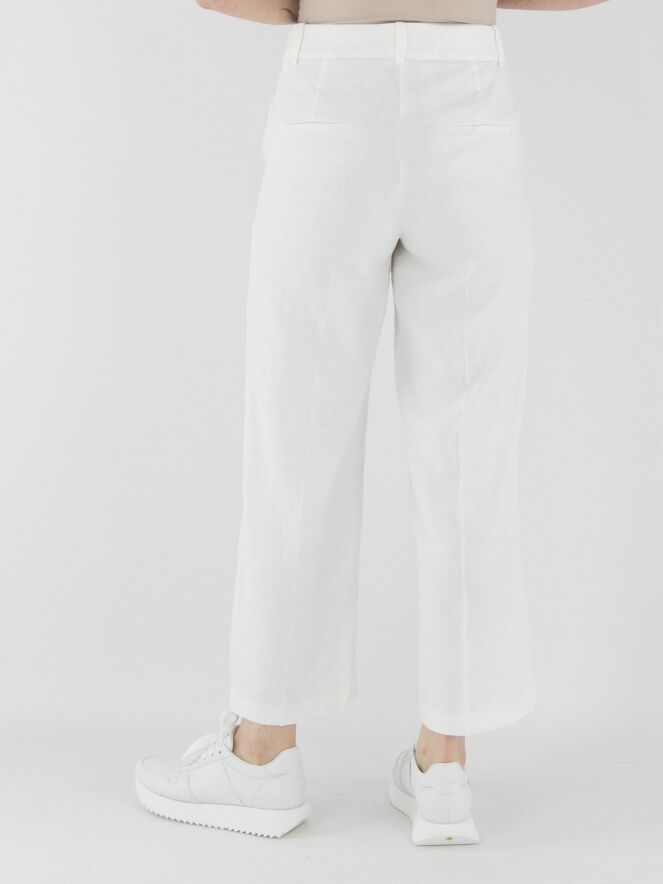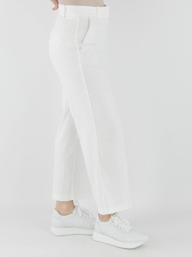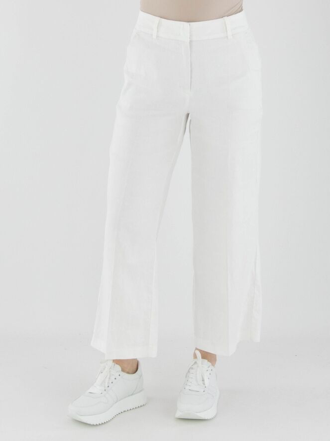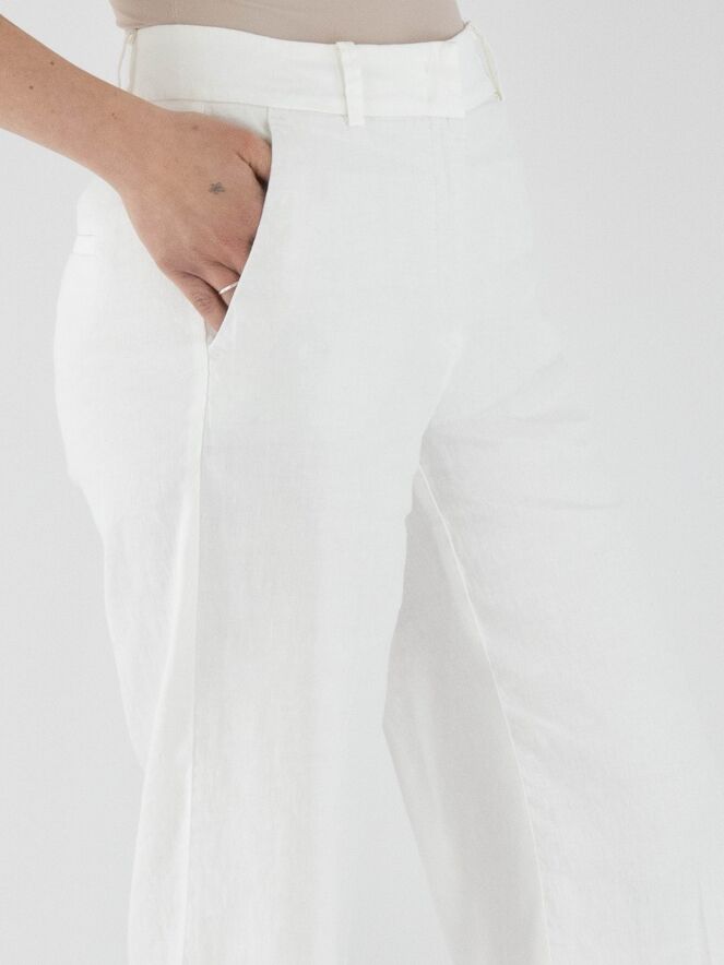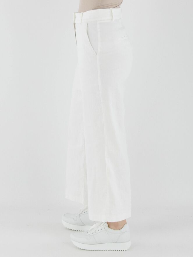 A pair of trousers from Cambio in white. A pressed crease runs down the center of the legs. The trousers have side pockets and should be hand-washed.