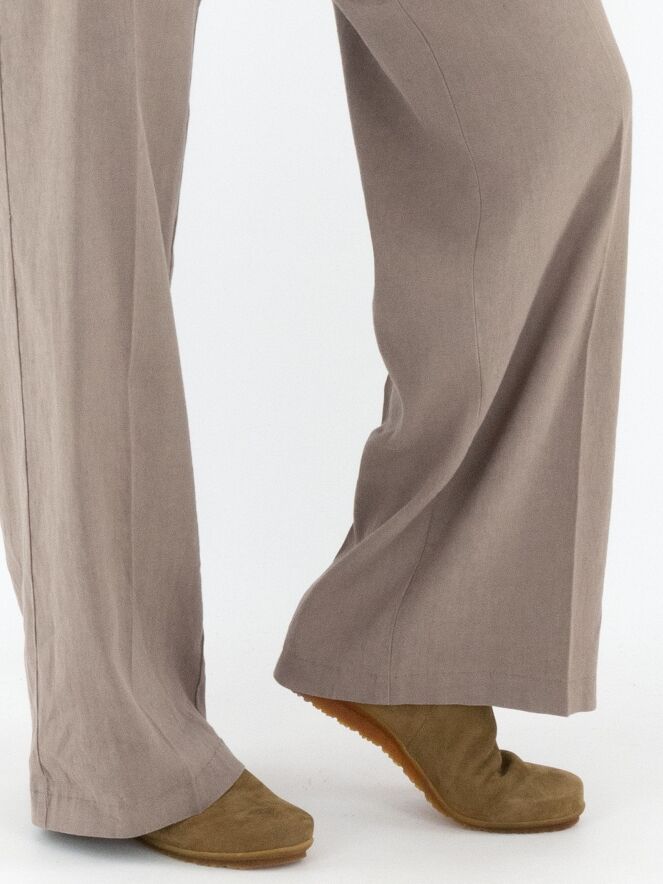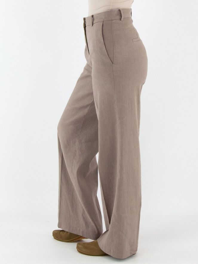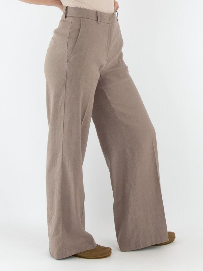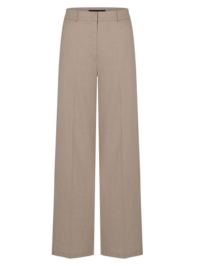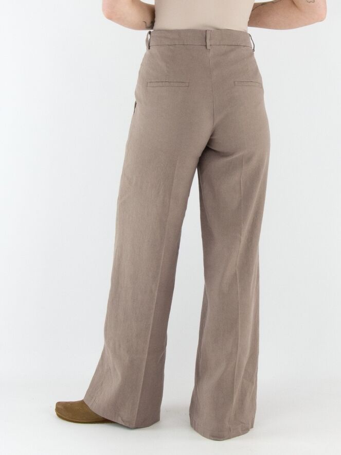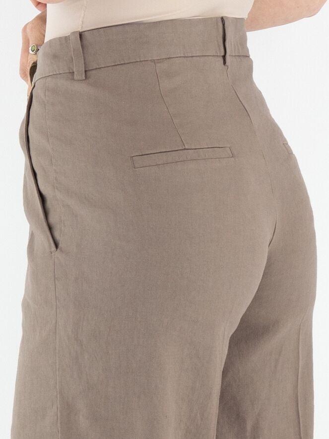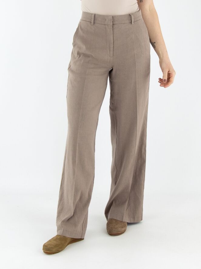 A pair of trousers from Cambio in a soft brown color. A pressed crease runs down the center of the straight-cut legs on both the front and back. The trousers have side pockets and should be hand-washed.