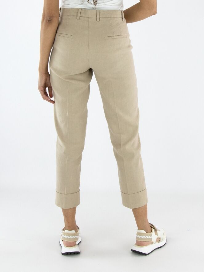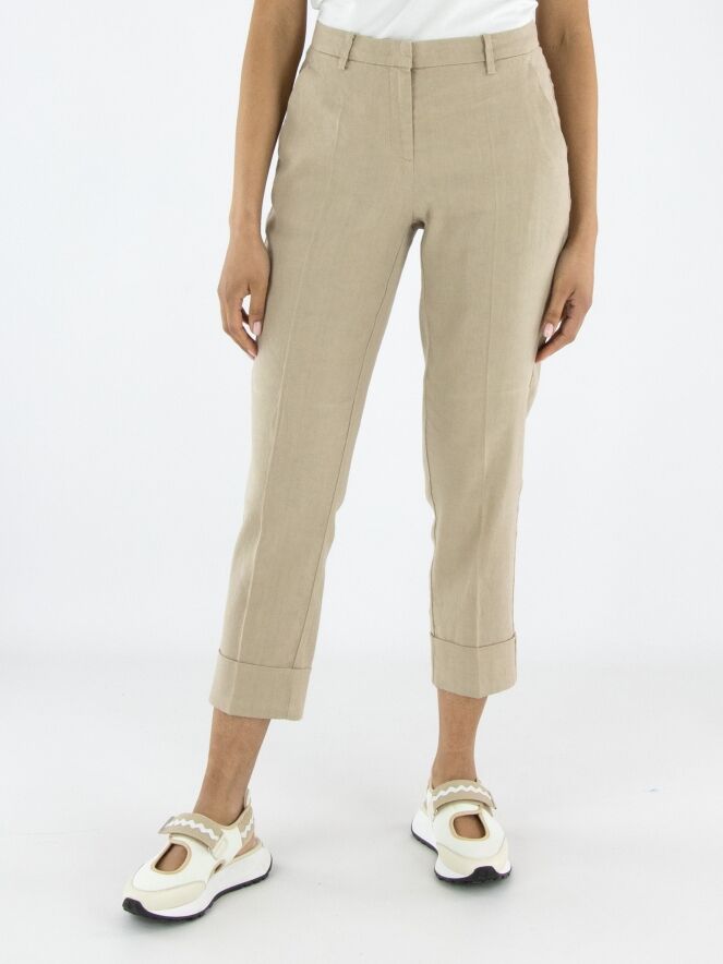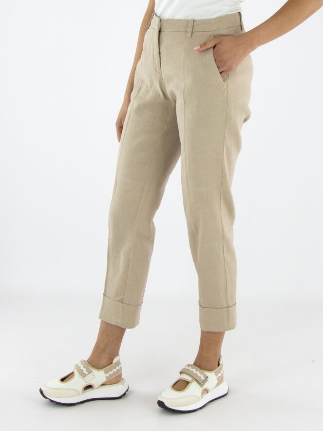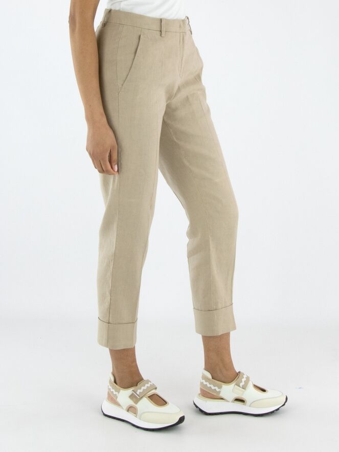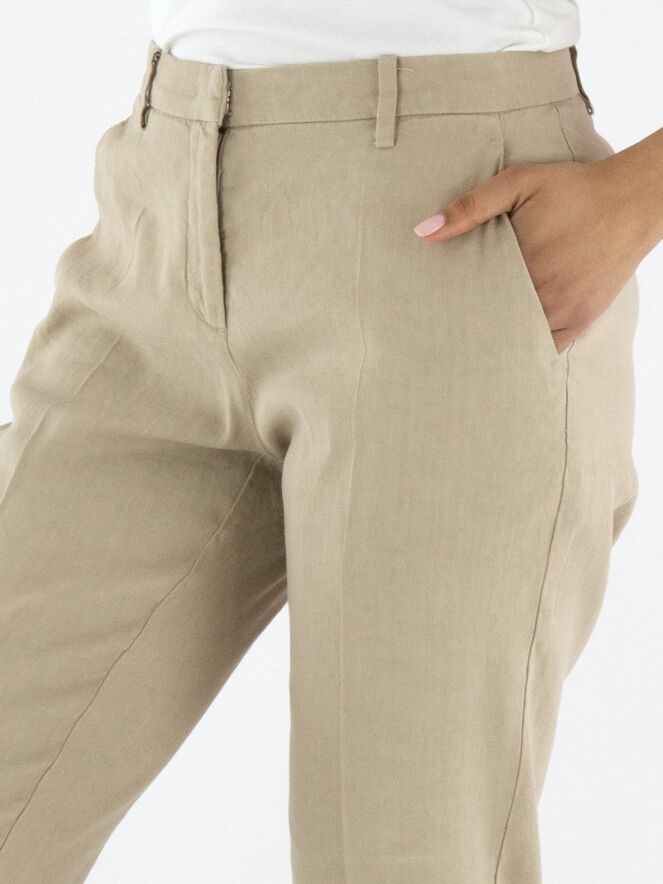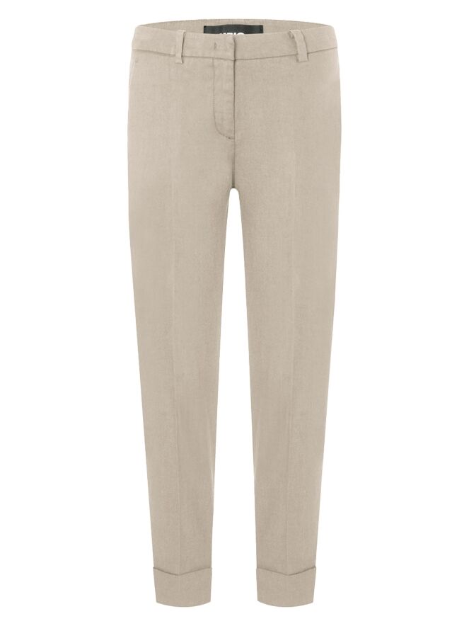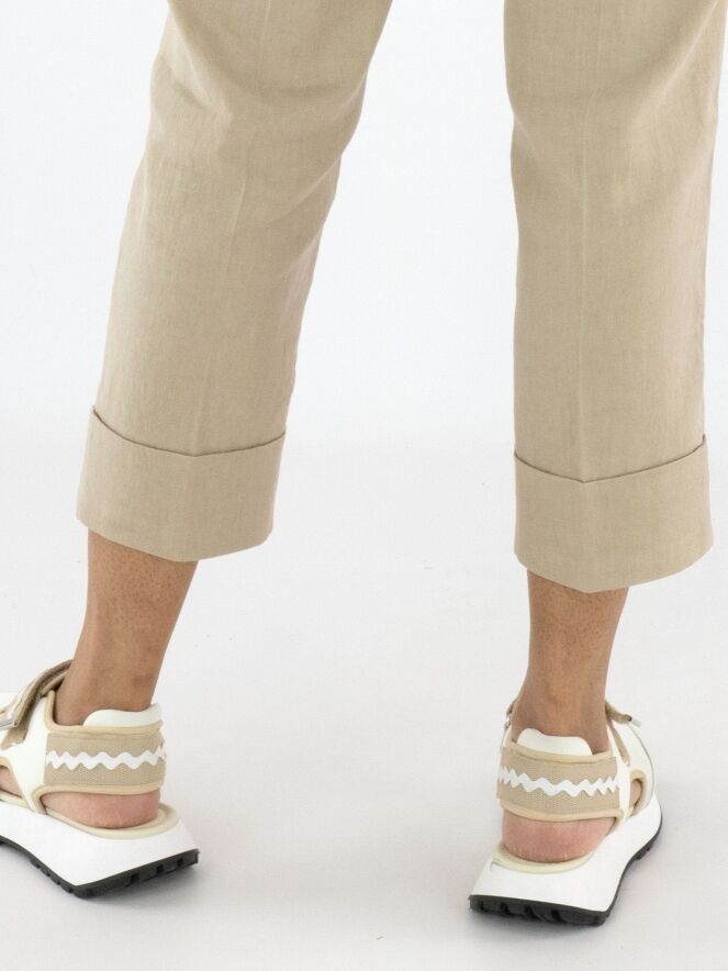 Trousers from Cambio in sand color. The trousers feature side pockets and a wide cuff at the bottom of the legs. These trousers should be hand-washed.