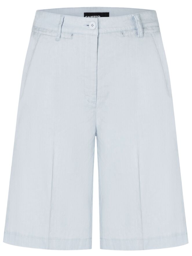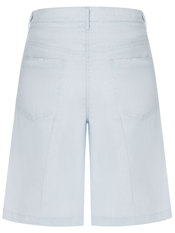 A Bermuda by Cambio in a pastel blue color. The Bermuda features side pockets and has a pressed crease in the center of the legs, both at the front and back. This garment should be hand-washed.