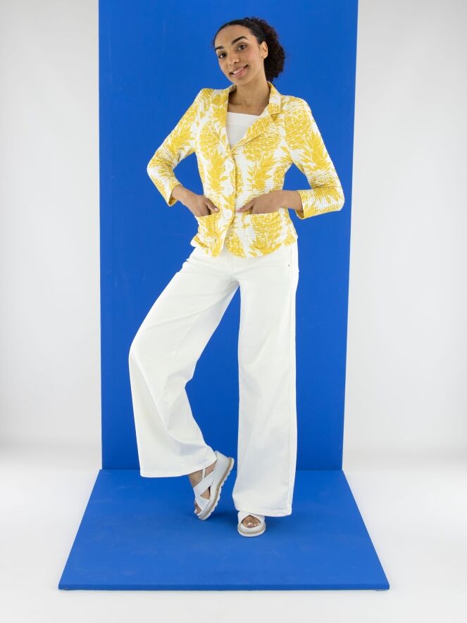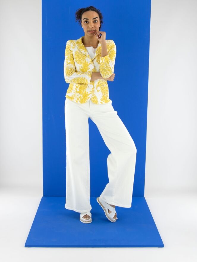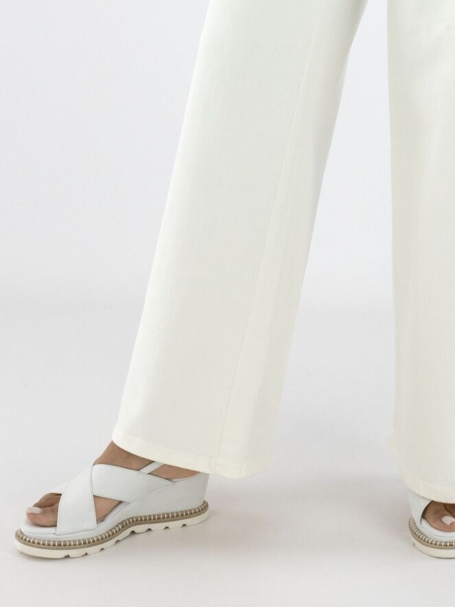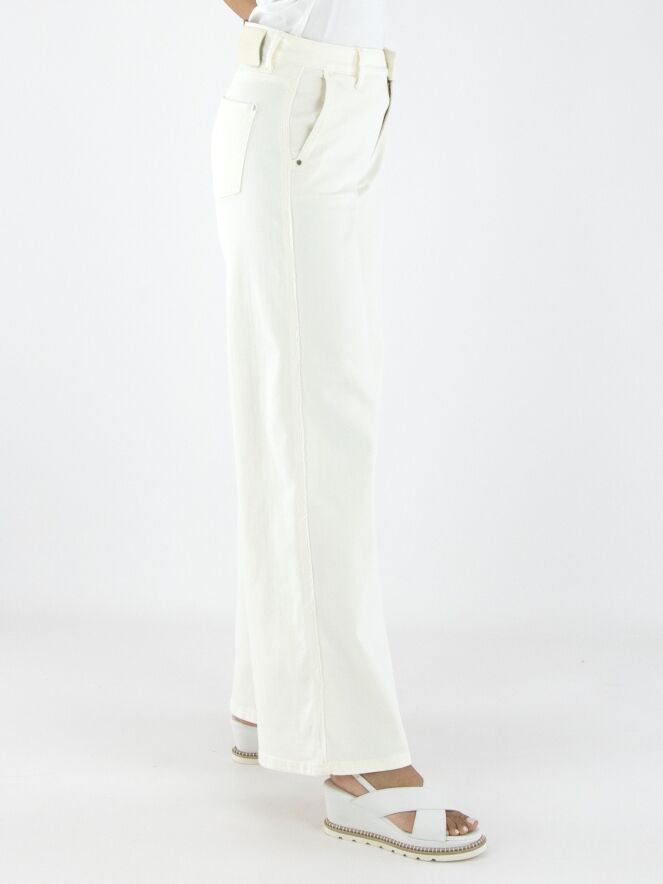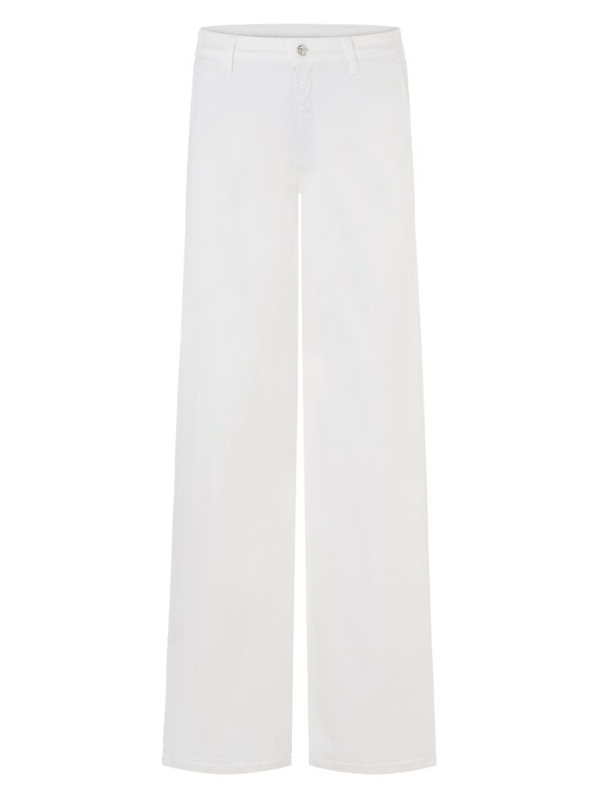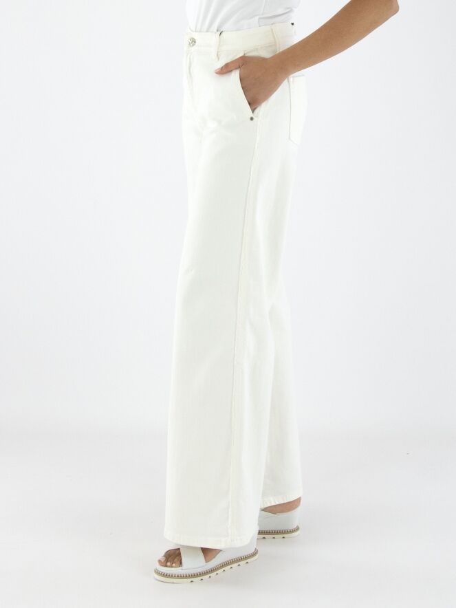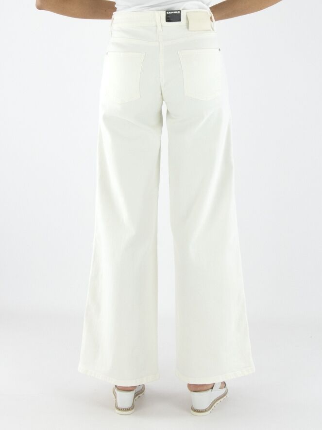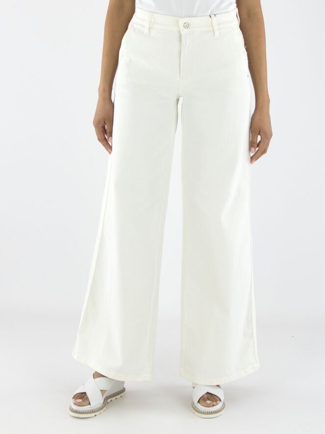 A wide-leg jeans by Cambio in an off-white color. The jeans feature side pockets, and the fabric is delicately frayed along the seam edge on the sides. These jeans can be washed at 30 degrees.