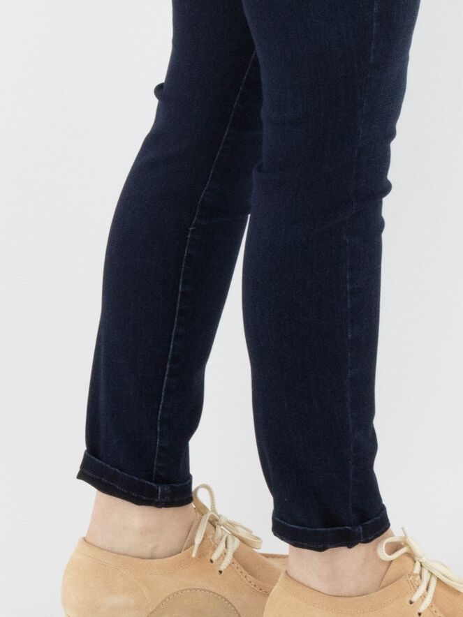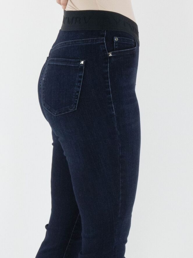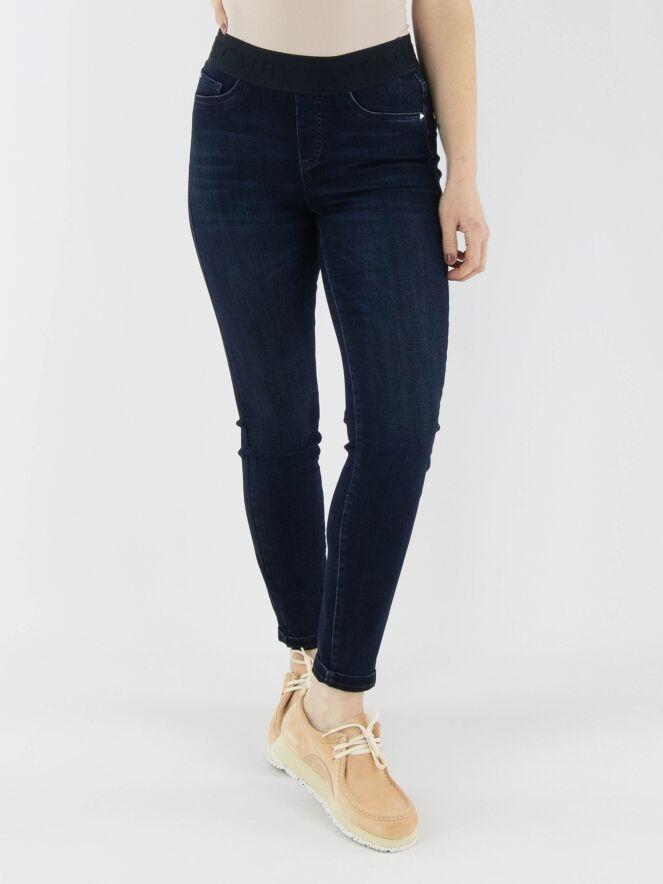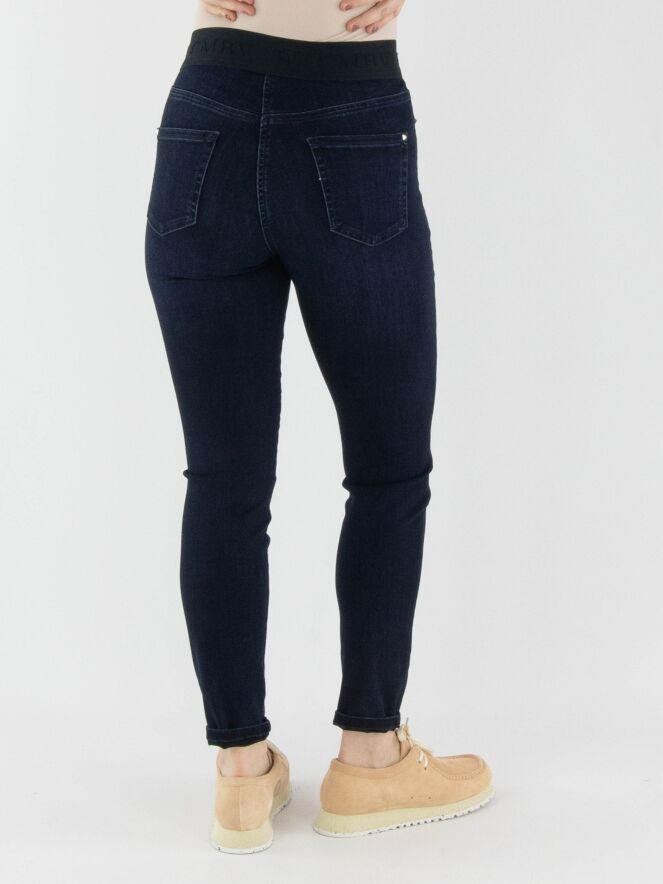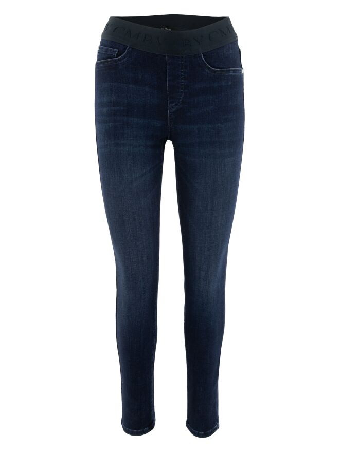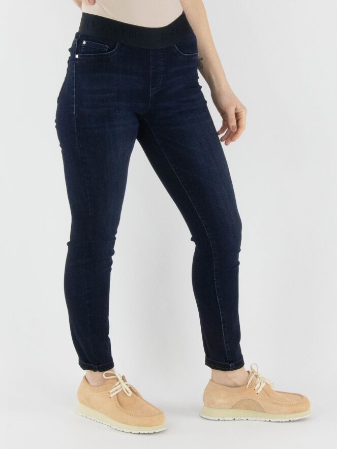 A dark denim jeans by Cambio in a deep denim color. The waistband features a black elastic band. The jeans have a 5-pocket design and can be washed at 30 degrees.
