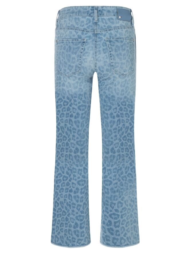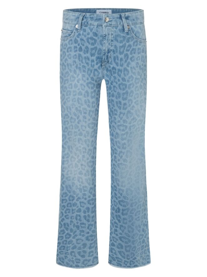 A pair of jeans from Cambio with a leopard print in various shades of denim blue. The jeans have a 5-pocket design. The hems are delicately frayed. These jeans can be washed at 30 degrees.