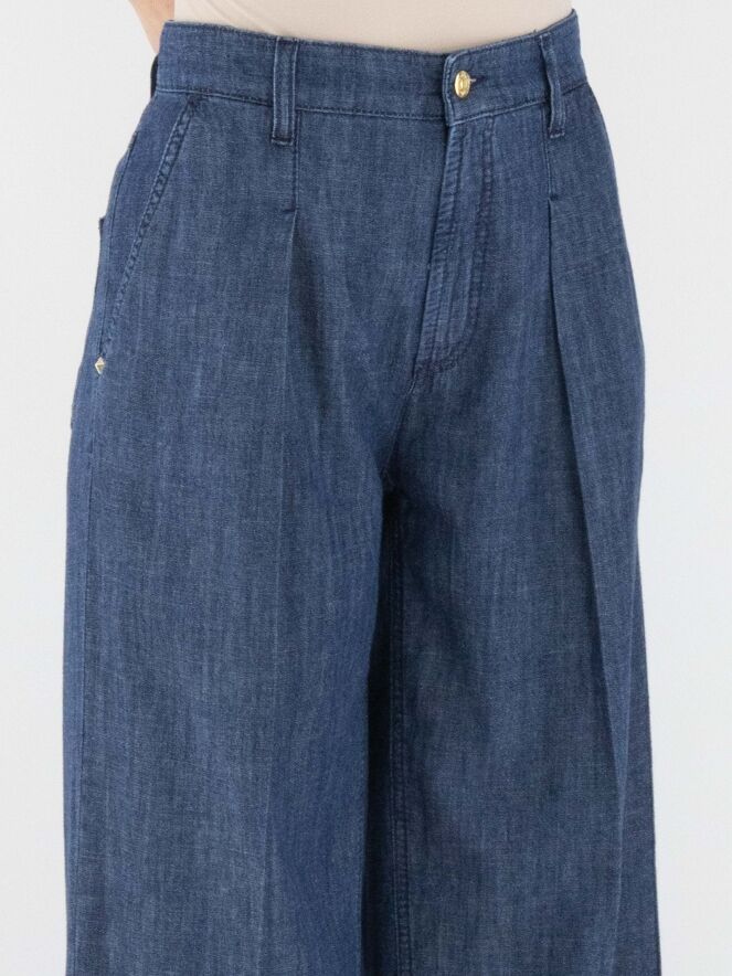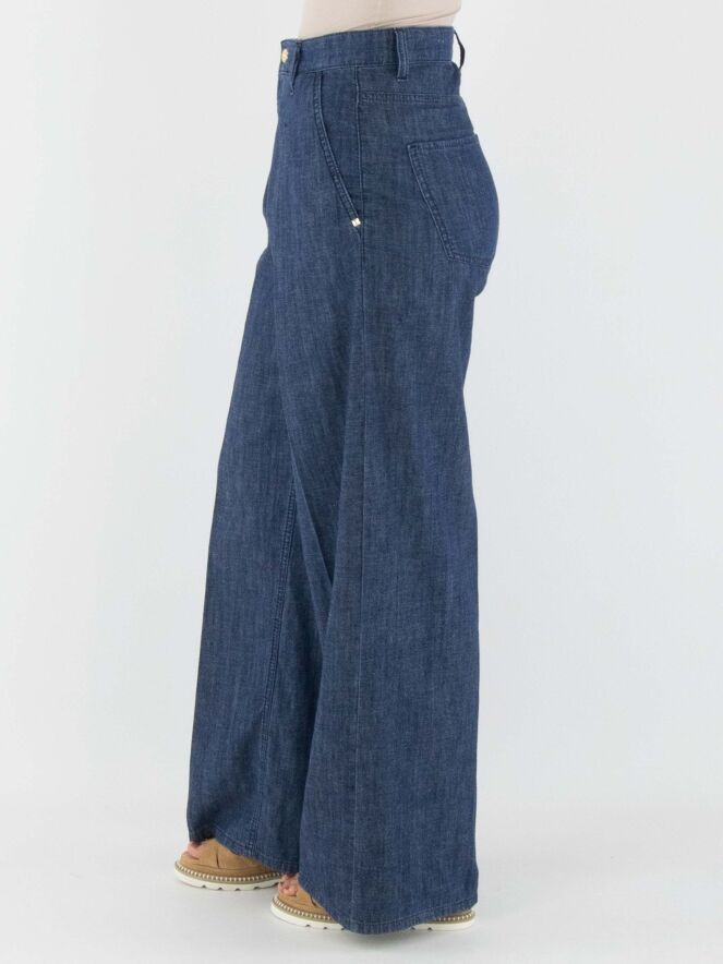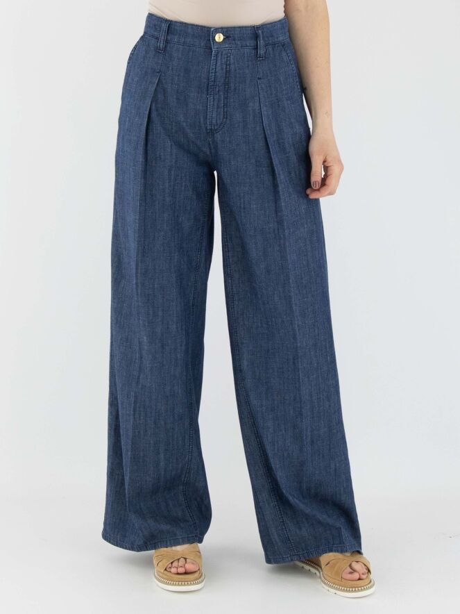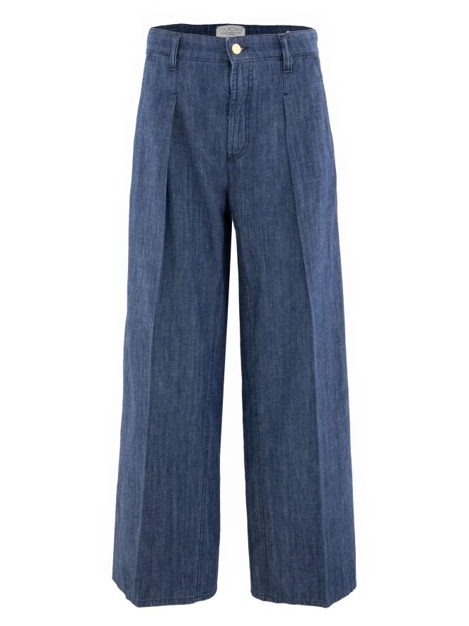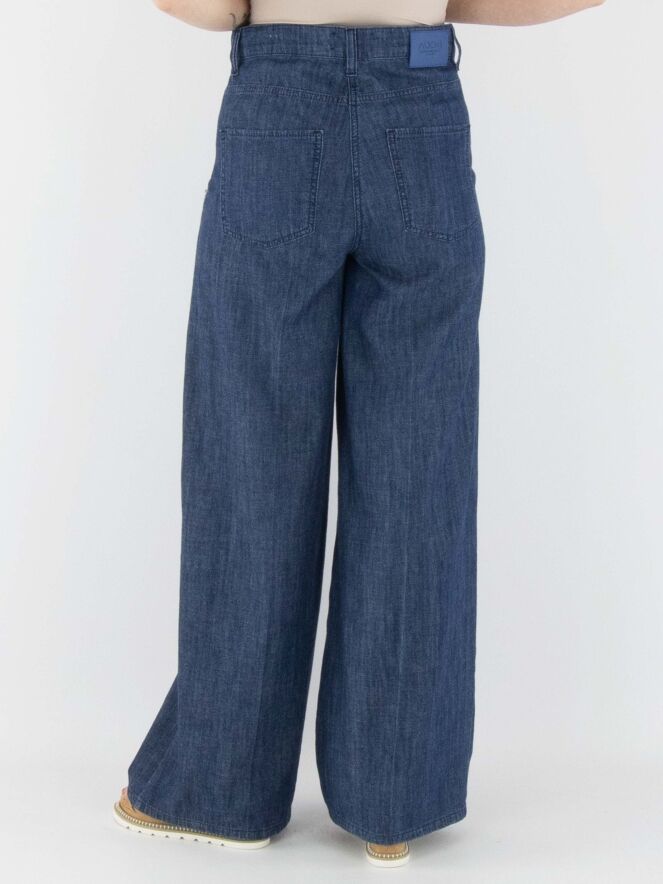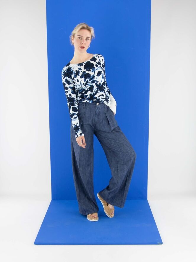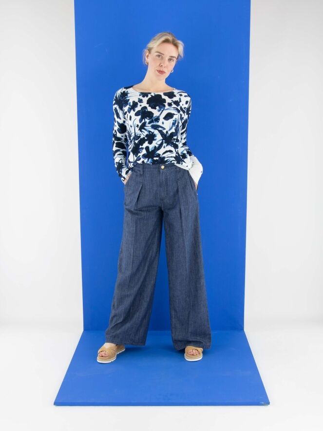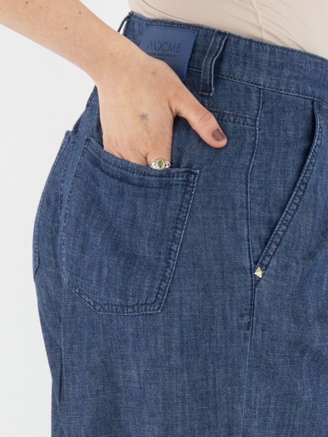 A wide, marled pair of trousers with a denim look in a denim color. The trousers feature side pockets and a pressed crease in the center of the legs. These trousers can be washed at 30 degrees.
