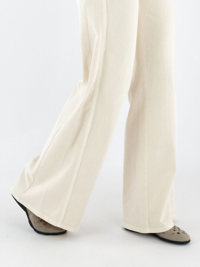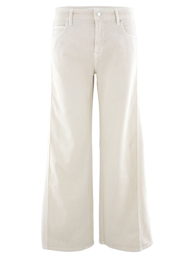 A pair of jeans by Cambio in beige. The jeans are designed in a 5-pocket style. The fabric along the side seams of the legs is delicately frayed. These jeans can be washed at 30 degrees.