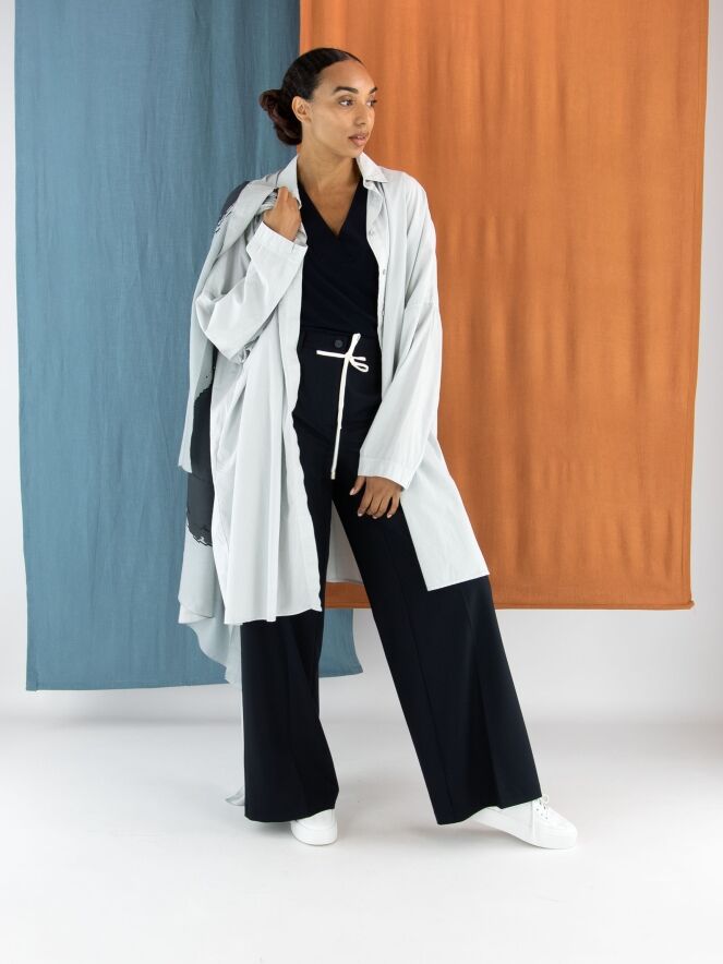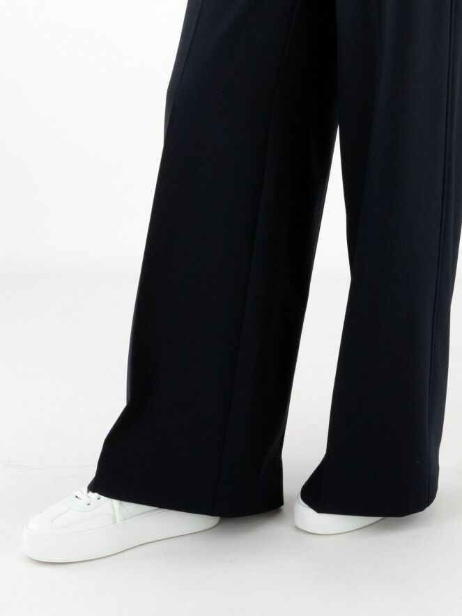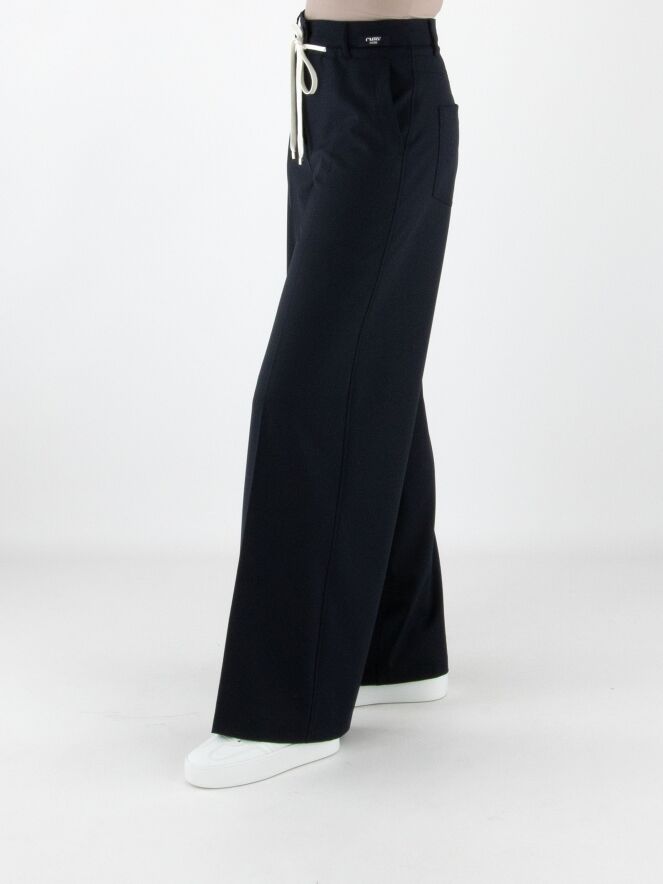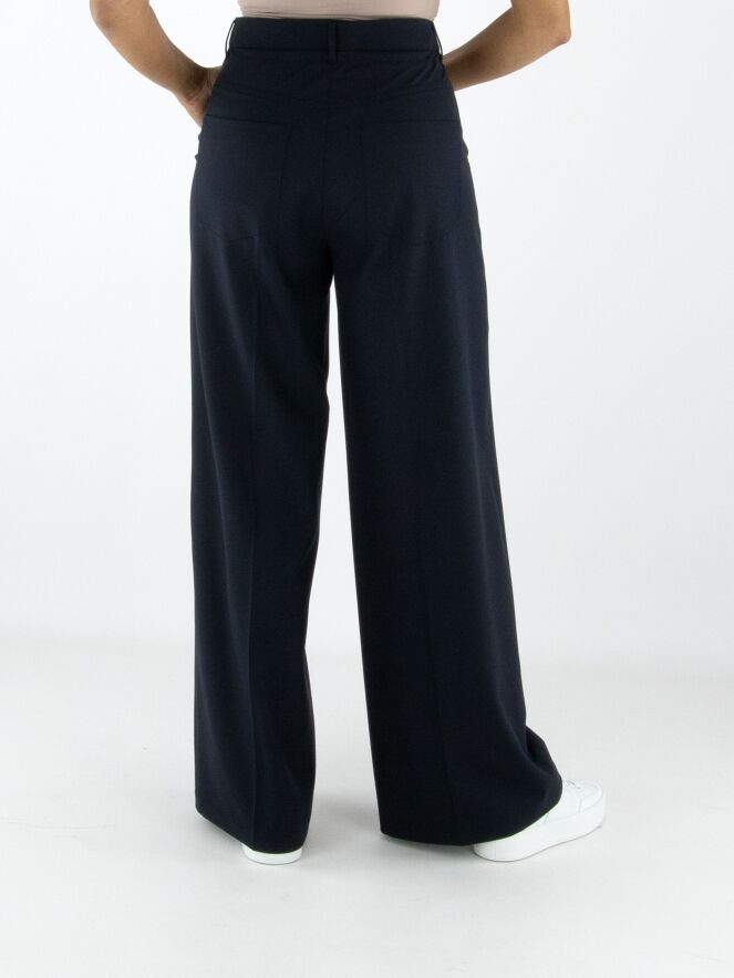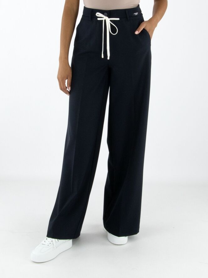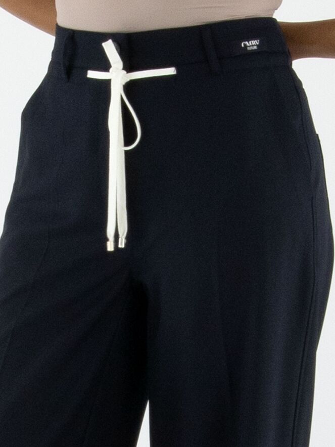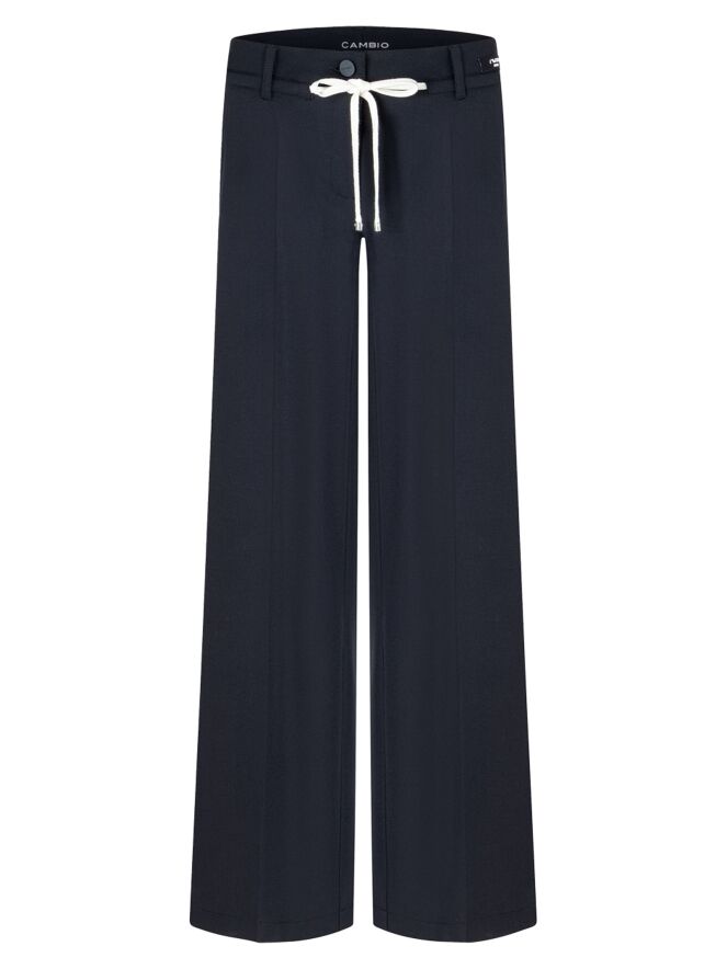 Wide-leg trousers by Cambio in a deep navy blue. The waistband features a decorative ivory-coloured ribbon in a tunnel design. A pressed crease runs down the centre of the legs. The trousers have side pockets and can be washed at 30 degrees.