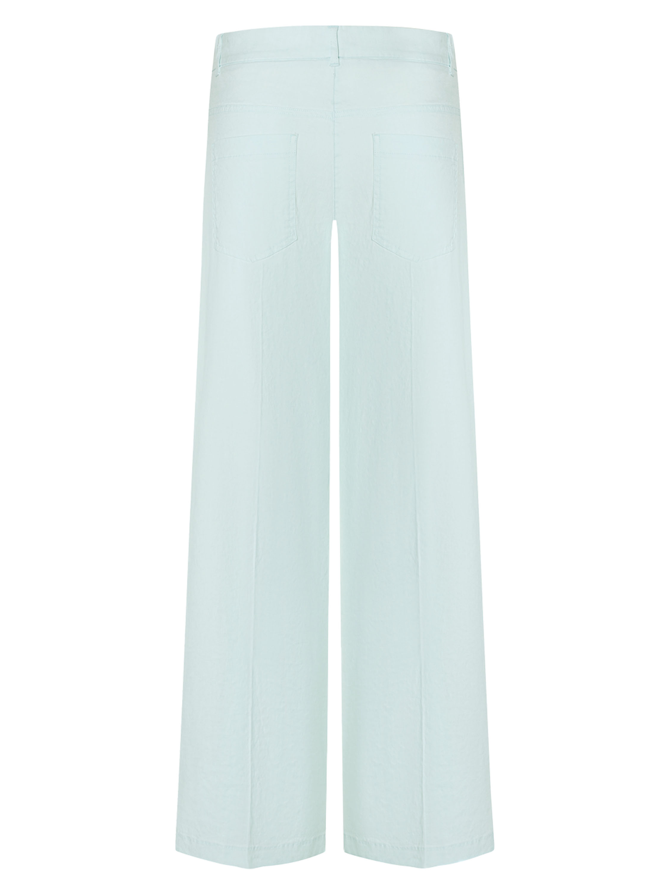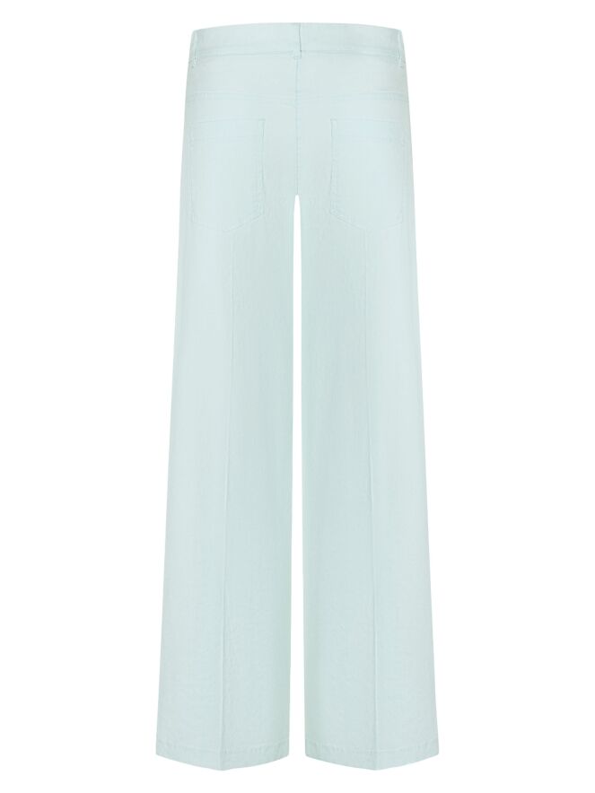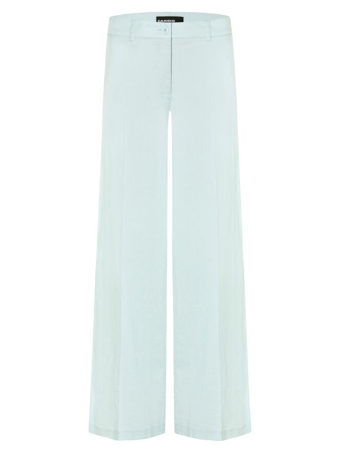 A Cambio linen trouser in a pastel light blue shade. The design features side pockets and a pressed crease running down the center of the legs for an elegant finish. This piece should be hand washed.