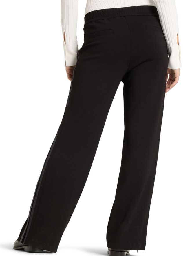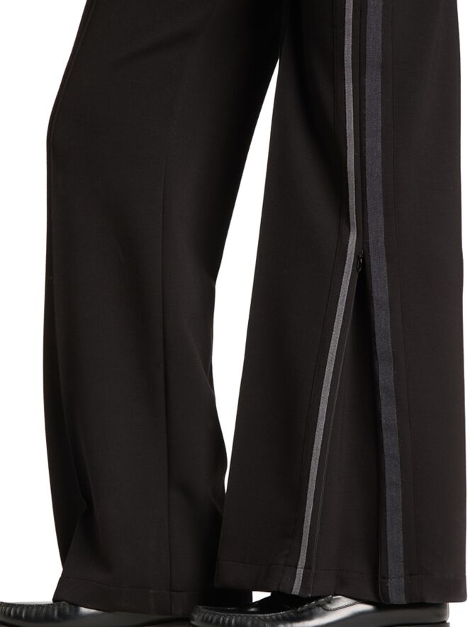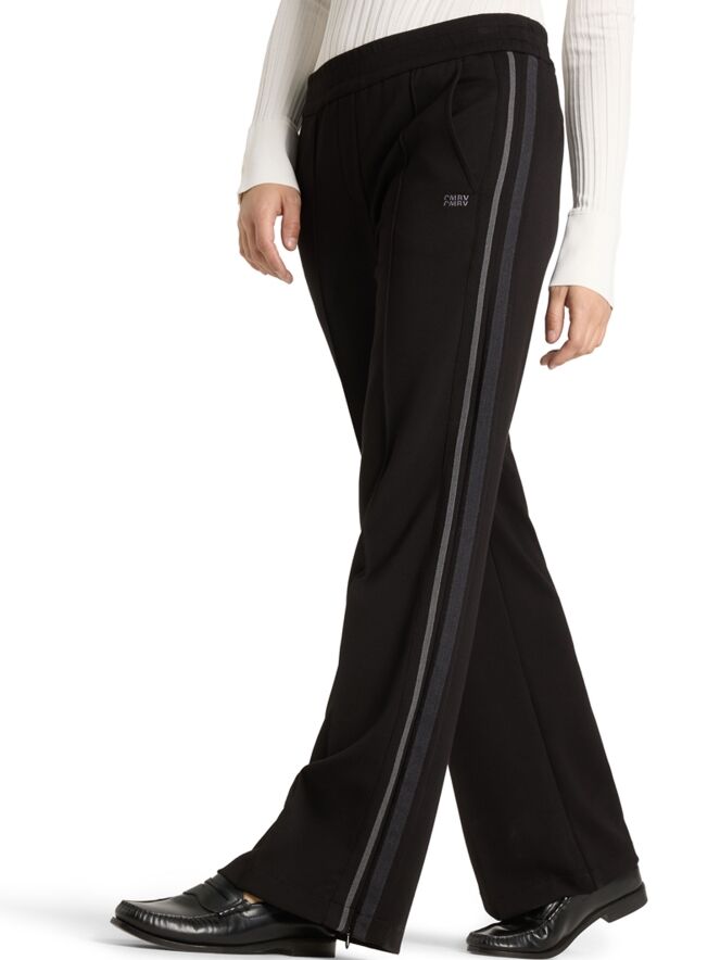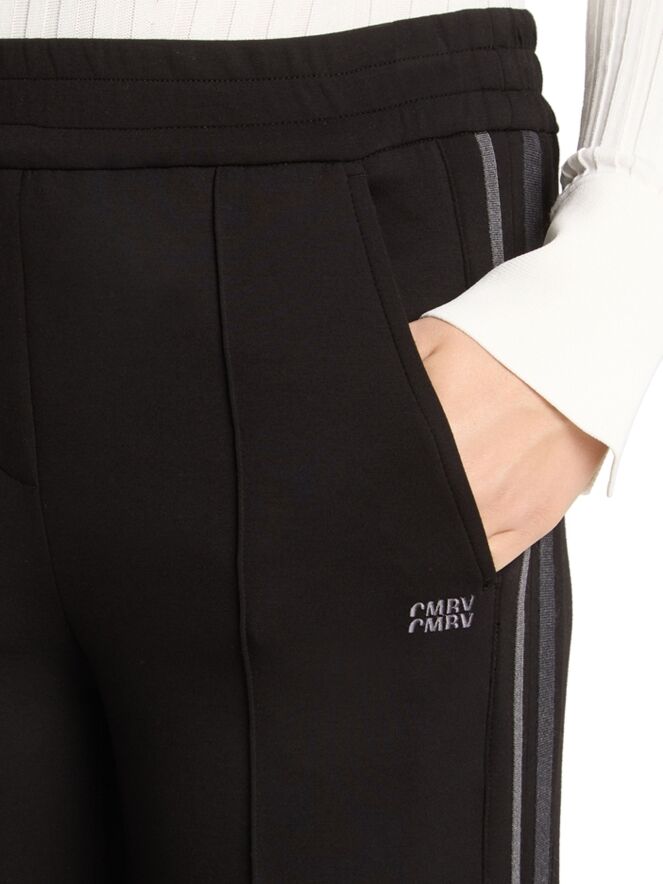 Jogging trousers by Cambio in black. The wide elastic waistband ensures extra comfort, while a double stripe in dark and light grey along the sides adds a sporty yet refined touch. Zippers at the lower legs can be opened up to the knee, allowing for a wider fit. These exclusive designer trousers should be hand-washed.