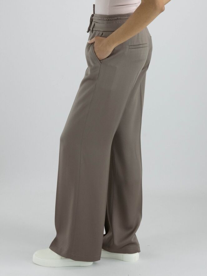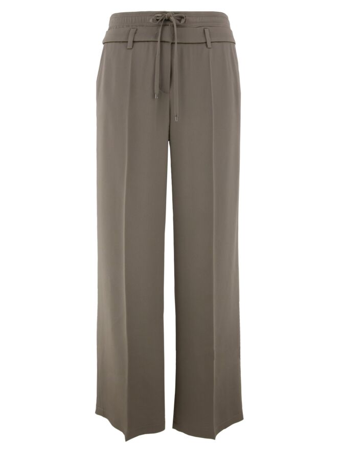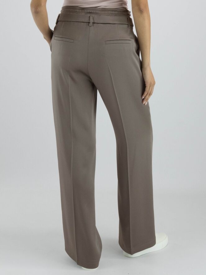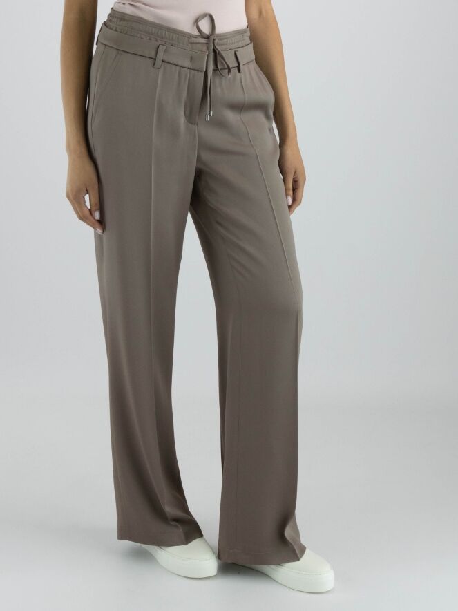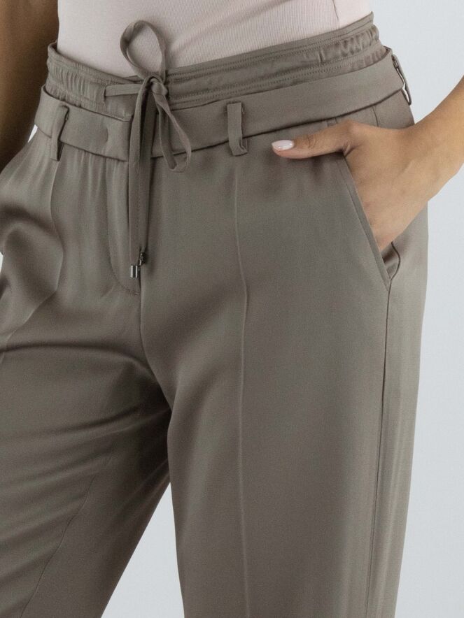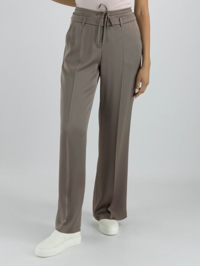 A luxurious matte satin trouser from Cambio in taupe. The waist features a drawstring in a tunnel casing. Below the waistband is a raised seam. The trousers have slash pockets and a creased pleat down the center of the legs. These trousers can be hand washed.